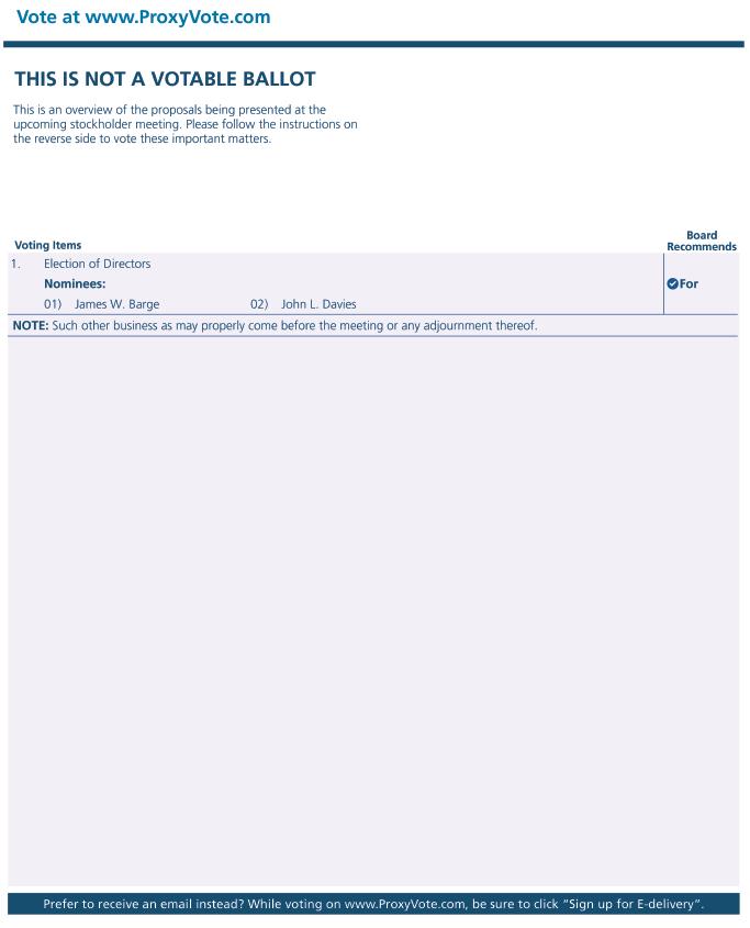 Vote at www.ProxyVote.com THIS IS NOT A VOTABLE BALLOT This is an overview of the proposals being presented at the upcoming stockholder meeting. Please follow the instructions on the reverse side to vote these important matters. Voting Items 1. Election of Directors Nominees 02) John L. Davies 01) James w. Barge NOTE: Such other business as may properly come before the meeting or any adjournment thereof. Board Recommends For Prefer to receive an email instead? While voting on www.proxyvote.com, be sure to click “sign up for E-delivery”.