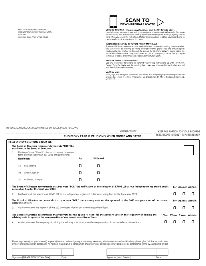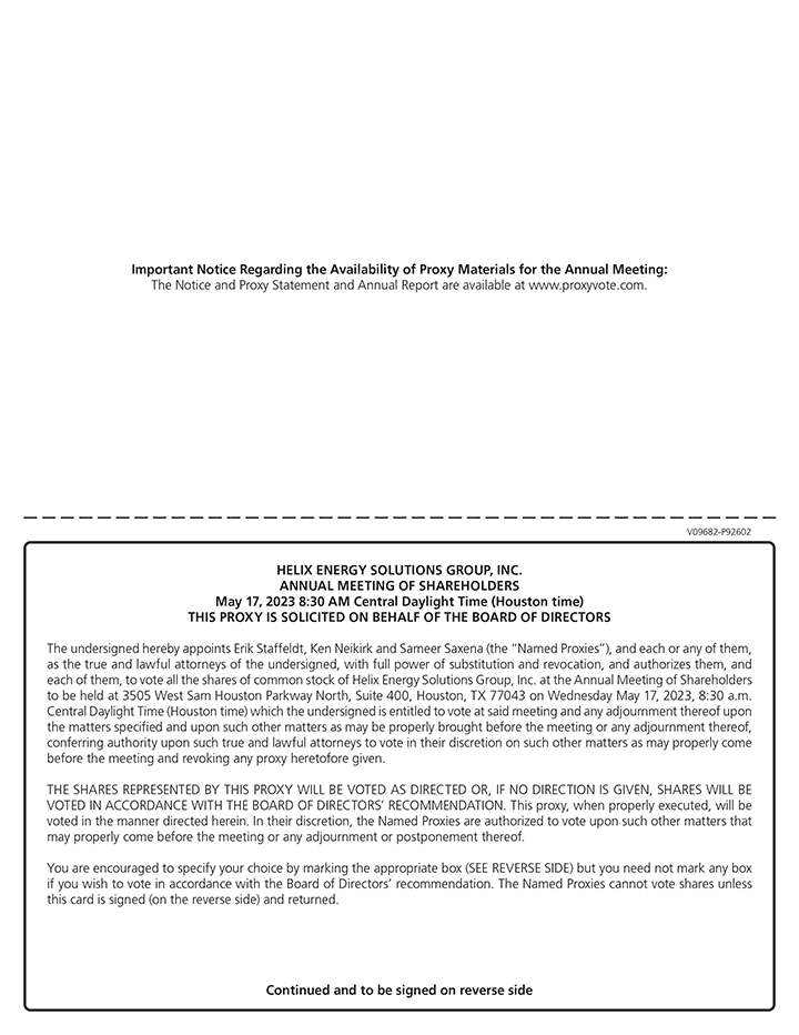 Important notice regarding the availability of proxy materials for the Annual Meeting of Shareholders to be held on May 17, 2023 The Helix Energy Solutions Group, Inc. 2023 Proxy Statement and Annual Report to Shareholders (including our Annual Report on Form 10-K) for the fiscal year ended December 31, 2022 are available electronically at www.helixesg.com/annualmeeting |