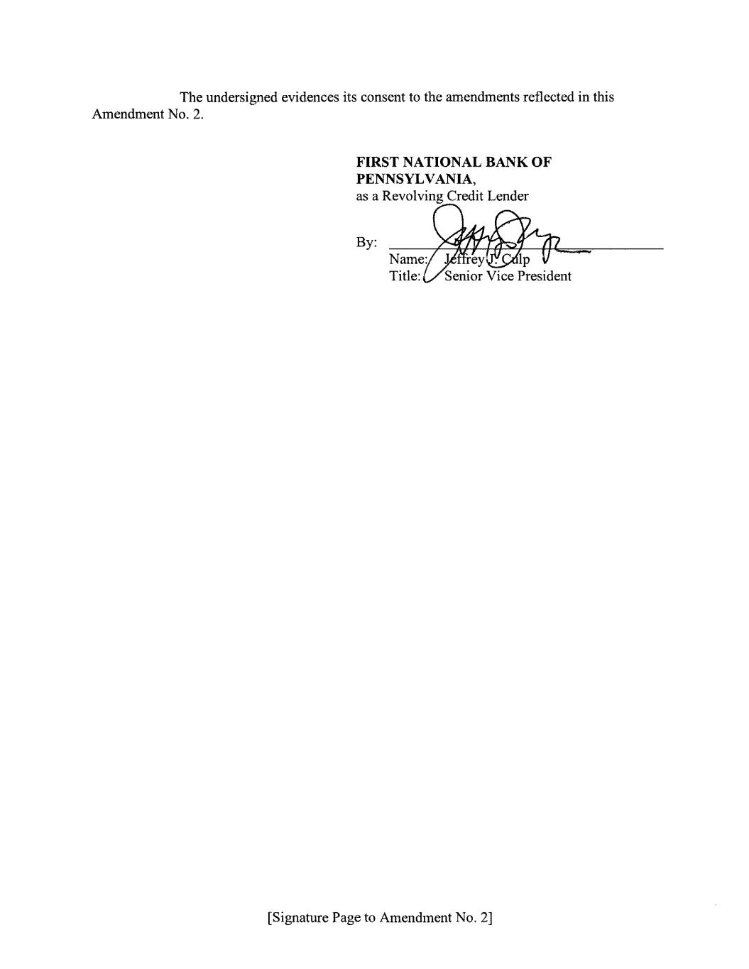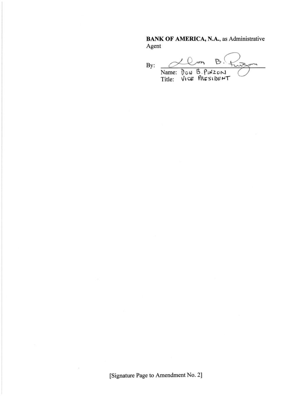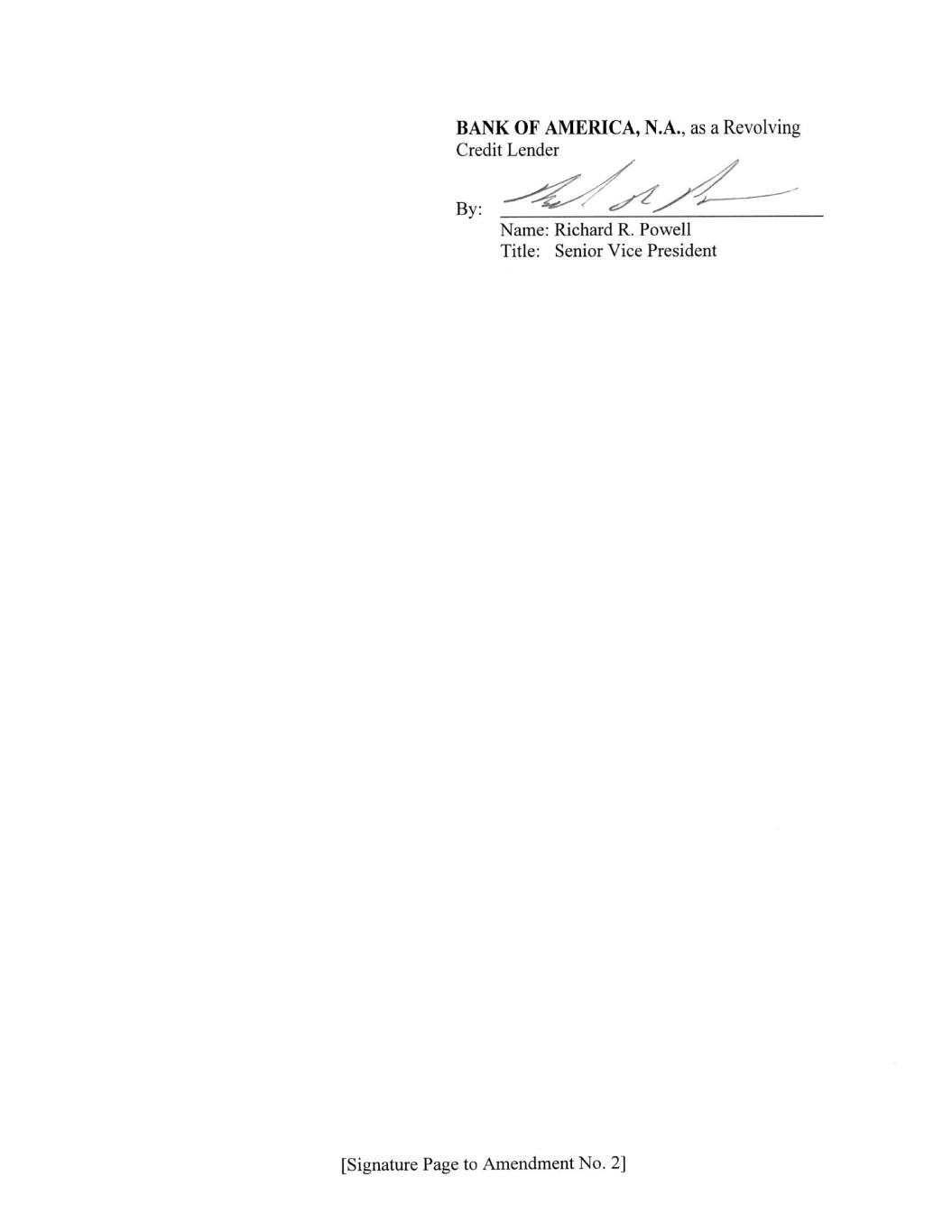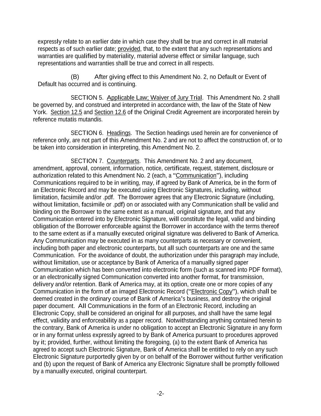 -2- expressly relate to an earlier date in which case they shall be true and correct in all material respects as of such earlier date; provided, that, to the extent that any such representations and warranties are qualified by materiality, material adverse effect or similar language, such representations and warranties shall be true and correct in all respects. (B) After giving effect to this Amendment No. 2, no Default or Event of Default has occurred and is continuing. SECTION 5. Applicable Law; Waiver of Jury Trial. This Amendment No. 2 shall be governed by, and construed and interpreted in accordance with, the law of the State of New York. Section 12.5 and Section 12.6 of the Original Credit Agreement are incorporated herein by reference mutatis mutandis. SECTION 6. Headings. The Section headings used herein are for convenience of reference only, are not part of this Amendment No. 2 and are not to affect the construction of, or to be taken into consideration in interpreting, this Amendment No. 2. SECTION 7. Counterparts. This Amendment No. 2 and any document, amendment, approval, consent, information, notice, certificate, request, statement, disclosure or authorization related to this Amendment No. 2 (each, a “Communication”), including Communications required to be in writing, may, if agreed by Bank of America, be in the form of an Electronic Record and may be executed using Electronic Signatures, including, without limitation, facsimile and/or .pdf. The Borrower agrees that any Electronic Signature (including, without limitation, facsimile or .pdf) on or associated with any Communication shall be valid and binding on the Borrower to the same extent as a manual, original signature, and that any Communication entered into by Electronic Signature, will constitute the legal, valid and binding obligation of the Borrower enforceable against the Borrower in accordance with the terms thereof to the same extent as if a manually executed original signature was delivered to Bank of America. Any Communication may be executed in as many counterparts as necessary or convenient, including both paper and electronic counterparts, but all such counterparts are one and the same Communication. For the avoidance of doubt, the authorization under this paragraph may include, without limitation, use or acceptance by Bank of America of a manually signed paper Communication which has been converted into electronic form (such as scanned into PDF format), or an electronically signed Communication converted into another format, for transmission, delivery and/or retention. Bank of America may, at its option, create one or more copies of any Communication in the form of an imaged Electronic Record (“Electronic Copy”), which shall be deemed created in the ordinary course of Bank of America’s business, and destroy the original paper document. All Communications in the form of an Electronic Record, including an Electronic Copy, shall be considered an original for all purposes, and shall have the same legal effect, validity and enforceability as a paper record. Notwithstanding anything contained herein to the contrary, Bank of America is under no obligation to accept an Electronic Signature in any form or in any format unless expressly agreed to by Bank of America pursuant to procedures approved by it; provided, further, without limiting the foregoing, (a) to the extent Bank of America has agreed to accept such Electronic Signature, Bank of America shall be entitled to rely on any such Electronic Signature purportedly given by or on behalf of the Borrower without further verification and (b) upon the request of Bank of America any Electronic Signature shall be promptly followed by a manually executed, original counterpart.