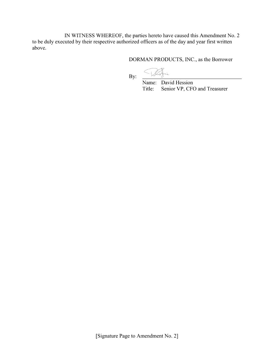 Execution Version AMENDMENT NO. 2, dated as of July 1, 2024 (this “Amendment No. 2), to the Credit Agreement, dated as of August 10, 2021 (as amended by Amendment No. 1, dated as of October 4, 2022, and as further amended, restated, amended and restated, supplemented or otherwise modified from time to time, the “Original Credit Agreement”), by and among DORMAN PRODUCTS, INC., a Pennsylvania corporation (the “Borrower”), the REVOLVING CREDIT LENDERS and BANK OF AMERICA, N.A., a national banking association, as Administrative Agent (the “Administrative Agent”). WHEREAS, in accordance with Section 12.2 of the Original Credit Agreement, the Borrower has requested, and the Revolving Credit Lenders party hereto, constituting all Revolving Credit Lenders have agreed, to amend the Original Credit Agreement as set forth in Section 2 hereof. NOW, THEREFORE, in consideration of the promises and mutual agreements herein contained, the Borrower, the Revolving Credit Lenders party hereto, constituting all Revolving Credit Lenders and the Administrative Agent hereby agree as follows: SECTION 1. Defined Terms. Capitalized terms used but not defined herein shall have the meanings assigned to such terms in the Credit Agreement (as defined below). SECTION 2. Amendments. The Original Credit Agreement is, effective as of the Amendment No. 2 Effective Date, hereby amended to delete the stricken text (indicated textually in the same manner as the following example: stricken text) and to add the double-underlined text (indicated textually in the same manner as the following example: double-underlined text) as set forth in the pages of the Credit Agreement attached as Exhibit A hereto (the “Credit Agreement”). SECTION 3. Effectiveness of Amendment No. 2. The obligation of the Revolving Credit Lenders to consummate this Amendment No. 2 is subject to the satisfaction of each of the following conditions and this Amendment No. 2 shall become effective on the date on which each such condition is satisfied (the “Amendment No. 2 Effective Date”): (a) Executed Amendment. The Administrative Agent shall have received executed counterparts to this Amendment No. 2 from the Borrower and each of the Revolving Credit Lenders. (b) Payment at Closing. All fees and expenses due to the Administrative Agent and the Revolving Credit Lenders required to be paid on the Amendment No. 2 Effective Date (including the fees and expenses of counsel for the Administrative Agent) will have been or, substantially concurrently with the Amendment No. 2 Effective Date, will be, paid. SECTION 4. Representations and Warranties. The Borrower represents and warrants, as of the Amendment No. 2 Effective Date, to the Administrative Agent and each Revolving Credit Lender party hereto that: (A) The representations and warranties of each Credit Party set forth in the Credit Agreement and Loan Documents are, after giving effect to hereto, true and correct in all material respects on and as of the Amendment No. 2 Effective Date with the same effect as though made on and as of such date, except to the extent such representations and warranties