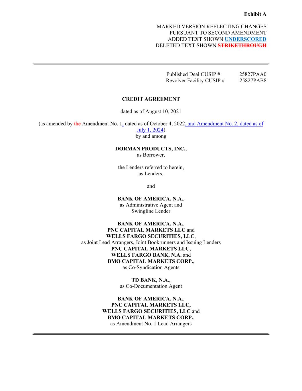Exhibit AMARKED VERSION REFLECTING CHANGESPURSUANT TO SECOND AMENDMENTADDED TEXT SHOWN UNDERSCOREDDELETED TEXT SHOWN STRIKETHROUGHPublished Deal CUSIP # 25827PAA0Revolver Facility CUSIP # 25827PAB8CREDIT AGREEMENTdated as of August 10, 2021(as amended by the Amendment No. 1, dated as of October 4, 2022, and Amendment No. 2, dated as ofJuly 1, 2024)by and amongDORMAN PRODUCTS, INC.,as Borrower,the Lenders referred to herein,as Lenders,andBANK OF AMERICA, N.A.,as Administrative Agent andSwingline LenderBANK OF AMERICA, N.A.,PNC CAPITAL MARKETS LLC andWELLS FARGO SECURITIES, LLC,as Joint Lead Arrangers, Joint Bookrunners and Issuing LendersPNC CAPITAL MARKETS LLC,WELLS FARGO BANK, N.A. andBMO CAPITAL MARKETS CORP.,as Co-Syndication AgentsTD BANK, N.A.,as Co-Documentation AgentBANK OF AMERICA, N.A.,PNC CAPITAL MARKETS LLC,WELLS FARGO SECURITIES, LLC andBMO CAPITAL MARKETS CORP.,as Amendment No. 1 Lead Arrangers