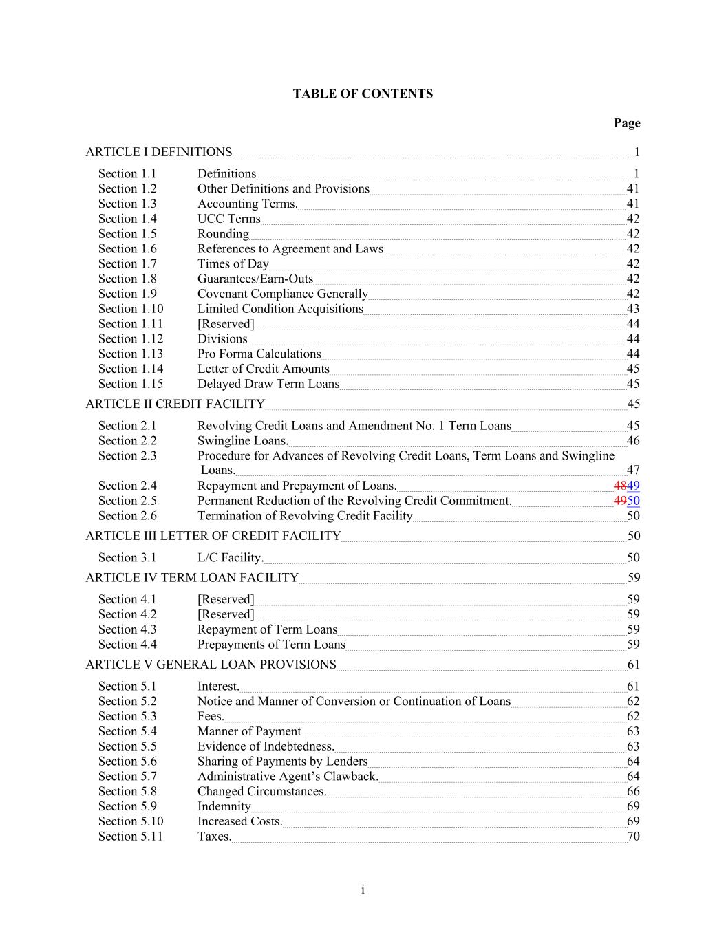 TABLE OF CONTENTS PageARTICLE I DEFINITIONS 1Section 1.1 Definitions 1Section 1.2 Other Definitions and Provisions 41Section 1.3 Accounting Terms. 41Section 1.4 UCC Terms 42Section 1.5 Rounding 42Section 1.6 References to Agreement and Laws 42Section 1.7 Times of Day 42Section 1.8 Guarantees/Earn-Outs 42Section 1.9 Covenant Compliance Generally 42Section 1.10 Limited Condition Acquisitions 43Section 1.11 [Reserved] 44Section 1.12 Divisions 44Section 1.13 Pro Forma Calculations 44Section 1.14 Letter of Credit Amounts 45Section 1.15 Delayed Draw Term Loans 45ARTICLE II CREDIT FACILITY 45Section 2.1 Revolving Credit Loans and Amendment No. 1 Term Loans 45Section 2.2 Swingline Loans. 46Section 2.3 Procedure for Advances of Revolving Credit Loans, Term Loans and SwinglineLoans. 47Section 2.4 Repayment and Prepayment of Loans. 4849Section 2.5 Permanent Reduction of the Revolving Credit Commitment. 4950Section 2.6 Termination of Revolving Credit Facility 50ARTICLE III LETTER OF CREDIT FACILITY 50Section 3.1 L/C Facility. 50ARTICLE IV TERM LOAN FACILITY 59Section 4.1 [Reserved] 59Section 4.2 [Reserved] 59Section 4.3 Repayment of Term Loans 59Section 4.4 Prepayments of Term Loans 59ARTICLE V GENERAL LOAN PROVISIONS 61Section 5.1 Interest. 61Section 5.2 Notice and Manner of Conversion or Continuation of Loans 62Section 5.3 Fees. 62Section 5.4 Manner of Payment 63Section 5.5 Evidence of Indebtedness. 63Section 5.6 Sharing of Payments by Lenders 64Section 5.7 Administrative Agent’s Clawback. 64Section 5.8 Changed Circumstances. 66Section 5.9 Indemnity 69Section 5.10 Increased Costs. 69Section 5.11 Taxes. 70i