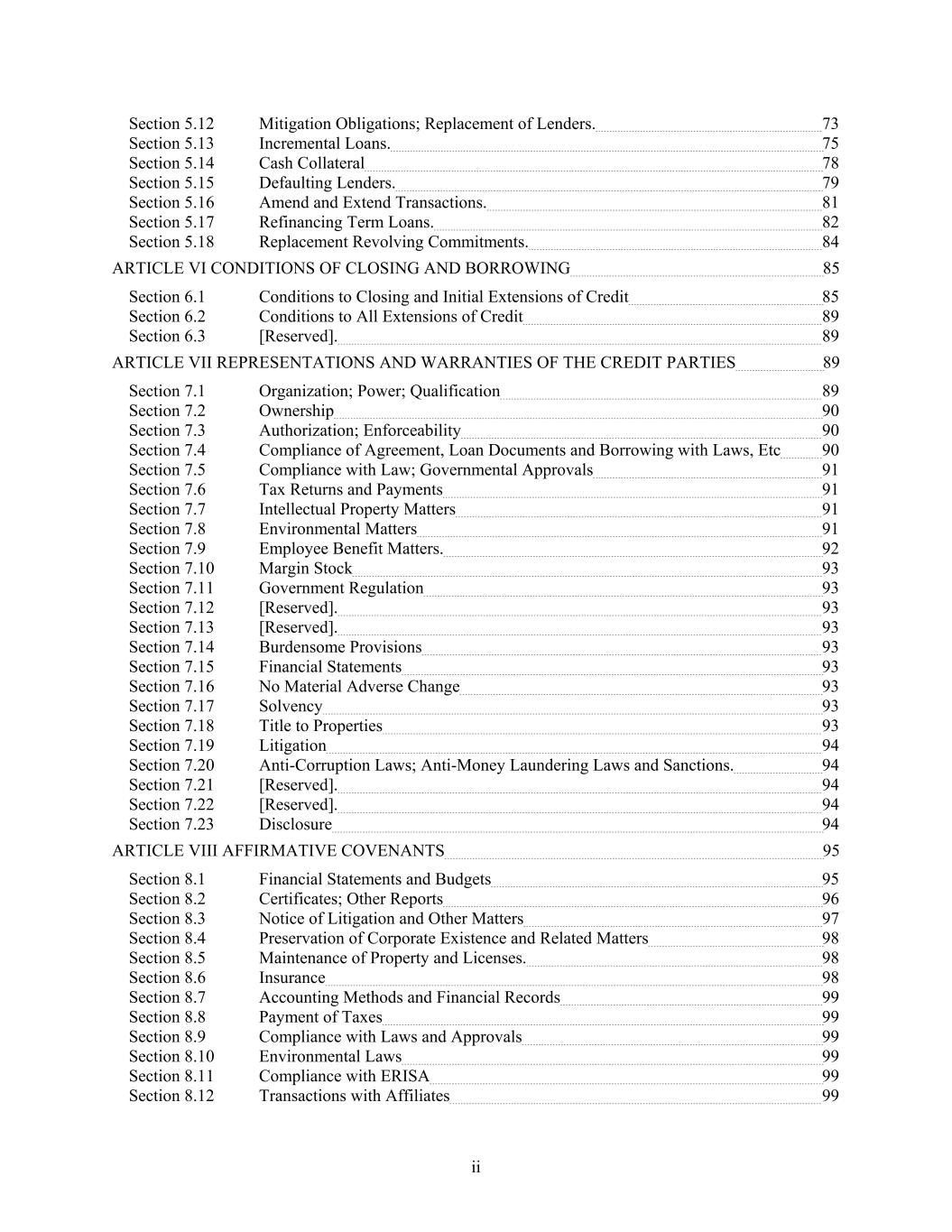 Section 5.12 Mitigation Obligations; Replacement of Lenders. 73Section 5.13 Incremental Loans. 75Section 5.14 Cash Collateral 78Section 5.15 Defaulting Lenders. 79Section 5.16 Amend and Extend Transactions. 81Section 5.17 Refinancing Term Loans. 82Section 5.18 Replacement Revolving Commitments. 84ARTICLE VI CONDITIONS OF CLOSING AND BORROWING 85Section 6.1 Conditions to Closing and Initial Extensions of Credit 85Section 6.2 Conditions to All Extensions of Credit 89Section 6.3 [Reserved]. 89ARTICLE VII REPRESENTATIONS AND WARRANTIES OF THE CREDIT PARTIES 89Section 7.1 Organization; Power; Qualification 89Section 7.2 Ownership 90Section 7.3 Authorization; Enforceability 90Section 7.4 Compliance of Agreement, Loan Documents and Borrowing with Laws, Etc 90Section 7.5 Compliance with Law; Governmental Approvals 91Section 7.6 Tax Returns and Payments 91Section 7.7 Intellectual Property Matters 91Section 7.8 Environmental Matters 91Section 7.9 Employee Benefit Matters. 92Section 7.10 Margin Stock 93Section 7.11 Government Regulation 93Section 7.12 [Reserved]. 93Section 7.13 [Reserved]. 93Section 7.14 Burdensome Provisions 93Section 7.15 Financial Statements 93Section 7.16 No Material Adverse Change 93Section 7.17 Solvency 93Section 7.18 Title to Properties 93Section 7.19 Litigation 94Section 7.20 Anti-Corruption Laws; Anti-Money Laundering Laws and Sanctions. 94Section 7.21 [Reserved]. 94Section 7.22 [Reserved]. 94Section 7.23 Disclosure 94ARTICLE VIII AFFIRMATIVE COVENANTS 95Section 8.1 Financial Statements and Budgets 95Section 8.2 Certificates; Other Reports 96Section 8.3 Notice of Litigation and Other Matters 97Section 8.4 Preservation of Corporate Existence and Related Matters 98Section 8.5 Maintenance of Property and Licenses. 98Section 8.6 Insurance 98Section 8.7 Accounting Methods and Financial Records 99Section 8.8 Payment of Taxes 99Section 8.9 Compliance with Laws and Approvals 99Section 8.10 Environmental Laws 99Section 8.11 Compliance with ERISA 99Section 8.12 Transactions with Affiliates 99ii