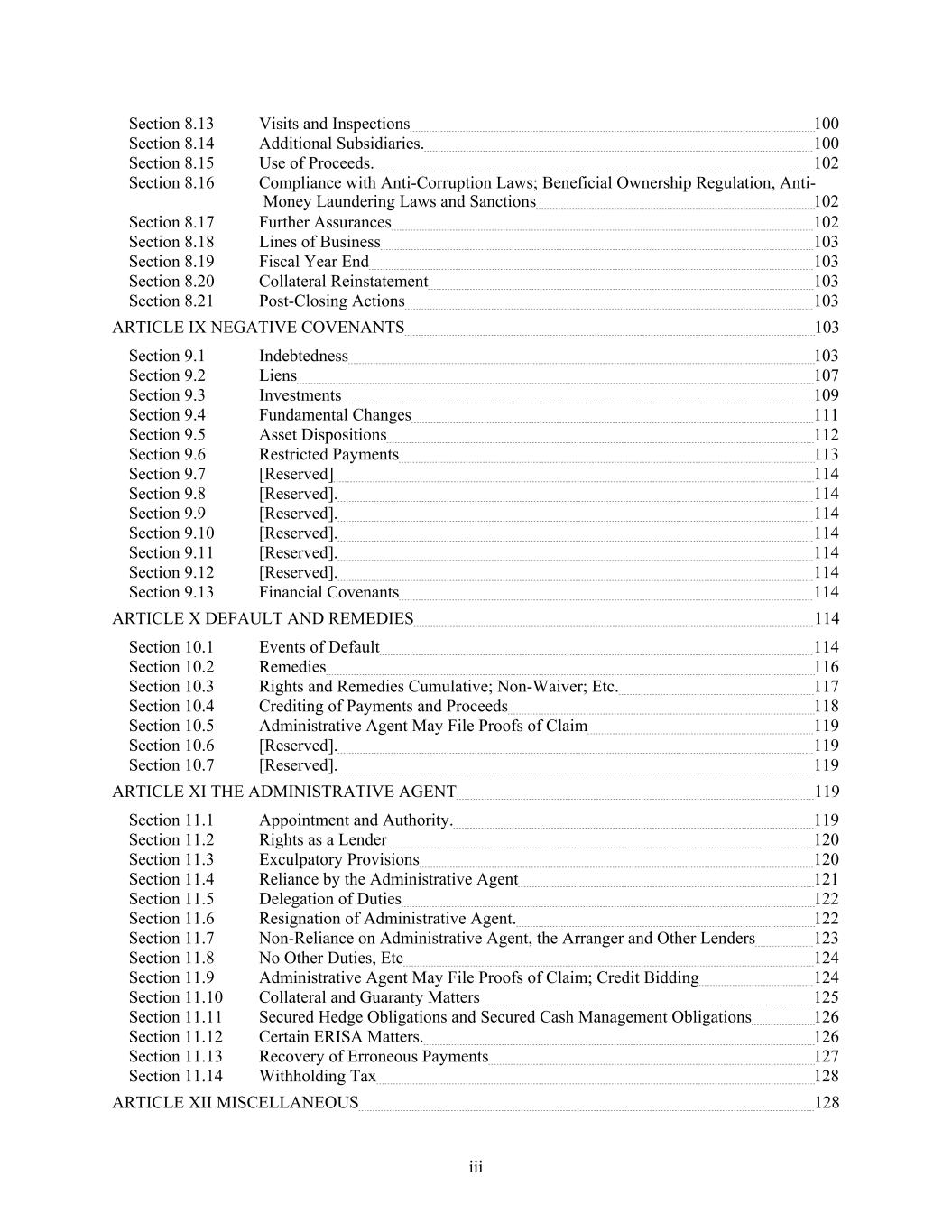 Section 8.13 Visits and Inspections 100Section 8.14 Additional Subsidiaries. 100Section 8.15 Use of Proceeds. 102Section 8.16 Compliance with Anti-Corruption Laws; Beneficial Ownership Regulation, Anti-Money Laundering Laws and Sanctions 102Section 8.17 Further Assurances 102Section 8.18 Lines of Business 103Section 8.19 Fiscal Year End 103Section 8.20 Collateral Reinstatement 103Section 8.21 Post-Closing Actions 103ARTICLE IX NEGATIVE COVENANTS 103Section 9.1 Indebtedness 103Section 9.2 Liens 107Section 9.3 Investments 109Section 9.4 Fundamental Changes 111Section 9.5 Asset Dispositions 112Section 9.6 Restricted Payments 113Section 9.7 [Reserved] 114Section 9.8 [Reserved]. 114Section 9.9 [Reserved]. 114Section 9.10 [Reserved]. 114Section 9.11 [Reserved]. 114Section 9.12 [Reserved]. 114Section 9.13 Financial Covenants 114ARTICLE X DEFAULT AND REMEDIES 114Section 10.1 Events of Default 114Section 10.2 Remedies 116Section 10.3 Rights and Remedies Cumulative; Non-Waiver; Etc. 117Section 10.4 Crediting of Payments and Proceeds 118Section 10.5 Administrative Agent May File Proofs of Claim 119Section 10.6 [Reserved]. 119Section 10.7 [Reserved]. 119ARTICLE XI THE ADMINISTRATIVE AGENT 119Section 11.1 Appointment and Authority. 119Section 11.2 Rights as a Lender 120Section 11.3 Exculpatory Provisions 120Section 11.4 Reliance by the Administrative Agent 121Section 11.5 Delegation of Duties 122Section 11.6 Resignation of Administrative Agent. 122Section 11.7 Non-Reliance on Administrative Agent, the Arranger and Other Lenders 123Section 11.8 No Other Duties, Etc 124Section 11.9 Administrative Agent May File Proofs of Claim; Credit Bidding 124Section 11.10 Collateral and Guaranty Matters 125Section 11.11 Secured Hedge Obligations and Secured Cash Management Obligations 126Section 11.12 Certain ERISA Matters. 126Section 11.13 Recovery of Erroneous Payments 127Section 11.14 Withholding Tax 128ARTICLE XII MISCELLANEOUS 128iii