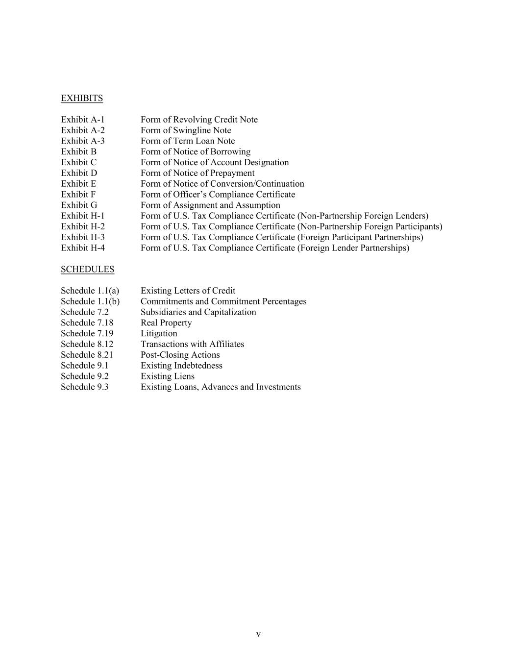 EXHIBITSExhibit A-1 Form of Revolving Credit NoteExhibit A-2 Form of Swingline NoteExhibit A-3 Form of Term Loan NoteExhibit B Form of Notice of BorrowingExhibit C Form of Notice of Account DesignationExhibit D Form of Notice of PrepaymentExhibit E Form of Notice of Conversion/ContinuationExhibit F Form of Officer’s Compliance CertificateExhibit G Form of Assignment and AssumptionExhibit H-1 Form of U.S. Tax Compliance Certificate (Non-Partnership Foreign Lenders)Exhibit H-2 Form of U.S. Tax Compliance Certificate (Non-Partnership Foreign Participants)Exhibit H-3 Form of U.S. Tax Compliance Certificate (Foreign Participant Partnerships)Exhibit H-4 Form of U.S. Tax Compliance Certificate (Foreign Lender Partnerships)SCHEDULESSchedule 1.1(a) Existing Letters of CreditSchedule 1.1(b) Commitments and Commitment PercentagesSchedule 7.2 Subsidiaries and CapitalizationSchedule 7.18 Real PropertySchedule 7.19 LitigationSchedule 8.12Schedule 8.21 Transactions with AffiliatesPost-Closing ActionsSchedule 9.1 Existing IndebtednessSchedule 9.2 Existing LiensSchedule 9.3 Existing Loans, Advances and Investmentsv