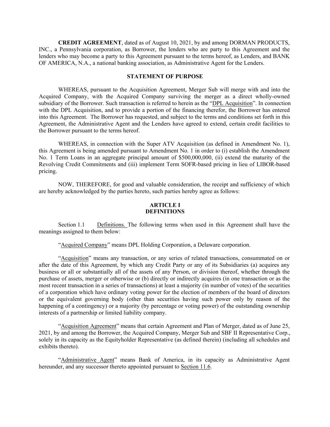 CREDIT AGREEMENT, dated as of August 10, 2021, by and among DORMAN PRODUCTS,INC., a Pennsylvania corporation, as Borrower, the lenders who are party to this Agreement and thelenders who may become a party to this Agreement pursuant to the terms hereof, as Lenders, and BANKOF AMERICA, N.A., a national banking association, as Administrative Agent for the Lenders.STATEMENT OF PURPOSEWHEREAS, pursuant to the Acquisition Agreement, Merger Sub will merge with and into theAcquired Company, with the Acquired Company surviving the merger as a direct wholly-ownedsubsidiary of the Borrower. Such transaction is referred to herein as the “DPL Acquisition”. In connectionwith the DPL Acquisition, and to provide a portion of the financing therefor, the Borrower has enteredinto this Agreement. The Borrower has requested, and subject to the terms and conditions set forth in thisAgreement, the Administrative Agent and the Lenders have agreed to extend, certain credit facilities tothe Borrower pursuant to the terms hereof.WHEREAS, in connection with the Super ATV Acquisition (as defined in Amendment No. 1),this Agreement is being amended pursuant to Amendment No. 1 in order to (i) establish the AmendmentNo. 1 Term Loans in an aggregate principal amount of $500,000,000, (ii) extend the maturity of theRevolving Credit Commitments and (iii) implement Term SOFR-based pricing in lieu of LIBOR-basedpricing. NOW, THEREFORE, for good and valuable consideration, the receipt and sufficiency of whichare hereby acknowledged by the parties hereto, such parties hereby agree as follows:ARTICLE IDEFINITIONSSection 1.1 Definitions. The following terms when used in this Agreement shall have themeanings assigned to them below:“Acquired Company” means DPL Holding Corporation, a Delaware corporation.“Acquisition” means any transaction, or any series of related transactions, consummated on orafter the date of this Agreement, by which any Credit Party or any of its Subsidiaries (a) acquires anybusiness or all or substantially all of the assets of any Person, or division thereof, whether through thepurchase of assets, merger or otherwise or (b) directly or indirectly acquires (in one transaction or as themost recent transaction in a series of transactions) at least a majority (in number of votes) of the securitiesof a corporation which have ordinary voting power for the election of members of the board of directorsor the equivalent governing body (other than securities having such power only by reason of thehappening of a contingency) or a majority (by percentage or voting power) of the outstanding ownershipinterests of a partnership or limited liability company.“Acquisition Agreement” means that certain Agreement and Plan of Merger, dated as of June 25,2021, by and among the Borrower, the Acquired Company, Merger Sub and SBF II Representative Corp.,solely in its capacity as the Equityholder Representative (as defined therein) (including all schedules andexhibits thereto).“Administrative Agent” means Bank of America, in its capacity as Administrative Agenthereunder, and any successor thereto appointed pursuant to Section 11.6.