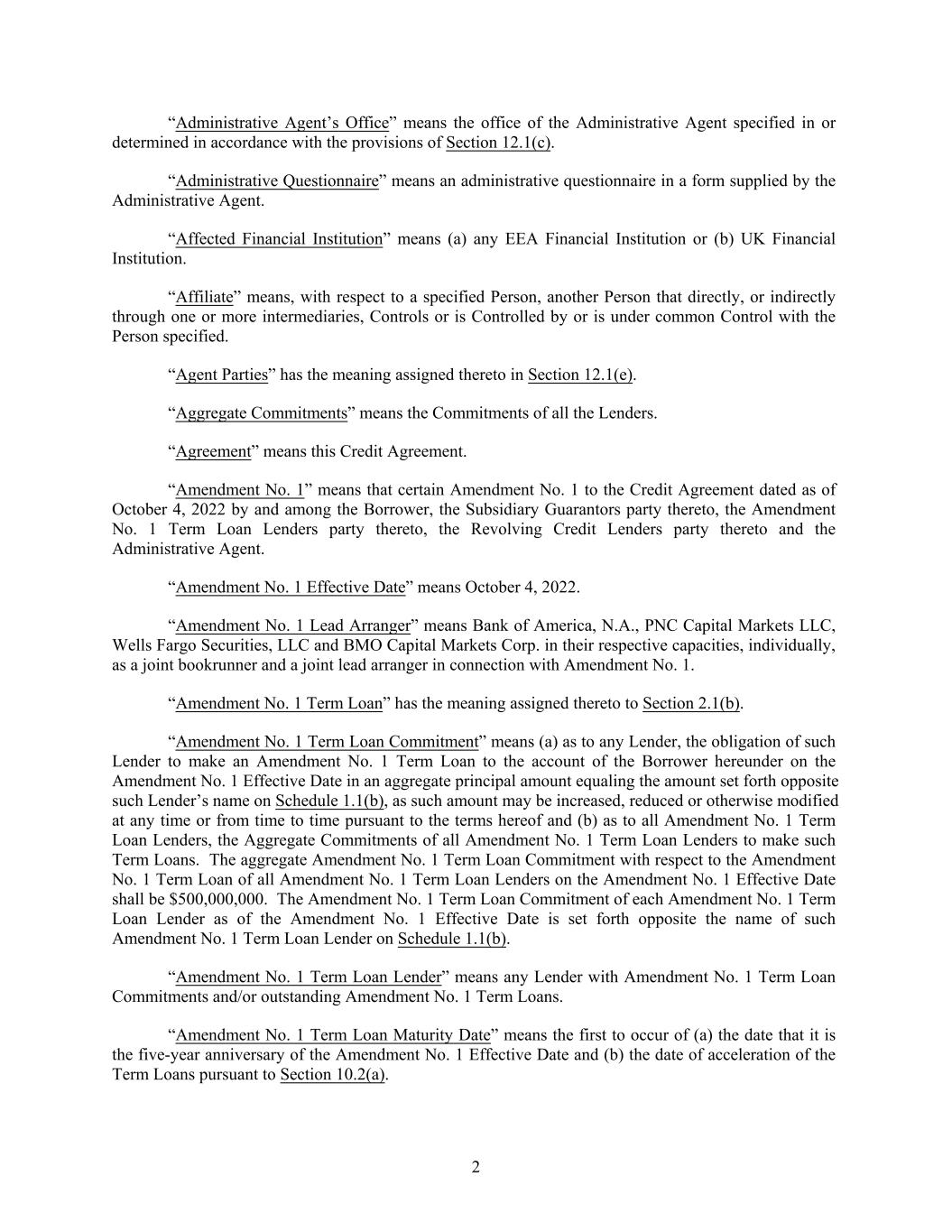 “Administrative Agent’s Office” means the office of the Administrative Agent specified in ordetermined in accordance with the provisions of Section 12.1(c).“Administrative Questionnaire” means an administrative questionnaire in a form supplied by theAdministrative Agent.“Affected Financial Institution” means (a) any EEA Financial Institution or (b) UK FinancialInstitution.“Affiliate” means, with respect to a specified Person, another Person that directly, or indirectlythrough one or more intermediaries, Controls or is Controlled by or is under common Control with thePerson specified.“Agent Parties” has the meaning assigned thereto in Section 12.1(e).“Aggregate Commitments” means the Commitments of all the Lenders.“Agreement” means this Credit Agreement.“Amendment No. 1” means that certain Amendment No. 1 to the Credit Agreement dated as ofOctober 4, 2022 by and among the Borrower, the Subsidiary Guarantors party thereto, the AmendmentNo. 1 Term Loan Lenders party thereto, the Revolving Credit Lenders party thereto and theAdministrative Agent.“Amendment No. 1 Effective Date” means October 4, 2022.“Amendment No. 1 Lead Arranger” means Bank of America, N.A., PNC Capital Markets LLC,Wells Fargo Securities, LLC and BMO Capital Markets Corp. in their respective capacities, individually,as a joint bookrunner and a joint lead arranger in connection with Amendment No. 1.“Amendment No. 1 Term Loan” has the meaning assigned thereto to Section 2.1(b).“Amendment No. 1 Term Loan Commitment” means (a) as to any Lender, the obligation of suchLender to make an Amendment No. 1 Term Loan to the account of the Borrower hereunder on theAmendment No. 1 Effective Date in an aggregate principal amount equaling the amount set forth oppositesuch Lender’s name on Schedule 1.1(b), as such amount may be increased, reduced or otherwise modifiedat any time or from time to time pursuant to the terms hereof and (b) as to all Amendment No. 1 TermLoan Lenders, the Aggregate Commitments of all Amendment No. 1 Term Loan Lenders to make suchTerm Loans. The aggregate Amendment No. 1 Term Loan Commitment with respect to the AmendmentNo. 1 Term Loan of all Amendment No. 1 Term Loan Lenders on the Amendment No. 1 Effective Dateshall be $500,000,000. The Amendment No. 1 Term Loan Commitment of each Amendment No. 1 TermLoan Lender as of the Amendment No. 1 Effective Date is set forth opposite the name of suchAmendment No. 1 Term Loan Lender on Schedule 1.1(b).“Amendment No. 1 Term Loan Lender” means any Lender with Amendment No. 1 Term LoanCommitments and/or outstanding Amendment No. 1 Term Loans.“Amendment No. 1 Term Loan Maturity Date” means the first to occur of (a) the date that it isthe five-year anniversary of the Amendment No. 1 Effective Date and (b) the date of acceleration of theTerm Loans pursuant to Section 10.2(a). 2