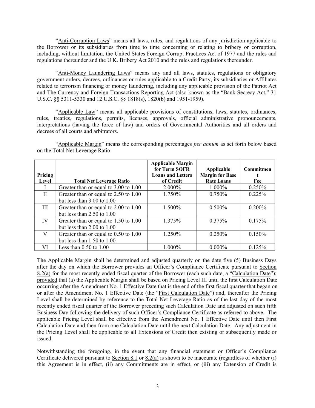 “Anti-Corruption Laws” means all laws, rules, and regulations of any jurisdiction applicable tothe Borrower or its subsidiaries from time to time concerning or relating to bribery or corruption,including, without limitation, the United States Foreign Corrupt Practices Act of 1977 and the rules andregulations thereunder and the U.K. Bribery Act 2010 and the rules and regulations thereunder.“Anti-Money Laundering Laws” means any and all laws, statutes, regulations or obligatorygovernment orders, decrees, ordinances or rules applicable to a Credit Party, its subsidiaries or Affiliatesrelated to terrorism financing or money laundering, including any applicable provision of the Patriot Actand The Currency and Foreign Transactions Reporting Act (also known as the “Bank Secrecy Act,” 31U.S.C. §§ 5311-5330 and 12 U.S.C. §§ 1818(s), 1820(b) and 1951-1959).“Applicable Law” means all applicable provisions of constitutions, laws, statutes, ordinances,rules, treaties, regulations, permits, licenses, approvals, official administrative pronouncements,interpretations (having the force of law) and orders of Governmental Authorities and all orders anddecrees of all courts and arbitrators.“Applicable Margin” means the corresponding percentages per annum as set forth below basedon the Total Net Leverage Ratio:PricingLevel Total Net Leverage Ratio Applicable Marginfor Term SOFRLoans and Lettersof Credit ApplicableMargin for BaseRate Loans CommitmentFeeI Greater than or equal to 3.00 to 1.00 2.000% 1.000% 0.250%II Greater than or equal to 2.50 to 1.00but less than 3.00 to 1.00 1.750% 0.750% 0.225%III Greater than or equal to 2.00 to 1.00but less than 2.50 to 1.00 1.500% 0.500% 0.200%IV Greater than or equal to 1.50 to 1.00but less than 2.00 to 1.00 1.375% 0.375% 0.175%V Greater than or equal to 0.50 to 1.00but less than 1.50 to 1.00 1.250% 0.250% 0.150%VI Less than 0.50 to 1.00 1.000% 0.000% 0.125%The Applicable Margin shall be determined and adjusted quarterly on the date five (5) Business Daysafter the day on which the Borrower provides an Officer’s Compliance Certificate pursuant to Section8.2(a) for the most recently ended fiscal quarter of the Borrower (each such date, a “Calculation Date”);provided that (a) the Applicable Margin shall be based on Pricing Level III until the first Calculation Dateoccurring after the Amendment No. 1 Effective Date that is the end of the first fiscal quarter that began onor after the Amendment No. 1 Effective Date (the “First Calculation Date”) and, thereafter the PricingLevel shall be determined by reference to the Total Net Leverage Ratio as of the last day of the mostrecently ended fiscal quarter of the Borrower preceding such Calculation Date and adjusted on such fifthBusiness Day following the delivery of such Officer’s Compliance Certificate as referred to above. Theapplicable Pricing Level shall be effective from the Amendment No. 1 Effective Date until then FirstCalculation Date and then from one Calculation Date until the next Calculation Date. Any adjustment inthe Pricing Level shall be applicable to all Extensions of Credit then existing or subsequently made orissued.Notwithstanding the foregoing, in the event that any financial statement or Officer’s ComplianceCertificate delivered pursuant to Section 8.1 or 8.2(a) is shown to be inaccurate (regardless of whether (i)this Agreement is in effect, (ii) any Commitments are in effect, or (iii) any Extension of Credit is3