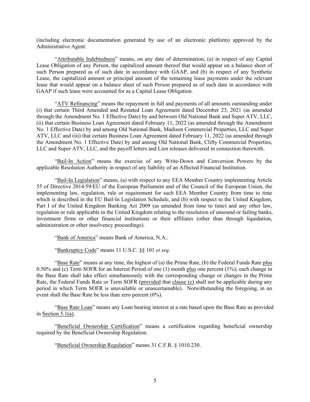 (including electronic documentation generated by use of an electronic platform) approved by theAdministrative Agent.“Attributable Indebtedness” means, on any date of determination, (a) in respect of any CapitalLease Obligation of any Person, the capitalized amount thereof that would appear on a balance sheet ofsuch Person prepared as of such date in accordance with GAAP, and (b) in respect of any SyntheticLease, the capitalized amount or principal amount of the remaining lease payments under the relevantlease that would appear on a balance sheet of such Person prepared as of such date in accordance withGAAP if such lease were accounted for as a Capital Lease Obligation.“ATV Refinancing” means the repayment in full and payments of all amounts outstanding under(i) that certain Third Amended and Restated Loan Agreement dated December 23, 2021 (as amendedthrough the Amendment No. 1 Effective Date) by and between Old National Bank and Super ATV, LLC,(ii) that certain Business Loan Agreement dated February 11, 2022 (as amended through the AmendmentNo. 1 Effective Date) by and among Old National Bank, Madison Commercial Properties, LLC and SuperATV, LLC and (iii) that certain Business Loan Agreement dated February 11, 2022 (as amended throughthe Amendment No. 1 Effective Date) by and among Old National Bank, Clifty Commercial Properties,LLC and Super ATV, LLC, and the payoff letters and Lien releases delivered in connection therewith.“Bail-In Action” means the exercise of any Write-Down and Conversion Powers by theapplicable Resolution Authority in respect of any liability of an Affected Financial Institution.“Bail-In Legislation” means, (a) with respect to any EEA Member Country implementing Article55 of Directive 2014/59/EU of the European Parliament and of the Council of the European Union, theimplementing law, regulation, rule or requirement for such EEA Member Country from time to timewhich is described in the EU Bail-In Legislation Schedule, and (b) with respect to the United Kingdom,Part I of the United Kingdom Banking Act 2009 (as amended from time to time) and any other law,regulation or rule applicable in the United Kingdom relating to the resolution of unsound or failing banks,investment firms or other financial institutions or their affiliates (other than through liquidation,administration or other insolvency proceedings).“Bank of America” means Bank of America, N.A..“Bankruptcy Code” means 11 U.S.C. §§ 101 et seq.“Base Rate” means at any time, the highest of (a) the Prime Rate, (b) the Federal Funds Rate plus0.50% and (c) Term SOFR for an Interest Period of one (1) month plus one percent (1%); each change inthe Base Rate shall take effect simultaneously with the corresponding change or changes in the PrimeRate, the Federal Funds Rate or Term SOFR (provided that clause (c) shall not be applicable during anyperiod in which Term SOFR is unavailable or unascertainable). Notwithstanding the foregoing, in noevent shall the Base Rate be less than zero percent (0%).“Base Rate Loan” means any Loan bearing interest at a rate based upon the Base Rate as providedin Section 5.1(a).“Beneficial Ownership Certification” means a certification regarding beneficial ownershiprequired by the Beneficial Ownership Regulation.“Beneficial Ownership Regulation” means 31 C.F.R. § 1010.230.5