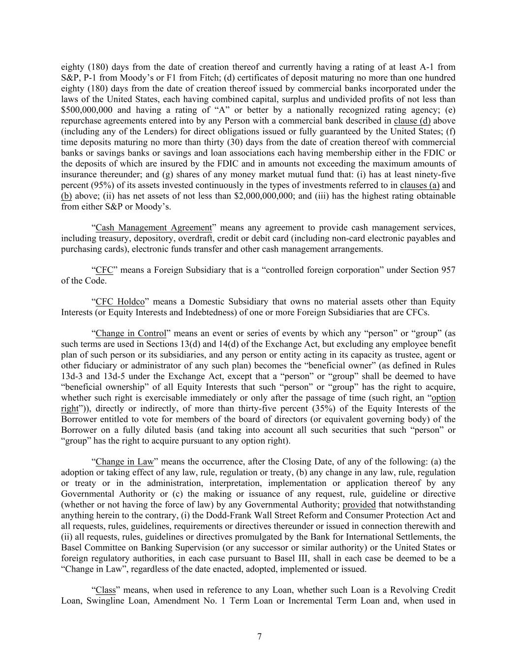 eighty (180) days from the date of creation thereof and currently having a rating of at least A-1 fromS&P, P-1 from Moody’s or F1 from Fitch; (d) certificates of deposit maturing no more than one hundredeighty (180) days from the date of creation thereof issued by commercial banks incorporated under thelaws of the United States, each having combined capital, surplus and undivided profits of not less than$500,000,000 and having a rating of “A” or better by a nationally recognized rating agency; (e)repurchase agreements entered into by any Person with a commercial bank described in clause (d) above(including any of the Lenders) for direct obligations issued or fully guaranteed by the United States; (f)time deposits maturing no more than thirty (30) days from the date of creation thereof with commercialbanks or savings banks or savings and loan associations each having membership either in the FDIC orthe deposits of which are insured by the FDIC and in amounts not exceeding the maximum amounts ofinsurance thereunder; and (g) shares of any money market mutual fund that: (i) has at least ninety-fivepercent (95%) of its assets invested continuously in the types of investments referred to in clauses (a) and(b) above; (ii) has net assets of not less than $2,000,000,000; and (iii) has the highest rating obtainablefrom either S&P or Moody’s.“Cash Management Agreement” means any agreement to provide cash management services,including treasury, depository, overdraft, credit or debit card (including non-card electronic payables andpurchasing cards), electronic funds transfer and other cash management arrangements.“CFC” means a Foreign Subsidiary that is a “controlled foreign corporation” under Section 957of the Code.“CFC Holdco” means a Domestic Subsidiary that owns no material assets other than EquityInterests (or Equity Interests and Indebtedness) of one or more Foreign Subsidiaries that are CFCs.“Change in Control” means an event or series of events by which any “person” or “group” (assuch terms are used in Sections 13(d) and 14(d) of the Exchange Act, but excluding any employee benefitplan of such person or its subsidiaries, and any person or entity acting in its capacity as trustee, agent orother fiduciary or administrator of any such plan) becomes the “beneficial owner” (as defined in Rules13d-3 and 13d-5 under the Exchange Act, except that a “person” or “group” shall be deemed to have“beneficial ownership” of all Equity Interests that such “person” or “group” has the right to acquire,whether such right is exercisable immediately or only after the passage of time (such right, an “optionright”)), directly or indirectly, of more than thirty-five percent (35%) of the Equity Interests of theBorrower entitled to vote for members of the board of directors (or equivalent governing body) of theBorrower on a fully diluted basis (and taking into account all such securities that such “person” or“group” has the right to acquire pursuant to any option right).“Change in Law” means the occurrence, after the Closing Date, of any of the following: (a) theadoption or taking effect of any law, rule, regulation or treaty, (b) any change in any law, rule, regulationor treaty or in the administration, interpretation, implementation or application thereof by anyGovernmental Authority or (c) the making or issuance of any request, rule, guideline or directive(whether or not having the force of law) by any Governmental Authority; provided that notwithstandinganything herein to the contrary, (i) the Dodd-Frank Wall Street Reform and Consumer Protection Act andall requests, rules, guidelines, requirements or directives thereunder or issued in connection therewith and(ii) all requests, rules, guidelines or directives promulgated by the Bank for International Settlements, theBasel Committee on Banking Supervision (or any successor or similar authority) or the United States orforeign regulatory authorities, in each case pursuant to Basel III, shall in each case be deemed to be a“Change in Law”, regardless of the date enacted, adopted, implemented or issued.“Class” means, when used in reference to any Loan, whether such Loan is a Revolving CreditLoan, Swingline Loan, Amendment No. 1 Term Loan or Incremental Term Loan and, when used in7