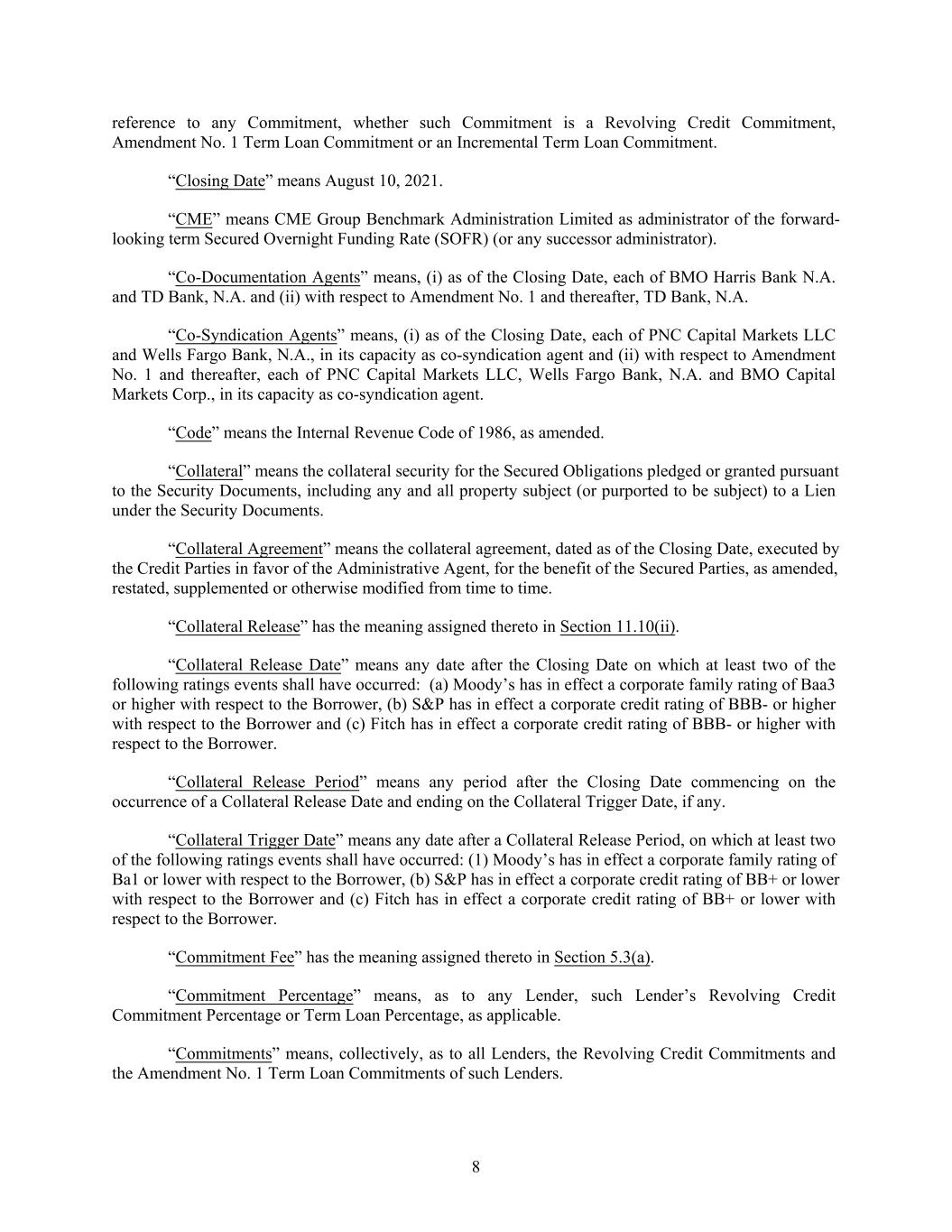 reference to any Commitment, whether such Commitment is a Revolving Credit Commitment,Amendment No. 1 Term Loan Commitment or an Incremental Term Loan Commitment.“Closing Date” means August 10, 2021.“CME” means CME Group Benchmark Administration Limited as administrator of the forward-looking term Secured Overnight Funding Rate (SOFR) (or any successor administrator).“Co-Documentation Agents” means, (i) as of the Closing Date, each of BMO Harris Bank N.A.and TD Bank, N.A. and (ii) with respect to Amendment No. 1 and thereafter, TD Bank, N.A.“Co-Syndication Agents” means, (i) as of the Closing Date, each of PNC Capital Markets LLCand Wells Fargo Bank, N.A., in its capacity as co-syndication agent and (ii) with respect to AmendmentNo. 1 and thereafter, each of PNC Capital Markets LLC, Wells Fargo Bank, N.A. and BMO CapitalMarkets Corp., in its capacity as co-syndication agent.“Code” means the Internal Revenue Code of 1986, as amended.“Collateral” means the collateral security for the Secured Obligations pledged or granted pursuantto the Security Documents, including any and all property subject (or purported to be subject) to a Lienunder the Security Documents.“Collateral Agreement” means the collateral agreement, dated as of the Closing Date, executed bythe Credit Parties in favor of the Administrative Agent, for the benefit of the Secured Parties, as amended,restated, supplemented or otherwise modified from time to time.“Collateral Release” has the meaning assigned thereto in Section 11.10(ii).“Collateral Release Date” means any date after the Closing Date on which at least two of thefollowing ratings events shall have occurred: (a) Moody’s has in effect a corporate family rating of Baa3or higher with respect to the Borrower, (b) S&P has in effect a corporate credit rating of BBB- or higherwith respect to the Borrower and (c) Fitch has in effect a corporate credit rating of BBB- or higher withrespect to the Borrower.“Collateral Release Period” means any period after the Closing Date commencing on theoccurrence of a Collateral Release Date and ending on the Collateral Trigger Date, if any.“Collateral Trigger Date” means any date after a Collateral Release Period, on which at least twoof the following ratings events shall have occurred: (1) Moody’s has in effect a corporate family rating ofBa1 or lower with respect to the Borrower, (b) S&P has in effect a corporate credit rating of BB+ or lowerwith respect to the Borrower and (c) Fitch has in effect a corporate credit rating of BB+ or lower withrespect to the Borrower.“Commitment Fee” has the meaning assigned thereto in Section 5.3(a).“Commitment Percentage” means, as to any Lender, such Lender’s Revolving CreditCommitment Percentage or Term Loan Percentage, as applicable.“Commitments” means, collectively, as to all Lenders, the Revolving Credit Commitments andthe Amendment No. 1 Term Loan Commitments of such Lenders.8