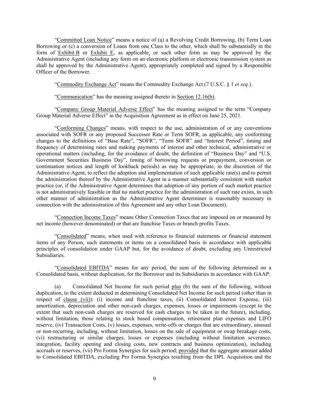 “Committed Loan Notice” means a notice of (a) a Revolving Credit Borrowing, (b) Term LoanBorrowing or (c) a conversion of Loans from one Class to the other, which shall be substantially in theform of Exhibit B or Exhibit E, as applicable, or such other form as may be approved by theAdministrative Agent (including any form on an electronic platform or electronic transmission system asshall be approved by the Administrative Agent), appropriately completed and signed by a ResponsibleOfficer of the Borrower.“Commodity Exchange Act” means the Commodity Exchange Act (7 U.S.C. § 1 et seq.).“Communication” has the meaning assigned thereto in Section 12.16(b).“Company Group Material Adverse Effect” has the meaning assigned to the term “CompanyGroup Material Adverse Effect” in the Acquisition Agreement as in effect on June 25, 2021.“Conforming Changes” means, with respect to the use, administration of or any conventionsassociated with SOFR or any proposed Successor Rate or Term SOFR, as applicable, any conformingchanges to the definitions of “Base Rate”, “SOFR”, “Term SOFR” and “Interest Period”, timing andfrequency of determining rates and making payments of interest and other technical, administrative oroperational matters (including, for the avoidance of doubt, the definition of “Business Day” and “U.S.Government Securities Business Day”, timing of borrowing requests or prepayment, conversion orcontinuation notices and length of lookback periods) as may be appropriate, in the discretion of theAdministrative Agent, to reflect the adoption and implementation of such applicable rate(s) and to permitthe administration thereof by the Administrative Agent in a manner substantially consistent with marketpractice (or, if the Administrative Agent determines that adoption of any portion of such market practiceis not administratively feasible or that no market practice for the administration of such rate exists, in suchother manner of administration as the Administrative Agent determines is reasonably necessary inconnection with the administration of this Agreement and any other Loan Document).“Connection Income Taxes” means Other Connection Taxes that are imposed on or measured bynet income (however denominated) or that are franchise Taxes or branch profits Taxes.“Consolidated” means, when used with reference to financial statements or financial statementitems of any Person, such statements or items on a consolidated basis in accordance with applicableprinciples of consolidation under GAAP but, for the avoidance of doubt, excluding any UnrestrictedSubsidiaries.“Consolidated EBITDA” means for any period, the sum of the following determined on aConsolidated basis, without duplication, for the Borrower and its Subsidiaries in accordance with GAAP:(a) Consolidated Net Income for such period plus (b) the sum of the following, withoutduplication, to the extent deducted in determining Consolidated Net Income for such period (other than inrespect of clause (vii)): (i) income and franchise taxes, (ii) Consolidated Interest Expense, (iii)amortization, depreciation and other non-cash charges, expenses, losses or impairments (except to theextent that such non-cash charges are reserved for cash charges to be taken in the future), including,without limitation, those relating to stock based compensation, retirement plan expenses and LIFOreserve, (iv) Transaction Costs, (v) losses, expenses, write-offs or charges that are extraordinary, unusualor non-recurring, including, without limitation, losses on the sale of equipment or swap breakage costs,(vi) restructuring or similar charges, losses or expenses (including without limitation severance,integration, facility opening and closing costs, new contracts and business optimization), includingaccruals or reserves, (vii) Pro Forma Synergies for such period; provided that the aggregate amount addedto Consolidated EBITDA, excluding Pro Forma Synergies resulting from the DPL Acquisition and the9
