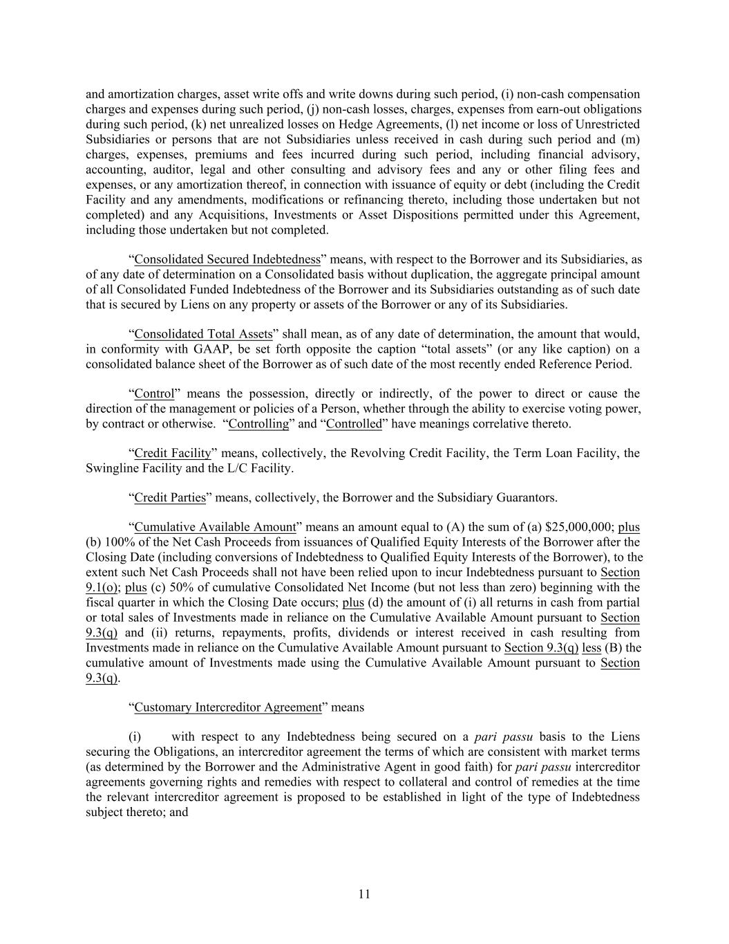 and amortization charges, asset write offs and write downs during such period, (i) non-cash compensationcharges and expenses during such period, (j) non-cash losses, charges, expenses from earn-out obligationsduring such period, (k) net unrealized losses on Hedge Agreements, (l) net income or loss of UnrestrictedSubsidiaries or persons that are not Subsidiaries unless received in cash during such period and (m)charges, expenses, premiums and fees incurred during such period, including financial advisory,accounting, auditor, legal and other consulting and advisory fees and any or other filing fees andexpenses, or any amortization thereof, in connection with issuance of equity or debt (including the CreditFacility and any amendments, modifications or refinancing thereto, including those undertaken but notcompleted) and any Acquisitions, Investments or Asset Dispositions permitted under this Agreement,including those undertaken but not completed.“Consolidated Secured Indebtedness” means, with respect to the Borrower and its Subsidiaries, asof any date of determination on a Consolidated basis without duplication, the aggregate principal amountof all Consolidated Funded Indebtedness of the Borrower and its Subsidiaries outstanding as of such datethat is secured by Liens on any property or assets of the Borrower or any of its Subsidiaries.“Consolidated Total Assets” shall mean, as of any date of determination, the amount that would,in conformity with GAAP, be set forth opposite the caption “total assets” (or any like caption) on aconsolidated balance sheet of the Borrower as of such date of the most recently ended Reference Period.“Control” means the possession, directly or indirectly, of the power to direct or cause thedirection of the management or policies of a Person, whether through the ability to exercise voting power,by contract or otherwise. “Controlling” and “Controlled” have meanings correlative thereto.“Credit Facility” means, collectively, the Revolving Credit Facility, the Term Loan Facility, theSwingline Facility and the L/C Facility.“Credit Parties” means, collectively, the Borrower and the Subsidiary Guarantors.“Cumulative Available Amount” means an amount equal to (A) the sum of (a) $25,000,000; plus(b) 100% of the Net Cash Proceeds from issuances of Qualified Equity Interests of the Borrower after theClosing Date (including conversions of Indebtedness to Qualified Equity Interests of the Borrower), to theextent such Net Cash Proceeds shall not have been relied upon to incur Indebtedness pursuant to Section9.1(o); plus (c) 50% of cumulative Consolidated Net Income (but not less than zero) beginning with thefiscal quarter in which the Closing Date occurs; plus (d) the amount of (i) all returns in cash from partialor total sales of Investments made in reliance on the Cumulative Available Amount pursuant to Section9.3(q) and (ii) returns, repayments, profits, dividends or interest received in cash resulting fromInvestments made in reliance on the Cumulative Available Amount pursuant to Section 9.3(q) less (B) thecumulative amount of Investments made using the Cumulative Available Amount pursuant to Section9.3(q). “Customary Intercreditor Agreement” means(i) with respect to any Indebtedness being secured on a pari passu basis to the Lienssecuring the Obligations, an intercreditor agreement the terms of which are consistent with market terms(as determined by the Borrower and the Administrative Agent in good faith) for pari passu intercreditoragreements governing rights and remedies with respect to collateral and control of remedies at the timethe relevant intercreditor agreement is proposed to be established in light of the type of Indebtednesssubject thereto; and 11