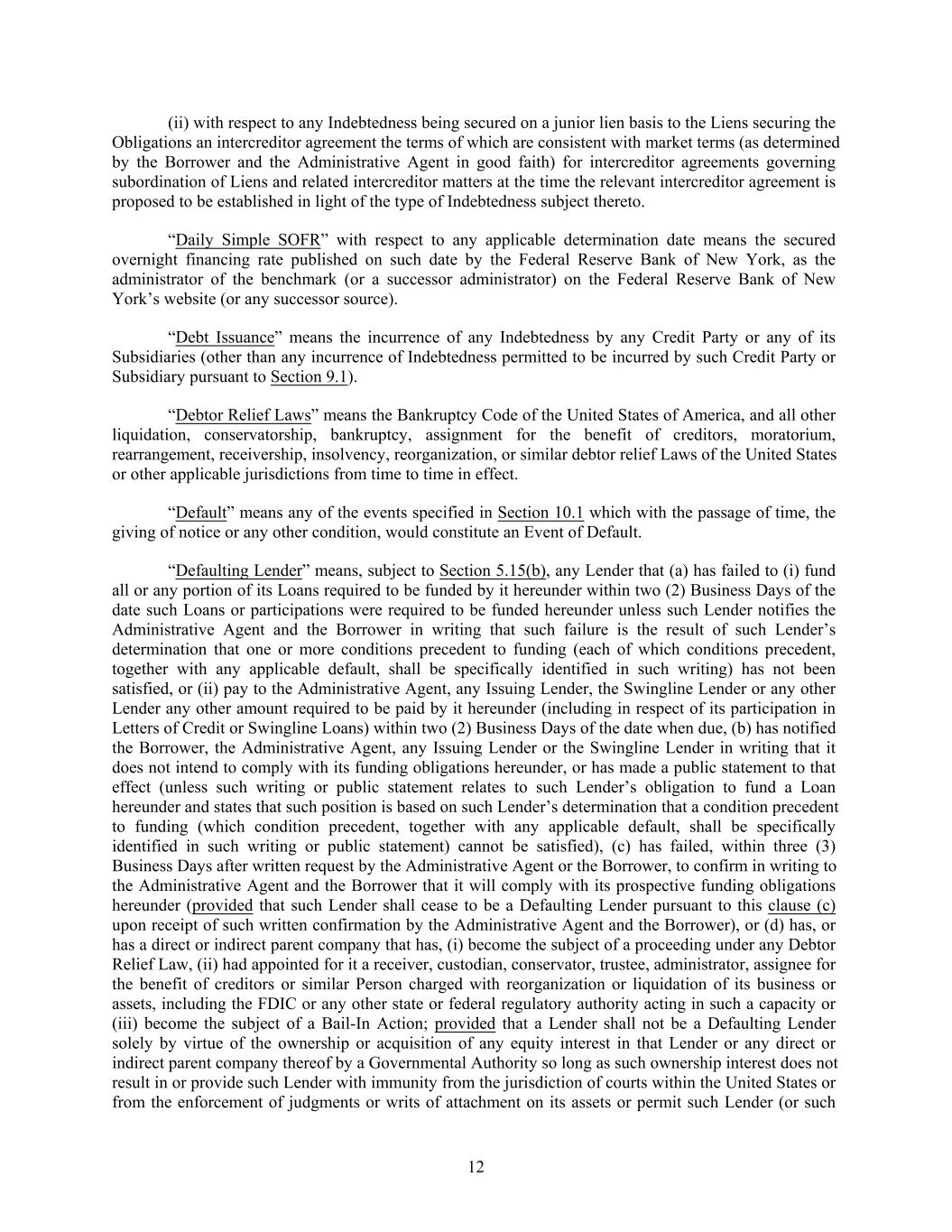 (ii) with respect to any Indebtedness being secured on a junior lien basis to the Liens securing theObligations an intercreditor agreement the terms of which are consistent with market terms (as determinedby the Borrower and the Administrative Agent in good faith) for intercreditor agreements governingsubordination of Liens and related intercreditor matters at the time the relevant intercreditor agreement isproposed to be established in light of the type of Indebtedness subject thereto.“Daily Simple SOFR” with respect to any applicable determination date means the securedovernight financing rate published on such date by the Federal Reserve Bank of New York, as theadministrator of the benchmark (or a successor administrator) on the Federal Reserve Bank of NewYork’s website (or any successor source).“Debt Issuance” means the incurrence of any Indebtedness by any Credit Party or any of itsSubsidiaries (other than any incurrence of Indebtedness permitted to be incurred by such Credit Party orSubsidiary pursuant to Section 9.1).“Debtor Relief Laws” means the Bankruptcy Code of the United States of America, and all otherliquidation, conservatorship, bankruptcy, assignment for the benefit of creditors, moratorium,rearrangement, receivership, insolvency, reorganization, or similar debtor relief Laws of the United Statesor other applicable jurisdictions from time to time in effect.“Default” means any of the events specified in Section 10.1 which with the passage of time, thegiving of notice or any other condition, would constitute an Event of Default.“Defaulting Lender” means, subject to Section 5.15(b), any Lender that (a) has failed to (i) fundall or any portion of its Loans required to be funded by it hereunder within two (2) Business Days of thedate such Loans or participations were required to be funded hereunder unless such Lender notifies theAdministrative Agent and the Borrower in writing that such failure is the result of such Lender’sdetermination that one or more conditions precedent to funding (each of which conditions precedent,together with any applicable default, shall be specifically identified in such writing) has not beensatisfied, or (ii) pay to the Administrative Agent, any Issuing Lender, the Swingline Lender or any otherLender any other amount required to be paid by it hereunder (including in respect of its participation inLetters of Credit or Swingline Loans) within two (2) Business Days of the date when due, (b) has notifiedthe Borrower, the Administrative Agent, any Issuing Lender or the Swingline Lender in writing that itdoes not intend to comply with its funding obligations hereunder, or has made a public statement to thateffect (unless such writing or public statement relates to such Lender’s obligation to fund a Loanhereunder and states that such position is based on such Lender’s determination that a condition precedentto funding (which condition precedent, together with any applicable default, shall be specificallyidentified in such writing or public statement) cannot be satisfied), (c) has failed, within three (3)Business Days after written request by the Administrative Agent or the Borrower, to confirm in writing tothe Administrative Agent and the Borrower that it will comply with its prospective funding obligationshereunder (provided that such Lender shall cease to be a Defaulting Lender pursuant to this clause (c)upon receipt of such written confirmation by the Administrative Agent and the Borrower), or (d) has, orhas a direct or indirect parent company that has, (i) become the subject of a proceeding under any DebtorRelief Law, (ii) had appointed for it a receiver, custodian, conservator, trustee, administrator, assignee forthe benefit of creditors or similar Person charged with reorganization or liquidation of its business orassets, including the FDIC or any other state or federal regulatory authority acting in such a capacity or(iii) become the subject of a Bail-In Action; provided that a Lender shall not be a Defaulting Lendersolely by virtue of the ownership or acquisition of any equity interest in that Lender or any direct orindirect parent company thereof by a Governmental Authority so long as such ownership interest does notresult in or provide such Lender with immunity from the jurisdiction of courts within the United States orfrom the enforcement of judgments or writs of attachment on its assets or permit such Lender (or such12