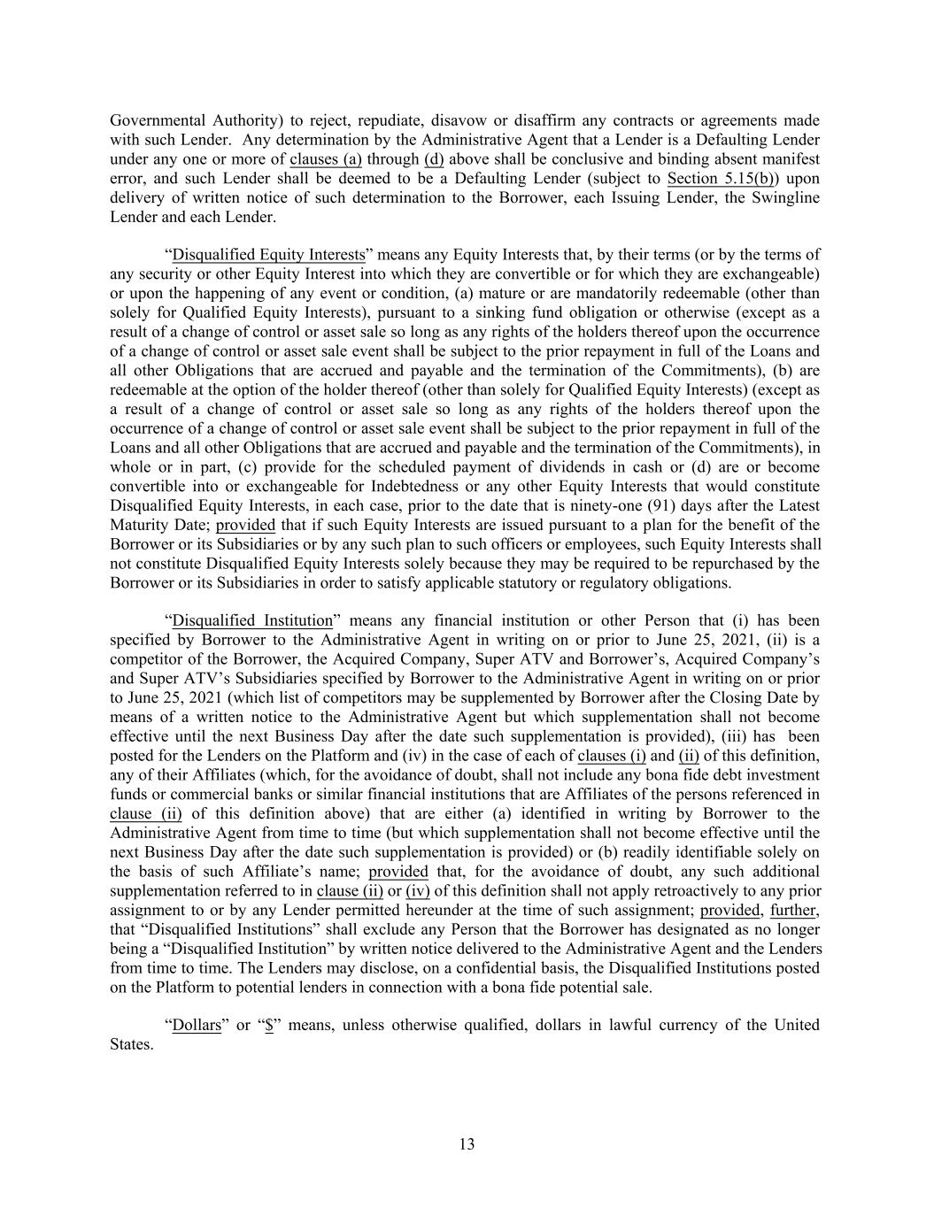 Governmental Authority) to reject, repudiate, disavow or disaffirm any contracts or agreements madewith such Lender. Any determination by the Administrative Agent that a Lender is a Defaulting Lenderunder any one or more of clauses (a) through (d) above shall be conclusive and binding absent manifesterror, and such Lender shall be deemed to be a Defaulting Lender (subject to Section 5.15(b)) upondelivery of written notice of such determination to the Borrower, each Issuing Lender, the SwinglineLender and each Lender.“Disqualified Equity Interests” means any Equity Interests that, by their terms (or by the terms ofany security or other Equity Interest into which they are convertible or for which they are exchangeable)or upon the happening of any event or condition, (a) mature or are mandatorily redeemable (other thansolely for Qualified Equity Interests), pursuant to a sinking fund obligation or otherwise (except as aresult of a change of control or asset sale so long as any rights of the holders thereof upon the occurrenceof a change of control or asset sale event shall be subject to the prior repayment in full of the Loans andall other Obligations that are accrued and payable and the termination of the Commitments), (b) areredeemable at the option of the holder thereof (other than solely for Qualified Equity Interests) (except asa result of a change of control or asset sale so long as any rights of the holders thereof upon theoccurrence of a change of control or asset sale event shall be subject to the prior repayment in full of theLoans and all other Obligations that are accrued and payable and the termination of the Commitments), inwhole or in part, (c) provide for the scheduled payment of dividends in cash or (d) are or becomeconvertible into or exchangeable for Indebtedness or any other Equity Interests that would constituteDisqualified Equity Interests, in each case, prior to the date that is ninety-one (91) days after the LatestMaturity Date; provided that if such Equity Interests are issued pursuant to a plan for the benefit of theBorrower or its Subsidiaries or by any such plan to such officers or employees, such Equity Interests shallnot constitute Disqualified Equity Interests solely because they may be required to be repurchased by theBorrower or its Subsidiaries in order to satisfy applicable statutory or regulatory obligations.“Disqualified Institution” means any financial institution or other Person that (i) has beenspecified by Borrower to the Administrative Agent in writing on or prior to June 25, 2021, (ii) is acompetitor of the Borrower, the Acquired Company, Super ATV and Borrower’s, Acquired Company’sand Super ATV’s Subsidiaries specified by Borrower to the Administrative Agent in writing on or priorto June 25, 2021 (which list of competitors may be supplemented by Borrower after the Closing Date bymeans of a written notice to the Administrative Agent but which supplementation shall not becomeeffective until the next Business Day after the date such supplementation is provided), (iii) has beenposted for the Lenders on the Platform and (iv) in the case of each of clauses (i) and (ii) of this definition,any of their Affiliates (which, for the avoidance of doubt, shall not include any bona fide debt investmentfunds or commercial banks or similar financial institutions that are Affiliates of the persons referenced inclause (ii) of this definition above) that are either (a) identified in writing by Borrower to theAdministrative Agent from time to time (but which supplementation shall not become effective until thenext Business Day after the date such supplementation is provided) or (b) readily identifiable solely onthe basis of such Affiliate’s name; provided that, for the avoidance of doubt, any such additionalsupplementation referred to in clause (ii) or (iv) of this definition shall not apply retroactively to any priorassignment to or by any Lender permitted hereunder at the time of such assignment; provided, further,that “Disqualified Institutions” shall exclude any Person that the Borrower has designated as no longerbeing a “Disqualified Institution” by written notice delivered to the Administrative Agent and the Lendersfrom time to time. The Lenders may disclose, on a confidential basis, the Disqualified Institutions postedon the Platform to potential lenders in connection with a bona fide potential sale.“Dollars” or “$” means, unless otherwise qualified, dollars in lawful currency of the UnitedStates. 13