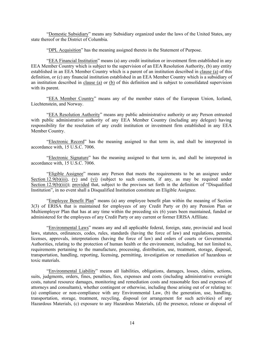 “Domestic Subsidiary” means any Subsidiary organized under the laws of the United States, anystate thereof or the District of Columbia.“DPL Acquisition” has the meaning assigned thereto in the Statement of Purpose.“EEA Financial Institution” means (a) any credit institution or investment firm established in anyEEA Member Country which is subject to the supervision of an EEA Resolution Authority, (b) any entityestablished in an EEA Member Country which is a parent of an institution described in clause (a) of thisdefinition, or (c) any financial institution established in an EEA Member Country which is a subsidiary ofan institution described in clause (a) or (b) of this definition and is subject to consolidated supervisionwith its parent.“EEA Member Country” means any of the member states of the European Union, Iceland,Liechtenstein, and Norway.“EEA Resolution Authority” means any public administrative authority or any Person entrustedwith public administrative authority of any EEA Member Country (including any delegee) havingresponsibility for the resolution of any credit institution or investment firm established in any EEAMember Country.“Electronic Record” has the meaning assigned to that term in, and shall be interpreted inaccordance with, 15 U.S.C. 7006.“Electronic Signature” has the meaning assigned to that term in, and shall be interpreted inaccordance with, 15 U.S.C. 7006.“Eligible Assignee” means any Person that meets the requirements to be an assignee underSection 12.9(b)(iii), (v) and (vi) (subject to such consents, if any, as may be required underSection 12.9(b)(iii)); provided that, subject to the provisos set forth in the definition of “DisqualifiedInstitution”, in no event shall a Disqualified Institution constitute an Eligible Assignee.“Employee Benefit Plan” means (a) any employee benefit plan within the meaning of Section3(3) of ERISA that is maintained for employees of any Credit Party or (b) any Pension Plan orMultiemployer Plan that has at any time within the preceding six (6) years been maintained, funded oradministered for the employees of any Credit Party or any current or former ERISA Affiliate.“Environmental Laws” means any and all applicable federal, foreign, state, provincial and locallaws, statutes, ordinances, codes, rules, standards (having the force of law) and regulations, permits,licenses, approvals, interpretations (having the force of law) and orders of courts or GovernmentalAuthorities, relating to the protection of human health or the environment, including, but not limited to,requirements pertaining to the manufacture, processing, distribution, use, treatment, storage, disposal,transportation, handling, reporting, licensing, permitting, investigation or remediation of hazardous ortoxic materials.“Environmental Liability” means all liabilities, obligations, damages, losses, claims, actions,suits, judgments, orders, fines, penalties, fees, expenses and costs (including administrative oversightcosts, natural resource damages, monitoring and remediation costs and reasonable fees and expenses ofattorneys and consultants), whether contingent or otherwise, including those arising out of or relating to:(a) compliance or non-compliance with any Environmental Law, (b) the generation, use, handling,transportation, storage, treatment, recycling, disposal (or arrangement for such activities) of anyHazardous Materials, (c) exposure to any Hazardous Materials, (d) the presence, release or disposal of14