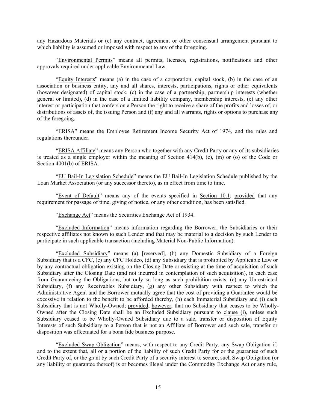 any Hazardous Materials or (e) any contract, agreement or other consensual arrangement pursuant towhich liability is assumed or imposed with respect to any of the foregoing.“Environmental Permits” means all permits, licenses, registrations, notifications and otherapprovals required under applicable Environmental Law.“Equity Interests” means (a) in the case of a corporation, capital stock, (b) in the case of anassociation or business entity, any and all shares, interests, participations, rights or other equivalents(however designated) of capital stock, (c) in the case of a partnership, partnership interests (whethergeneral or limited), (d) in the case of a limited liability company, membership interests, (e) any otherinterest or participation that confers on a Person the right to receive a share of the profits and losses of, ordistributions of assets of, the issuing Person and (f) any and all warrants, rights or options to purchase anyof the foregoing.“ERISA” means the Employee Retirement Income Security Act of 1974, and the rules andregulations thereunder.“ERISA Affiliate” means any Person who together with any Credit Party or any of its subsidiariesis treated as a single employer within the meaning of Section 414(b), (c), (m) or (o) of the Code orSection 4001(b) of ERISA.“EU Bail-In Legislation Schedule” means the EU Bail-In Legislation Schedule published by theLoan Market Association (or any successor thereto), as in effect from time to time.“Event of Default” means any of the events specified in Section 10.1; provided that anyrequirement for passage of time, giving of notice, or any other condition, has been satisfied.“Exchange Act” means the Securities Exchange Act of 1934.“Excluded Information” means information regarding the Borrower, the Subsidiaries or theirrespective affiliates not known to such Lender and that may be material to a decision by such Lender toparticipate in such applicable transaction (including Material Non-Public Information).“Excluded Subsidiary” means (a) [reserved], (b) any Domestic Subsidiary of a ForeignSubsidiary that is a CFC, (c) any CFC Holdco, (d) any Subsidiary that is prohibited by Applicable Law orby any contractual obligation existing on the Closing Date or existing at the time of acquisition of suchSubsidiary after the Closing Date (and not incurred in contemplation of such acquisition), in each casefrom Guaranteeing the Obligations, but only so long as such prohibition exists, (e) any UnrestrictedSubsidiary, (f) any Receivables Subsidiary, (g) any other Subsidiary with respect to which theAdministrative Agent and the Borrower mutually agree that the cost of providing a Guarantee would beexcessive in relation to the benefit to be afforded thereby, (h) each Immaterial Subsidiary and (i) eachSubsidiary that is not Wholly-Owned; provided, however, that no Subsidiary that ceases to be Wholly-Owned after the Closing Date shall be an Excluded Subsidiary pursuant to clause (i), unless suchSubsidiary ceased to be Wholly-Owned Subsidiary due to a sale, transfer or disposition of EquityInterests of such Subsidiary to a Person that is not an Affiliate of Borrower and such sale, transfer ordisposition was effectuated for a bona fide business purpose.“Excluded Swap Obligation” means, with respect to any Credit Party, any Swap Obligation if,and to the extent that, all or a portion of the liability of such Credit Party for or the guarantee of suchCredit Party of, or the grant by such Credit Party of a security interest to secure, such Swap Obligation (orany liability or guarantee thereof) is or becomes illegal under the Commodity Exchange Act or any rule,15