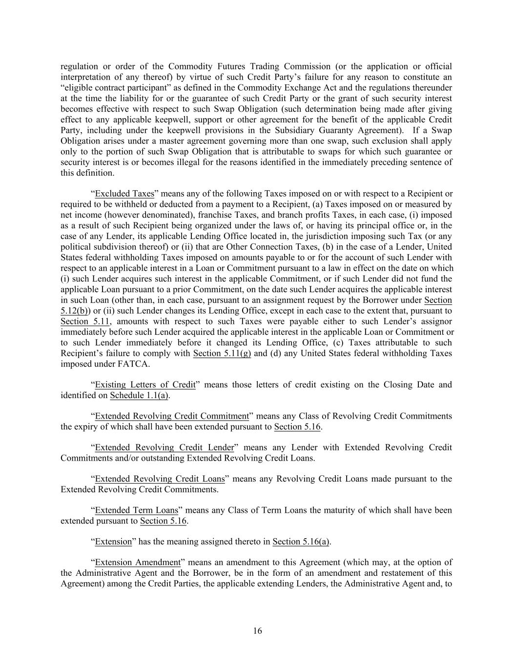 regulation or order of the Commodity Futures Trading Commission (or the application or officialinterpretation of any thereof) by virtue of such Credit Party’s failure for any reason to constitute an“eligible contract participant” as defined in the Commodity Exchange Act and the regulations thereunderat the time the liability for or the guarantee of such Credit Party or the grant of such security interestbecomes effective with respect to such Swap Obligation (such determination being made after givingeffect to any applicable keepwell, support or other agreement for the benefit of the applicable CreditParty, including under the keepwell provisions in the Subsidiary Guaranty Agreement). If a SwapObligation arises under a master agreement governing more than one swap, such exclusion shall applyonly to the portion of such Swap Obligation that is attributable to swaps for which such guarantee orsecurity interest is or becomes illegal for the reasons identified in the immediately preceding sentence ofthis definition.“Excluded Taxes” means any of the following Taxes imposed on or with respect to a Recipient orrequired to be withheld or deducted from a payment to a Recipient, (a) Taxes imposed on or measured bynet income (however denominated), franchise Taxes, and branch profits Taxes, in each case, (i) imposedas a result of such Recipient being organized under the laws of, or having its principal office or, in thecase of any Lender, its applicable Lending Office located in, the jurisdiction imposing such Tax (or anypolitical subdivision thereof) or (ii) that are Other Connection Taxes, (b) in the case of a Lender, UnitedStates federal withholding Taxes imposed on amounts payable to or for the account of such Lender withrespect to an applicable interest in a Loan or Commitment pursuant to a law in effect on the date on which(i) such Lender acquires such interest in the applicable Commitment, or if such Lender did not fund theapplicable Loan pursuant to a prior Commitment, on the date such Lender acquires the applicable interestin such Loan (other than, in each case, pursuant to an assignment request by the Borrower under Section5.12(b)) or (ii) such Lender changes its Lending Office, except in each case to the extent that, pursuant toSection 5.11, amounts with respect to such Taxes were payable either to such Lender’s assignorimmediately before such Lender acquired the applicable interest in the applicable Loan or Commitment orto such Lender immediately before it changed its Lending Office, (c) Taxes attributable to suchRecipient’s failure to comply with Section 5.11(g) and (d) any United States federal withholding Taxesimposed under FATCA.“Existing Letters of Credit” means those letters of credit existing on the Closing Date andidentified on Schedule 1.1(a).“Extended Revolving Credit Commitment” means any Class of Revolving Credit Commitmentsthe expiry of which shall have been extended pursuant to Section 5.16.“Extended Revolving Credit Lender” means any Lender with Extended Revolving CreditCommitments and/or outstanding Extended Revolving Credit Loans.“Extended Revolving Credit Loans” means any Revolving Credit Loans made pursuant to theExtended Revolving Credit Commitments.“Extended Term Loans” means any Class of Term Loans the maturity of which shall have beenextended pursuant to Section 5.16.“Extension” has the meaning assigned thereto in Section 5.16(a).“Extension Amendment” means an amendment to this Agreement (which may, at the option ofthe Administrative Agent and the Borrower, be in the form of an amendment and restatement of thisAgreement) among the Credit Parties, the applicable extending Lenders, the Administrative Agent and, to16