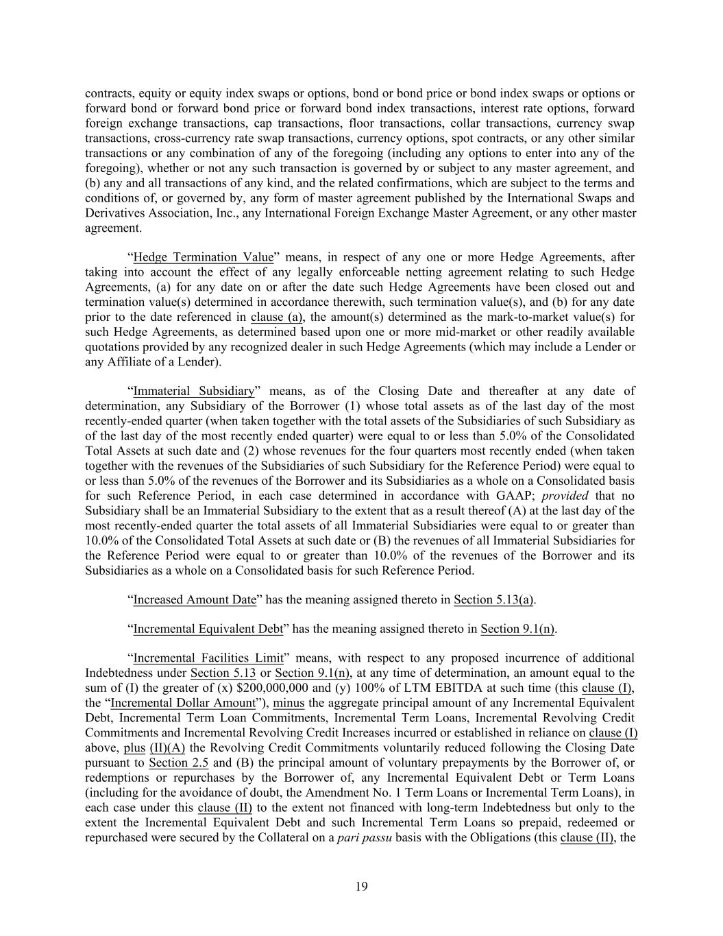 contracts, equity or equity index swaps or options, bond or bond price or bond index swaps or options orforward bond or forward bond price or forward bond index transactions, interest rate options, forwardforeign exchange transactions, cap transactions, floor transactions, collar transactions, currency swaptransactions, cross-currency rate swap transactions, currency options, spot contracts, or any other similartransactions or any combination of any of the foregoing (including any options to enter into any of theforegoing), whether or not any such transaction is governed by or subject to any master agreement, and(b) any and all transactions of any kind, and the related confirmations, which are subject to the terms andconditions of, or governed by, any form of master agreement published by the International Swaps andDerivatives Association, Inc., any International Foreign Exchange Master Agreement, or any other masteragreement.“Hedge Termination Value” means, in respect of any one or more Hedge Agreements, aftertaking into account the effect of any legally enforceable netting agreement relating to such HedgeAgreements, (a) for any date on or after the date such Hedge Agreements have been closed out andtermination value(s) determined in accordance therewith, such termination value(s), and (b) for any dateprior to the date referenced in clause (a), the amount(s) determined as the mark-to-market value(s) forsuch Hedge Agreements, as determined based upon one or more mid-market or other readily availablequotations provided by any recognized dealer in such Hedge Agreements (which may include a Lender orany Affiliate of a Lender).“Immaterial Subsidiary” means, as of the Closing Date and thereafter at any date ofdetermination, any Subsidiary of the Borrower (1) whose total assets as of the last day of the mostrecently-ended quarter (when taken together with the total assets of the Subsidiaries of such Subsidiary asof the last day of the most recently ended quarter) were equal to or less than 5.0% of the ConsolidatedTotal Assets at such date and (2) whose revenues for the four quarters most recently ended (when takentogether with the revenues of the Subsidiaries of such Subsidiary for the Reference Period) were equal toor less than 5.0% of the revenues of the Borrower and its Subsidiaries as a whole on a Consolidated basisfor such Reference Period, in each case determined in accordance with GAAP; provided that noSubsidiary shall be an Immaterial Subsidiary to the extent that as a result thereof (A) at the last day of themost recently-ended quarter the total assets of all Immaterial Subsidiaries were equal to or greater than10.0% of the Consolidated Total Assets at such date or (B) the revenues of all Immaterial Subsidiaries forthe Reference Period were equal to or greater than 10.0% of the revenues of the Borrower and itsSubsidiaries as a whole on a Consolidated basis for such Reference Period.“Increased Amount Date” has the meaning assigned thereto in Section 5.13(a).“Incremental Equivalent Debt” has the meaning assigned thereto in Section 9.1(n).“Incremental Facilities Limit” means, with respect to any proposed incurrence of additionalIndebtedness under Section 5.13 or Section 9.1(n), at any time of determination, an amount equal to thesum of (I) the greater of (x) $200,000,000 and (y) 100% of LTM EBITDA at such time (this clause (I),the “Incremental Dollar Amount”), minus the aggregate principal amount of any Incremental EquivalentDebt, Incremental Term Loan Commitments, Incremental Term Loans, Incremental Revolving CreditCommitments and Incremental Revolving Credit Increases incurred or established in reliance on clause (I)above, plus (II)(A) the Revolving Credit Commitments voluntarily reduced following the Closing Datepursuant to Section 2.5 and (B) the principal amount of voluntary prepayments by the Borrower of, orredemptions or repurchases by the Borrower of, any Incremental Equivalent Debt or Term Loans(including for the avoidance of doubt, the Amendment No. 1 Term Loans or Incremental Term Loans), ineach case under this clause (II) to the extent not financed with long-term Indebtedness but only to theextent the Incremental Equivalent Debt and such Incremental Term Loans so prepaid, redeemed orrepurchased were secured by the Collateral on a pari passu basis with the Obligations (this clause (II), the19