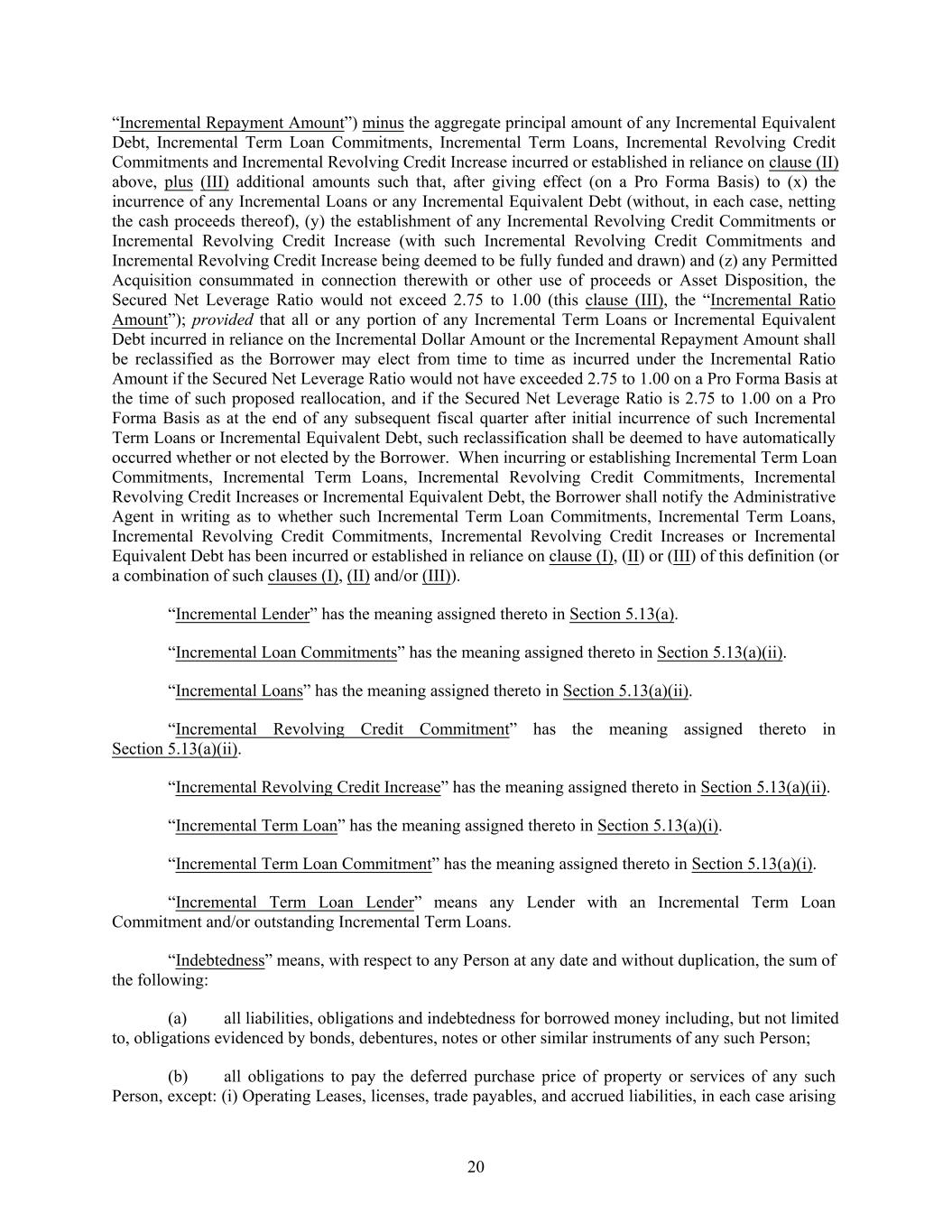 “Incremental Repayment Amount”) minus the aggregate principal amount of any Incremental EquivalentDebt, Incremental Term Loan Commitments, Incremental Term Loans, Incremental Revolving CreditCommitments and Incremental Revolving Credit Increase incurred or established in reliance on clause (II)above, plus (III) additional amounts such that, after giving effect (on a Pro Forma Basis) to (x) theincurrence of any Incremental Loans or any Incremental Equivalent Debt (without, in each case, nettingthe cash proceeds thereof), (y) the establishment of any Incremental Revolving Credit Commitments orIncremental Revolving Credit Increase (with such Incremental Revolving Credit Commitments andIncremental Revolving Credit Increase being deemed to be fully funded and drawn) and (z) any PermittedAcquisition consummated in connection therewith or other use of proceeds or Asset Disposition, theSecured Net Leverage Ratio would not exceed 2.75 to 1.00 (this clause (III), the “Incremental RatioAmount”); provided that all or any portion of any Incremental Term Loans or Incremental EquivalentDebt incurred in reliance on the Incremental Dollar Amount or the Incremental Repayment Amount shallbe reclassified as the Borrower may elect from time to time as incurred under the Incremental RatioAmount if the Secured Net Leverage Ratio would not have exceeded 2.75 to 1.00 on a Pro Forma Basis atthe time of such proposed reallocation, and if the Secured Net Leverage Ratio is 2.75 to 1.00 on a ProForma Basis as at the end of any subsequent fiscal quarter after initial incurrence of such IncrementalTerm Loans or Incremental Equivalent Debt, such reclassification shall be deemed to have automaticallyoccurred whether or not elected by the Borrower. When incurring or establishing Incremental Term LoanCommitments, Incremental Term Loans, Incremental Revolving Credit Commitments, IncrementalRevolving Credit Increases or Incremental Equivalent Debt, the Borrower shall notify the AdministrativeAgent in writing as to whether such Incremental Term Loan Commitments, Incremental Term Loans,Incremental Revolving Credit Commitments, Incremental Revolving Credit Increases or IncrementalEquivalent Debt has been incurred or established in reliance on clause (I), (II) or (III) of this definition (ora combination of such clauses (I), (II) and/or (III)).“Incremental Lender” has the meaning assigned thereto in Section 5.13(a).“Incremental Loan Commitments” has the meaning assigned thereto in Section 5.13(a)(ii).“Incremental Loans” has the meaning assigned thereto in Section 5.13(a)(ii).“Incremental Revolving Credit Commitment” has the meaning assigned thereto inSection 5.13(a)(ii).“Incremental Revolving Credit Increase” has the meaning assigned thereto in Section 5.13(a)(ii).“Incremental Term Loan” has the meaning assigned thereto in Section 5.13(a)(i).“Incremental Term Loan Commitment” has the meaning assigned thereto in Section 5.13(a)(i).“Incremental Term Loan Lender” means any Lender with an Incremental Term LoanCommitment and/or outstanding Incremental Term Loans.“Indebtedness” means, with respect to any Person at any date and without duplication, the sum ofthe following:(a) all liabilities, obligations and indebtedness for borrowed money including, but not limitedto, obligations evidenced by bonds, debentures, notes or other similar instruments of any such Person;(b) all obligations to pay the deferred purchase price of property or services of any suchPerson, except: (i) Operating Leases, licenses, trade payables, and accrued liabilities, in each case arising20
