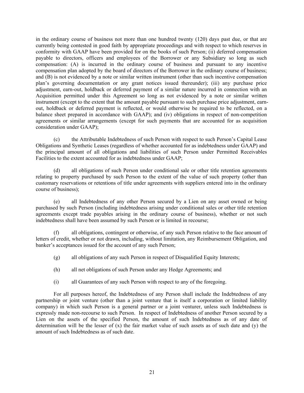 in the ordinary course of business not more than one hundred twenty (120) days past due, or that arecurrently being contested in good faith by appropriate proceedings and with respect to which reserves inconformity with GAAP have been provided for on the books of such Person; (ii) deferred compensationpayable to directors, officers and employees of the Borrower or any Subsidiary so long as suchcompensation: (A) is incurred in the ordinary course of business and pursuant to any incentivecompensation plan adopted by the board of directors of the Borrower in the ordinary course of business;and (B) is not evidenced by a note or similar written instrument (other than such incentive compensationplan’s governing documentation or any grant notices issued thereunder); (iii) any purchase priceadjustment, earn-out, holdback or deferred payment of a similar nature incurred in connection with anAcquisition permitted under this Agreement so long as not evidenced by a note or similar writteninstrument (except to the extent that the amount payable pursuant to such purchase price adjustment, earn-out, holdback or deferred payment is reflected, or would otherwise be required to be reflected, on abalance sheet prepared in accordance with GAAP); and (iv) obligations in respect of non-competitionagreements or similar arrangements (except for such payments that are accounted for as acquisitionconsideration under GAAP);(c) the Attributable Indebtedness of such Person with respect to such Person’s Capital LeaseObligations and Synthetic Leases (regardless of whether accounted for as indebtedness under GAAP) andthe principal amount of all obligations and liabilities of such Person under Permitted ReceivablesFacilities to the extent accounted for as indebtedness under GAAP;(d) all obligations of such Person under conditional sale or other title retention agreementsrelating to property purchased by such Person to the extent of the value of such property (other thancustomary reservations or retentions of title under agreements with suppliers entered into in the ordinarycourse of business);(e) all Indebtedness of any other Person secured by a Lien on any asset owned or beingpurchased by such Person (including indebtedness arising under conditional sales or other title retentionagreements except trade payables arising in the ordinary course of business), whether or not suchindebtedness shall have been assumed by such Person or is limited in recourse;(f) all obligations, contingent or otherwise, of any such Person relative to the face amount ofletters of credit, whether or not drawn, including, without limitation, any Reimbursement Obligation, andbanker’s acceptances issued for the account of any such Person;(g) all obligations of any such Person in respect of Disqualified Equity Interests;(h) all net obligations of such Person under any Hedge Agreements; and(i) all Guarantees of any such Person with respect to any of the foregoing.For all purposes hereof, the Indebtedness of any Person shall include the Indebtedness of anypartnership or joint venture (other than a joint venture that is itself a corporation or limited liabilitycompany) in which such Person is a general partner or a joint venturer, unless such Indebtedness isexpressly made non-recourse to such Person. In respect of Indebtedness of another Person secured by aLien on the assets of the specified Person, the amount of such Indebtedness as of any date ofdetermination will be the lesser of (x) the fair market value of such assets as of such date and (y) theamount of such Indebtedness as of such date. 21