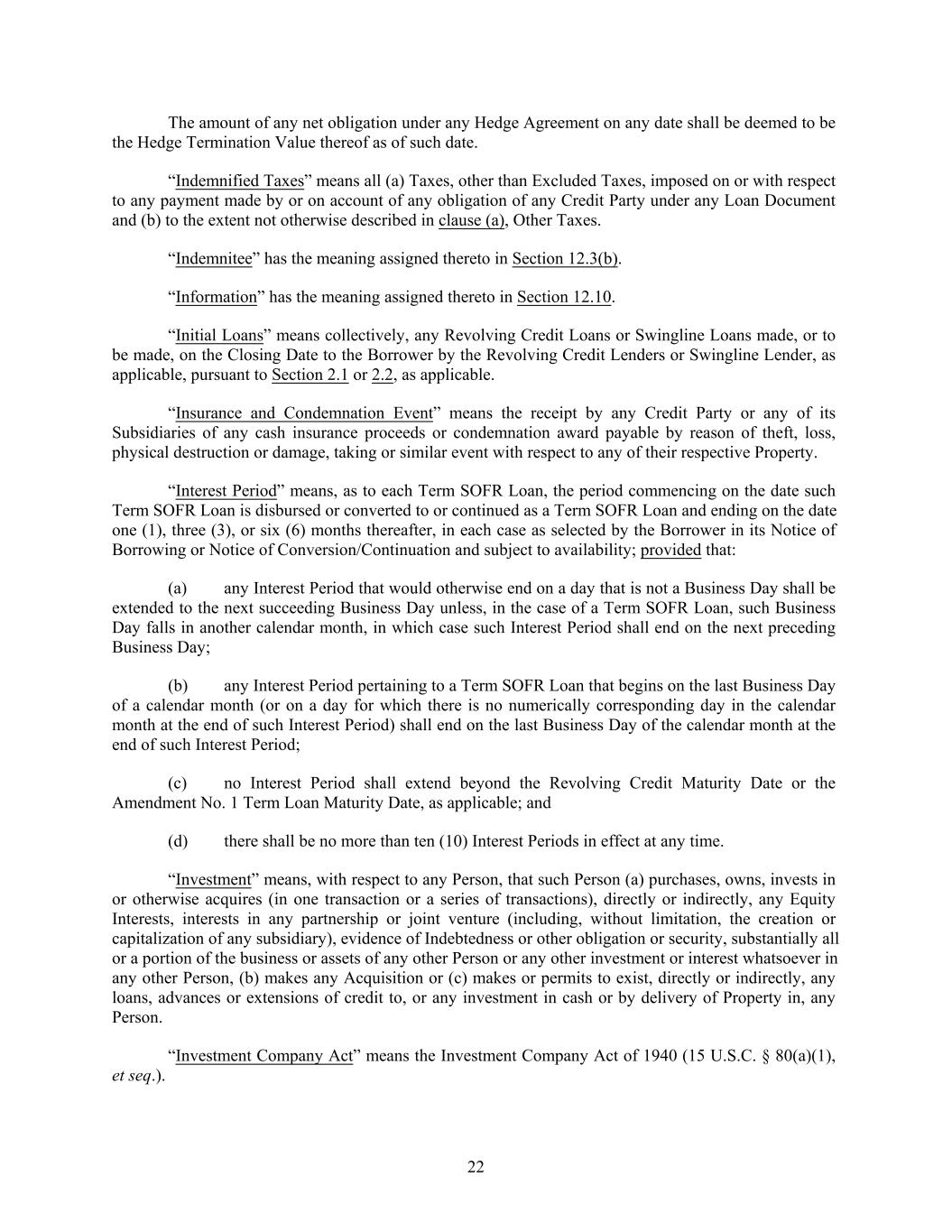 The amount of any net obligation under any Hedge Agreement on any date shall be deemed to bethe Hedge Termination Value thereof as of such date.“Indemnified Taxes” means all (a) Taxes, other than Excluded Taxes, imposed on or with respectto any payment made by or on account of any obligation of any Credit Party under any Loan Documentand (b) to the extent not otherwise described in clause (a), Other Taxes.“Indemnitee” has the meaning assigned thereto in Section 12.3(b).“Information” has the meaning assigned thereto in Section 12.10.“Initial Loans” means collectively, any Revolving Credit Loans or Swingline Loans made, or tobe made, on the Closing Date to the Borrower by the Revolving Credit Lenders or Swingline Lender, asapplicable, pursuant to Section 2.1 or 2.2, as applicable.“Insurance and Condemnation Event” means the receipt by any Credit Party or any of itsSubsidiaries of any cash insurance proceeds or condemnation award payable by reason of theft, loss,physical destruction or damage, taking or similar event with respect to any of their respective Property.“Interest Period” means, as to each Term SOFR Loan, the period commencing on the date suchTerm SOFR Loan is disbursed or converted to or continued as a Term SOFR Loan and ending on the dateone (1), three (3), or six (6) months thereafter, in each case as selected by the Borrower in its Notice ofBorrowing or Notice of Conversion/Continuation and subject to availability; provided that:(a) any Interest Period that would otherwise end on a day that is not a Business Day shall beextended to the next succeeding Business Day unless, in the case of a Term SOFR Loan, such BusinessDay falls in another calendar month, in which case such Interest Period shall end on the next precedingBusiness Day;(b) any Interest Period pertaining to a Term SOFR Loan that begins on the last Business Dayof a calendar month (or on a day for which there is no numerically corresponding day in the calendarmonth at the end of such Interest Period) shall end on the last Business Day of the calendar month at theend of such Interest Period;(c) no Interest Period shall extend beyond the Revolving Credit Maturity Date or theAmendment No. 1 Term Loan Maturity Date, as applicable; and(d) there shall be no more than ten (10) Interest Periods in effect at any time.“Investment” means, with respect to any Person, that such Person (a) purchases, owns, invests inor otherwise acquires (in one transaction or a series of transactions), directly or indirectly, any EquityInterests, interests in any partnership or joint venture (including, without limitation, the creation orcapitalization of any subsidiary), evidence of Indebtedness or other obligation or security, substantially allor a portion of the business or assets of any other Person or any other investment or interest whatsoever inany other Person, (b) makes any Acquisition or (c) makes or permits to exist, directly or indirectly, anyloans, advances or extensions of credit to, or any investment in cash or by delivery of Property in, anyPerson. “Investment Company Act” means the Investment Company Act of 1940 (15 U.S.C. § 80(a)(1),et seq.). 22