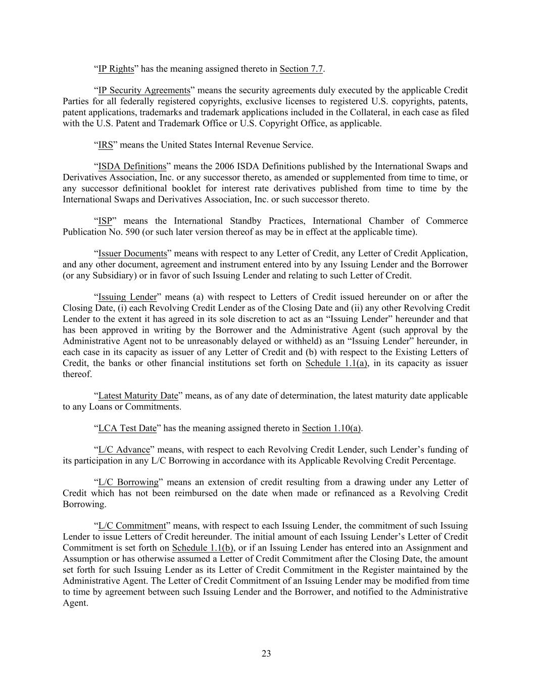 “IP Rights” has the meaning assigned thereto in Section 7.7.“IP Security Agreements” means the security agreements duly executed by the applicable CreditParties for all federally registered copyrights, exclusive licenses to registered U.S. copyrights, patents,patent applications, trademarks and trademark applications included in the Collateral, in each case as filedwith the U.S. Patent and Trademark Office or U.S. Copyright Office, as applicable.“IRS” means the United States Internal Revenue Service.“ISDA Definitions” means the 2006 ISDA Definitions published by the International Swaps andDerivatives Association, Inc. or any successor thereto, as amended or supplemented from time to time, orany successor definitional booklet for interest rate derivatives published from time to time by theInternational Swaps and Derivatives Association, Inc. or such successor thereto.“ISP” means the International Standby Practices, International Chamber of CommercePublication No. 590 (or such later version thereof as may be in effect at the applicable time).“Issuer Documents” means with respect to any Letter of Credit, any Letter of Credit Application,and any other document, agreement and instrument entered into by any Issuing Lender and the Borrower(or any Subsidiary) or in favor of such Issuing Lender and relating to such Letter of Credit.“Issuing Lender” means (a) with respect to Letters of Credit issued hereunder on or after theClosing Date, (i) each Revolving Credit Lender as of the Closing Date and (ii) any other Revolving CreditLender to the extent it has agreed in its sole discretion to act as an “Issuing Lender” hereunder and thathas been approved in writing by the Borrower and the Administrative Agent (such approval by theAdministrative Agent not to be unreasonably delayed or withheld) as an “Issuing Lender” hereunder, ineach case in its capacity as issuer of any Letter of Credit and (b) with respect to the Existing Letters ofCredit, the banks or other financial institutions set forth on Schedule 1.1(a), in its capacity as issuerthereof. “Latest Maturity Date” means, as of any date of determination, the latest maturity date applicableto any Loans or Commitments.“LCA Test Date” has the meaning assigned thereto in Section 1.10(a).“L/C Advance” means, with respect to each Revolving Credit Lender, such Lender’s funding ofits participation in any L/C Borrowing in accordance with its Applicable Revolving Credit Percentage.“L/C Borrowing” means an extension of credit resulting from a drawing under any Letter ofCredit which has not been reimbursed on the date when made or refinanced as a Revolving CreditBorrowing.“L/C Commitment” means, with respect to each Issuing Lender, the commitment of such IssuingLender to issue Letters of Credit hereunder. The initial amount of each Issuing Lender’s Letter of CreditCommitment is set forth on Schedule 1.1(b), or if an Issuing Lender has entered into an Assignment andAssumption or has otherwise assumed a Letter of Credit Commitment after the Closing Date, the amountset forth for such Issuing Lender as its Letter of Credit Commitment in the Register maintained by theAdministrative Agent. The Letter of Credit Commitment of an Issuing Lender may be modified from timeto time by agreement between such Issuing Lender and the Borrower, and notified to the AdministrativeAgent. 23