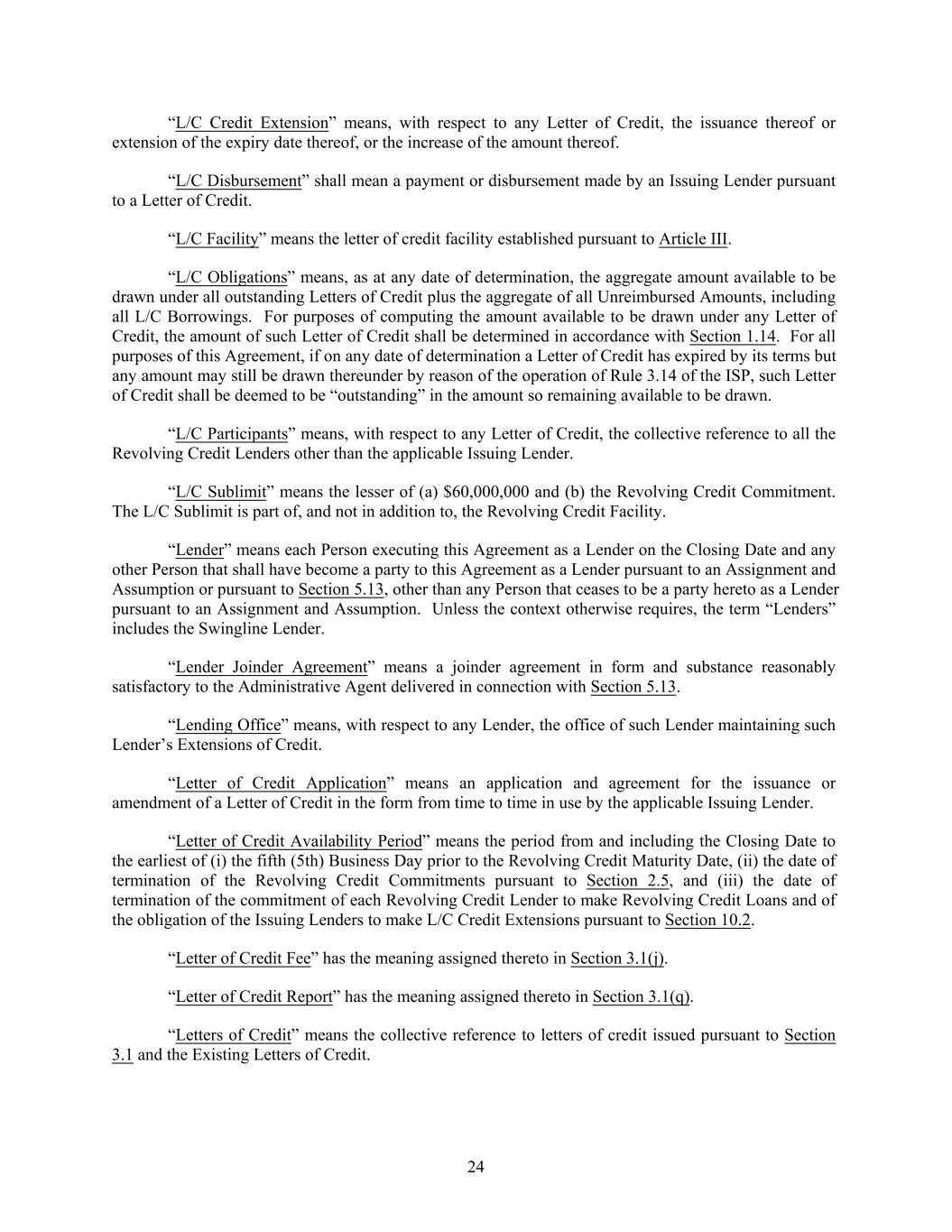 “L/C Credit Extension” means, with respect to any Letter of Credit, the issuance thereof orextension of the expiry date thereof, or the increase of the amount thereof.“L/C Disbursement” shall mean a payment or disbursement made by an Issuing Lender pursuantto a Letter of Credit.“L/C Facility” means the letter of credit facility established pursuant to Article III.“L/C Obligations” means, as at any date of determination, the aggregate amount available to bedrawn under all outstanding Letters of Credit plus the aggregate of all Unreimbursed Amounts, includingall L/C Borrowings. For purposes of computing the amount available to be drawn under any Letter ofCredit, the amount of such Letter of Credit shall be determined in accordance with Section 1.14. For allpurposes of this Agreement, if on any date of determination a Letter of Credit has expired by its terms butany amount may still be drawn thereunder by reason of the operation of Rule 3.14 of the ISP, such Letterof Credit shall be deemed to be “outstanding” in the amount so remaining available to be drawn.“L/C Participants” means, with respect to any Letter of Credit, the collective reference to all theRevolving Credit Lenders other than the applicable Issuing Lender.“L/C Sublimit” means the lesser of (a) $60,000,000 and (b) the Revolving Credit Commitment.The L/C Sublimit is part of, and not in addition to, the Revolving Credit Facility.“Lender” means each Person executing this Agreement as a Lender on the Closing Date and anyother Person that shall have become a party to this Agreement as a Lender pursuant to an Assignment andAssumption or pursuant to Section 5.13, other than any Person that ceases to be a party hereto as a Lenderpursuant to an Assignment and Assumption. Unless the context otherwise requires, the term “Lenders”includes the Swingline Lender.“Lender Joinder Agreement” means a joinder agreement in form and substance reasonablysatisfactory to the Administrative Agent delivered in connection with Section 5.13.“Lending Office” means, with respect to any Lender, the office of such Lender maintaining suchLender’s Extensions of Credit.“Letter of Credit Application” means an application and agreement for the issuance oramendment of a Letter of Credit in the form from time to time in use by the applicable Issuing Lender.“Letter of Credit Availability Period” means the period from and including the Closing Date tothe earliest of (i) the fifth (5th) Business Day prior to the Revolving Credit Maturity Date, (ii) the date oftermination of the Revolving Credit Commitments pursuant to Section 2.5, and (iii) the date oftermination of the commitment of each Revolving Credit Lender to make Revolving Credit Loans and ofthe obligation of the Issuing Lenders to make L/C Credit Extensions pursuant to Section 10.2.“Letter of Credit Fee” has the meaning assigned thereto in Section 3.1(j).“Letter of Credit Report” has the meaning assigned thereto in Section 3.1(q).“Letters of Credit” means the collective reference to letters of credit issued pursuant to Section3.1 and the Existing Letters of Credit. 24
