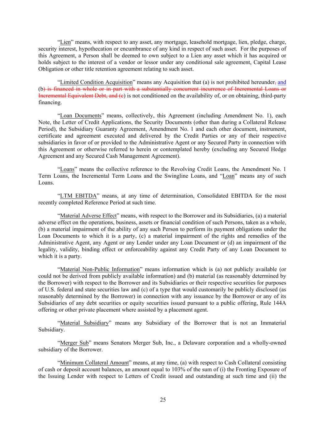 “Lien” means, with respect to any asset, any mortgage, leasehold mortgage, lien, pledge, charge,security interest, hypothecation or encumbrance of any kind in respect of such asset. For the purposes ofthis Agreement, a Person shall be deemed to own subject to a Lien any asset which it has acquired orholds subject to the interest of a vendor or lessor under any conditional sale agreement, Capital LeaseObligation or other title retention agreement relating to such asset.“Limited Condition Acquisition” means any Acquisition that (a) is not prohibited hereunder, and(b) is financed in whole or in part with a substantially concurrent incurrence of Incremental Loans orIncremental Equivalent Debt, and (c) is not conditioned on the availability of, or on obtaining, third-partyfinancing.“Loan Documents” means, collectively, this Agreement (including Amendment No. 1), eachNote, the Letter of Credit Applications, the Security Documents (other than during a Collateral ReleasePeriod), the Subsidiary Guaranty Agreement, Amendment No. 1 and each other document, instrument,certificate and agreement executed and delivered by the Credit Parties or any of their respectivesubsidiaries in favor of or provided to the Administrative Agent or any Secured Party in connection withthis Agreement or otherwise referred to herein or contemplated hereby (excluding any Secured HedgeAgreement and any Secured Cash Management Agreement).“Loans” means the collective reference to the Revolving Credit Loans, the Amendment No. 1Term Loans, the Incremental Term Loans and the Swingline Loans, and “Loan” means any of suchLoans. “LTM EBITDA” means, at any time of determination, Consolidated EBITDA for the mostrecently completed Reference Period at such time.“Material Adverse Effect” means, with respect to the Borrower and its Subsidiaries, (a) a materialadverse effect on the operations, business, assets or financial condition of such Persons, taken as a whole,(b) a material impairment of the ability of any such Person to perform its payment obligations under theLoan Documents to which it is a party, (c) a material impairment of the rights and remedies of theAdministrative Agent, any Agent or any Lender under any Loan Document or (d) an impairment of thelegality, validity, binding effect or enforceability against any Credit Party of any Loan Document towhich it is a party.“Material Non-Public Information” means information which is (a) not publicly available (orcould not be derived from publicly available information) and (b) material (as reasonably determined bythe Borrower) with respect to the Borrower and its Subsidiaries or their respective securities for purposesof U.S. federal and state securities law and (c) of a type that would customarily be publicly disclosed (asreasonably determined by the Borrower) in connection with any issuance by the Borrower or any of itsSubsidiaries of any debt securities or equity securities issued pursuant to a public offering, Rule 144Aoffering or other private placement where assisted by a placement agent.“Material Subsidiary” means any Subsidiary of the Borrower that is not an ImmaterialSubsidiary.“Merger Sub” means Senators Merger Sub, Inc., a Delaware corporation and a wholly-ownedsubsidiary of the Borrower.“Minimum Collateral Amount” means, at any time, (a) with respect to Cash Collateral consistingof cash or deposit account balances, an amount equal to 103% of the sum of (i) the Fronting Exposure ofthe Issuing Lender with respect to Letters of Credit issued and outstanding at such time and (ii) the25