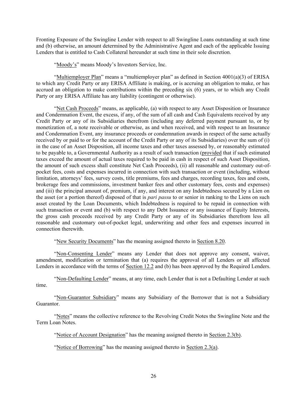Fronting Exposure of the Swingline Lender with respect to all Swingline Loans outstanding at such timeand (b) otherwise, an amount determined by the Administrative Agent and each of the applicable IssuingLenders that is entitled to Cash Collateral hereunder at such time in their sole discretion.“Moody’s” means Moody’s Investors Service, Inc.“Multiemployer Plan” means a “multiemployer plan” as defined in Section 4001(a)(3) of ERISAto which any Credit Party or any ERISA Affiliate is making, or is accruing an obligation to make, or hasaccrued an obligation to make contributions within the preceding six (6) years, or to which any CreditParty or any ERISA Affiliate has any liability (contingent or otherwise).“Net Cash Proceeds” means, as applicable, (a) with respect to any Asset Disposition or Insuranceand Condemnation Event, the excess, if any, of the sum of all cash and Cash Equivalents received by anyCredit Party or any of its Subsidiaries therefrom (including any deferred payment pursuant to, or bymonetization of, a note receivable or otherwise, as and when received, and with respect to an Insuranceand Condemnation Event, any insurance proceeds or condemnation awards in respect of the same actuallyreceived by or paid to or for the account of the Credit Party or any of its Subsidiaries) over the sum of (i)in the case of an Asset Disposition, all income taxes and other taxes assessed by, or reasonably estimatedto be payable to, a Governmental Authority as a result of such transaction (provided that if such estimatedtaxes exceed the amount of actual taxes required to be paid in cash in respect of such Asset Disposition,the amount of such excess shall constitute Net Cash Proceeds), (ii) all reasonable and customary out-of-pocket fees, costs and expenses incurred in connection with such transaction or event (including, withoutlimitation, attorneys’ fees, survey costs, title premiums, fees and charges, recording taxes, fees and costs,brokerage fees and commissions, investment banker fees and other customary fees, costs and expenses)and (iii) the principal amount of, premium, if any, and interest on any Indebtedness secured by a Lien onthe asset (or a portion thereof) disposed of that is pari passu to or senior in ranking to the Liens on suchasset created by the Loan Documents, which Indebtedness is required to be repaid in connection withsuch transaction or event and (b) with respect to any Debt Issuance or any issuance of Equity Interests,the gross cash proceeds received by any Credit Party or any of its Subsidiaries therefrom less allreasonable and customary out-of-pocket legal, underwriting and other fees and expenses incurred inconnection therewith.“New Security Documents” has the meaning assigned thereto in Section 8.20.“Non-Consenting Lender” means any Lender that does not approve any consent, waiver,amendment, modification or termination that (a) requires the approval of all Lenders or all affectedLenders in accordance with the terms of Section 12.2 and (b) has been approved by the Required Lenders.“Non-Defaulting Lender” means, at any time, each Lender that is not a Defaulting Lender at suchtime. “Non-Guarantor Subsidiary” means any Subsidiary of the Borrower that is not a SubsidiaryGuarantor.“Notes” means the collective reference to the Revolving Credit Notes the Swingline Note and theTerm Loan Notes.“Notice of Account Designation” has the meaning assigned thereto in Section 2.3(b).“Notice of Borrowing” has the meaning assigned thereto in Section 2.3(a).26