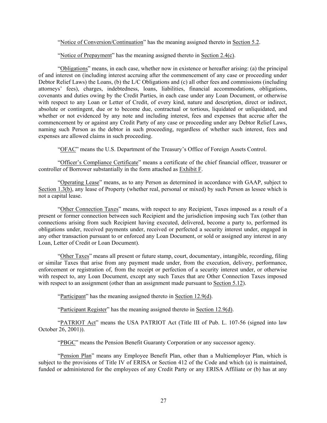 “Notice of Conversion/Continuation” has the meaning assigned thereto in Section 5.2.“Notice of Prepayment” has the meaning assigned thereto in Section 2.4(c).“Obligations” means, in each case, whether now in existence or hereafter arising: (a) the principalof and interest on (including interest accruing after the commencement of any case or proceeding underDebtor Relief Laws) the Loans, (b) the L/C Obligations and (c) all other fees and commissions (includingattorneys’ fees), charges, indebtedness, loans, liabilities, financial accommodations, obligations,covenants and duties owing by the Credit Parties, in each case under any Loan Document, or otherwisewith respect to any Loan or Letter of Credit, of every kind, nature and description, direct or indirect,absolute or contingent, due or to become due, contractual or tortious, liquidated or unliquidated, andwhether or not evidenced by any note and including interest, fees and expenses that accrue after thecommencement by or against any Credit Party of any case or proceeding under any Debtor Relief Laws,naming such Person as the debtor in such proceeding, regardless of whether such interest, fees andexpenses are allowed claims in such proceeding.“OFAC” means the U.S. Department of the Treasury’s Office of Foreign Assets Control.“Officer’s Compliance Certificate” means a certificate of the chief financial officer, treasurer orcontroller of Borrower substantially in the form attached as Exhibit F.“Operating Lease” means, as to any Person as determined in accordance with GAAP, subject toSection 1.3(b), any lease of Property (whether real, personal or mixed) by such Person as lessee which isnot a capital lease.“Other Connection Taxes” means, with respect to any Recipient, Taxes imposed as a result of apresent or former connection between such Recipient and the jurisdiction imposing such Tax (other thanconnections arising from such Recipient having executed, delivered, become a party to, performed itsobligations under, received payments under, received or perfected a security interest under, engaged inany other transaction pursuant to or enforced any Loan Document, or sold or assigned any interest in anyLoan, Letter of Credit or Loan Document).“Other Taxes” means all present or future stamp, court, documentary, intangible, recording, filingor similar Taxes that arise from any payment made under, from the execution, delivery, performance,enforcement or registration of, from the receipt or perfection of a security interest under, or otherwisewith respect to, any Loan Document, except any such Taxes that are Other Connection Taxes imposedwith respect to an assignment (other than an assignment made pursuant to Section 5.12).“Participant” has the meaning assigned thereto in Section 12.9(d).“Participant Register” has the meaning assigned thereto in Section 12.9(d).“PATRIOT Act” means the USA PATRIOT Act (Title III of Pub. L. 107-56 (signed into lawOctober 26, 2001)).“PBGC” means the Pension Benefit Guaranty Corporation or any successor agency.“Pension Plan” means any Employee Benefit Plan, other than a Multiemployer Plan, which issubject to the provisions of Title IV of ERISA or Section 412 of the Code and which (a) is maintained,funded or administered for the employees of any Credit Party or any ERISA Affiliate or (b) has at any27