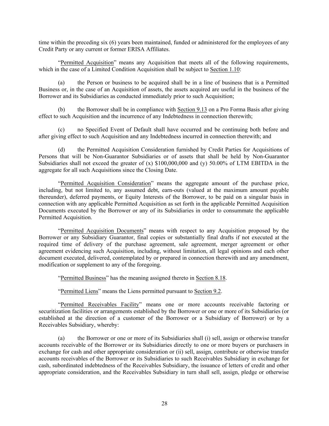 time within the preceding six (6) years been maintained, funded or administered for the employees of anyCredit Party or any current or former ERISA Affiliates.“Permitted Acquisition” means any Acquisition that meets all of the following requirements,which in the case of a Limited Condition Acquisition shall be subject to Section 1.10:(a) the Person or business to be acquired shall be in a line of business that is a PermittedBusiness or, in the case of an Acquisition of assets, the assets acquired are useful in the business of theBorrower and its Subsidiaries as conducted immediately prior to such Acquisition;(b) the Borrower shall be in compliance with Section 9.13 on a Pro Forma Basis after givingeffect to such Acquisition and the incurrence of any Indebtedness in connection therewith;(c) no Specified Event of Default shall have occurred and be continuing both before andafter giving effect to such Acquisition and any Indebtedness incurred in connection therewith; and(d) the Permitted Acquisition Consideration furnished by Credit Parties for Acquisitions ofPersons that will be Non-Guarantor Subsidiaries or of assets that shall be held by Non-GuarantorSubsidiaries shall not exceed the greater of (x) $100,000,000 and (y) 50.00% of LTM EBITDA in theaggregate for all such Acquisitions since the Closing Date.“Permitted Acquisition Consideration” means the aggregate amount of the purchase price,including, but not limited to, any assumed debt, earn-outs (valued at the maximum amount payablethereunder), deferred payments, or Equity Interests of the Borrower, to be paid on a singular basis inconnection with any applicable Permitted Acquisition as set forth in the applicable Permitted AcquisitionDocuments executed by the Borrower or any of its Subsidiaries in order to consummate the applicablePermitted Acquisition.“Permitted Acquisition Documents” means with respect to any Acquisition proposed by theBorrower or any Subsidiary Guarantor, final copies or substantially final drafts if not executed at therequired time of delivery of the purchase agreement, sale agreement, merger agreement or otheragreement evidencing such Acquisition, including, without limitation, all legal opinions and each otherdocument executed, delivered, contemplated by or prepared in connection therewith and any amendment,modification or supplement to any of the foregoing.“Permitted Business” has the meaning assigned thereto in Section 8.18.“Permitted Liens” means the Liens permitted pursuant to Section 9.2.“Permitted Receivables Facility” means one or more accounts receivable factoring orsecuritization facilities or arrangements established by the Borrower or one or more of its Subsidiaries (orestablished at the direction of a customer of the Borrower or a Subsidiary of Borrower) or by aReceivables Subsidiary, whereby:(a) the Borrower or one or more of its Subsidiaries shall (i) sell, assign or otherwise transferaccounts receivable of the Borrower or its Subsidiaries directly to one or more buyers or purchasers inexchange for cash and other appropriate consideration or (ii) sell, assign, contribute or otherwise transferaccounts receivables of the Borrower or its Subsidiaries to such Receivables Subsidiary in exchange forcash, subordinated indebtedness of the Receivables Subsidiary, the issuance of letters of credit and otherappropriate consideration, and the Receivables Subsidiary in turn shall sell, assign, pledge or otherwise28