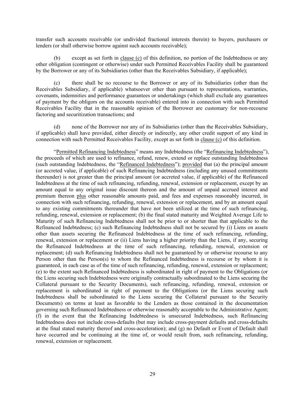 transfer such accounts receivable (or undivided fractional interests therein) to buyers, purchasers orlenders (or shall otherwise borrow against such accounts receivable);(b) except as set forth in clause (c) of this definition, no portion of the Indebtedness or anyother obligation (contingent or otherwise) under such Permitted Receivables Facility shall be guaranteedby the Borrower or any of its Subsidiaries (other than the Receivables Subsidiary, if applicable);(c) there shall be no recourse to the Borrower or any of its Subsidiaries (other than theReceivables Subsidiary, if applicable) whatsoever other than pursuant to representations, warranties,covenants, indemnities and performance guarantees or undertakings (which shall exclude any guaranteesof payment by the obligors on the accounts receivable) entered into in connection with such PermittedReceivables Facility that in the reasonable opinion of the Borrower are customary for non-recoursefactoring and securitization transactions; and(d) none of the Borrower nor any of its Subsidiaries (other than the Receivables Subsidiary,if applicable) shall have provided, either directly or indirectly, any other credit support of any kind inconnection with such Permitted Receivables Facility, except as set forth in clause (c) of this definition.“Permitted Refinancing Indebtedness” means any Indebtedness (the “Refinancing Indebtedness”),the proceeds of which are used to refinance, refund, renew, extend or replace outstanding Indebtedness(such outstanding Indebtedness, the “Refinanced Indebtedness”); provided that (a) the principal amount(or accreted value, if applicable) of such Refinancing Indebtedness (including any unused commitmentsthereunder) is not greater than the principal amount (or accreted value, if applicable) of the RefinancedIndebtedness at the time of such refinancing, refunding, renewal, extension or replacement, except by anamount equal to any original issue discount thereon and the amount of unpaid accrued interest andpremium thereon plus other reasonable amounts paid, and fees and expenses reasonably incurred, inconnection with such refinancing, refunding, renewal, extension or replacement, and by an amount equalto any existing commitments thereunder that have not been utilized at the time of such refinancing,refunding, renewal, extension or replacement; (b) the final stated maturity and Weighted Average Life toMaturity of such Refinancing Indebtedness shall not be prior to or shorter than that applicable to theRefinanced Indebtedness; (c) such Refinancing Indebtedness shall not be secured by (i) Liens on assetsother than assets securing the Refinanced Indebtedness at the time of such refinancing, refunding,renewal, extension or replacement or (ii) Liens having a higher priority than the Liens, if any, securingthe Refinanced Indebtedness at the time of such refinancing, refunding, renewal, extension orreplacement; (d) such Refinancing Indebtedness shall not be guaranteed by or otherwise recourse to anyPerson other than the Person(s) to whom the Refinanced Indebtedness is recourse or by whom it isguaranteed, in each case as of the time of such refinancing, refunding, renewal, extension or replacement;(e) to the extent such Refinanced Indebtedness is subordinated in right of payment to the Obligations (orthe Liens securing such Indebtedness were originally contractually subordinated to the Liens securing theCollateral pursuant to the Security Documents), such refinancing, refunding, renewal, extension orreplacement is subordinated in right of payment to the Obligations (or the Liens securing suchIndebtedness shall be subordinated to the Liens securing the Collateral pursuant to the SecurityDocuments) on terms at least as favorable to the Lenders as those contained in the documentationgoverning such Refinanced Indebtedness or otherwise reasonably acceptable to the Administrative Agent;(f) in the event that the Refinancing Indebtedness is unsecured Indebtedness, such RefinancingIndebtedness does not include cross-defaults (but may include cross-payment defaults and cross-defaultsat the final stated maturity thereof and cross-acceleration); and (g) no Default or Event of Default shallhave occurred and be continuing at the time of, or would result from, such refinancing, refunding,renewal, extension or replacement. 29