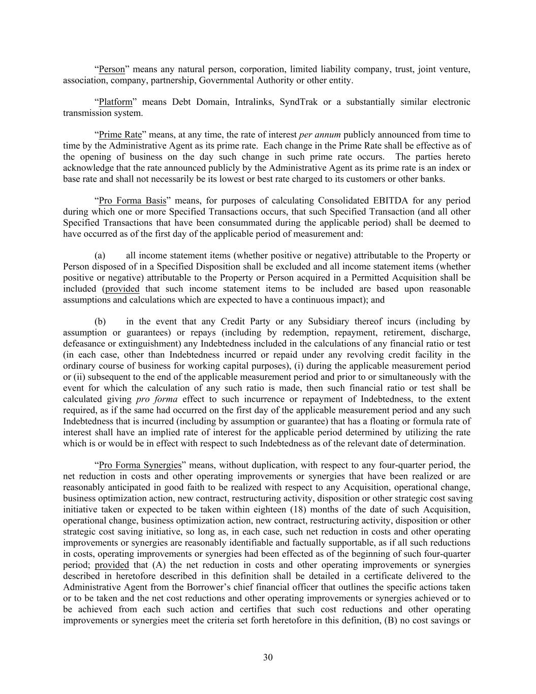 “Person” means any natural person, corporation, limited liability company, trust, joint venture,association, company, partnership, Governmental Authority or other entity.“Platform” means Debt Domain, Intralinks, SyndTrak or a substantially similar electronictransmission system.“Prime Rate” means, at any time, the rate of interest per annum publicly announced from time totime by the Administrative Agent as its prime rate. Each change in the Prime Rate shall be effective as ofthe opening of business on the day such change in such prime rate occurs. The parties heretoacknowledge that the rate announced publicly by the Administrative Agent as its prime rate is an index orbase rate and shall not necessarily be its lowest or best rate charged to its customers or other banks.“Pro Forma Basis” means, for purposes of calculating Consolidated EBITDA for any periodduring which one or more Specified Transactions occurs, that such Specified Transaction (and all otherSpecified Transactions that have been consummated during the applicable period) shall be deemed tohave occurred as of the first day of the applicable period of measurement and:(a) all income statement items (whether positive or negative) attributable to the Property orPerson disposed of in a Specified Disposition shall be excluded and all income statement items (whetherpositive or negative) attributable to the Property or Person acquired in a Permitted Acquisition shall beincluded (provided that such income statement items to be included are based upon reasonableassumptions and calculations which are expected to have a continuous impact); and(b) in the event that any Credit Party or any Subsidiary thereof incurs (including byassumption or guarantees) or repays (including by redemption, repayment, retirement, discharge,defeasance or extinguishment) any Indebtedness included in the calculations of any financial ratio or test(in each case, other than Indebtedness incurred or repaid under any revolving credit facility in theordinary course of business for working capital purposes), (i) during the applicable measurement periodor (ii) subsequent to the end of the applicable measurement period and prior to or simultaneously with theevent for which the calculation of any such ratio is made, then such financial ratio or test shall becalculated giving pro forma effect to such incurrence or repayment of Indebtedness, to the extentrequired, as if the same had occurred on the first day of the applicable measurement period and any suchIndebtedness that is incurred (including by assumption or guarantee) that has a floating or formula rate ofinterest shall have an implied rate of interest for the applicable period determined by utilizing the ratewhich is or would be in effect with respect to such Indebtedness as of the relevant date of determination.“Pro Forma Synergies” means, without duplication, with respect to any four-quarter period, thenet reduction in costs and other operating improvements or synergies that have been realized or arereasonably anticipated in good faith to be realized with respect to any Acquisition, operational change,business optimization action, new contract, restructuring activity, disposition or other strategic cost savinginitiative taken or expected to be taken within eighteen (18) months of the date of such Acquisition,operational change, business optimization action, new contract, restructuring activity, disposition or otherstrategic cost saving initiative, so long as, in each case, such net reduction in costs and other operatingimprovements or synergies are reasonably identifiable and factually supportable, as if all such reductionsin costs, operating improvements or synergies had been effected as of the beginning of such four-quarterperiod; provided that (A) the net reduction in costs and other operating improvements or synergiesdescribed in heretofore described in this definition shall be detailed in a certificate delivered to theAdministrative Agent from the Borrower’s chief financial officer that outlines the specific actions takenor to be taken and the net cost reductions and other operating improvements or synergies achieved or tobe achieved from each such action and certifies that such cost reductions and other operatingimprovements or synergies meet the criteria set forth heretofore in this definition, (B) no cost savings or30