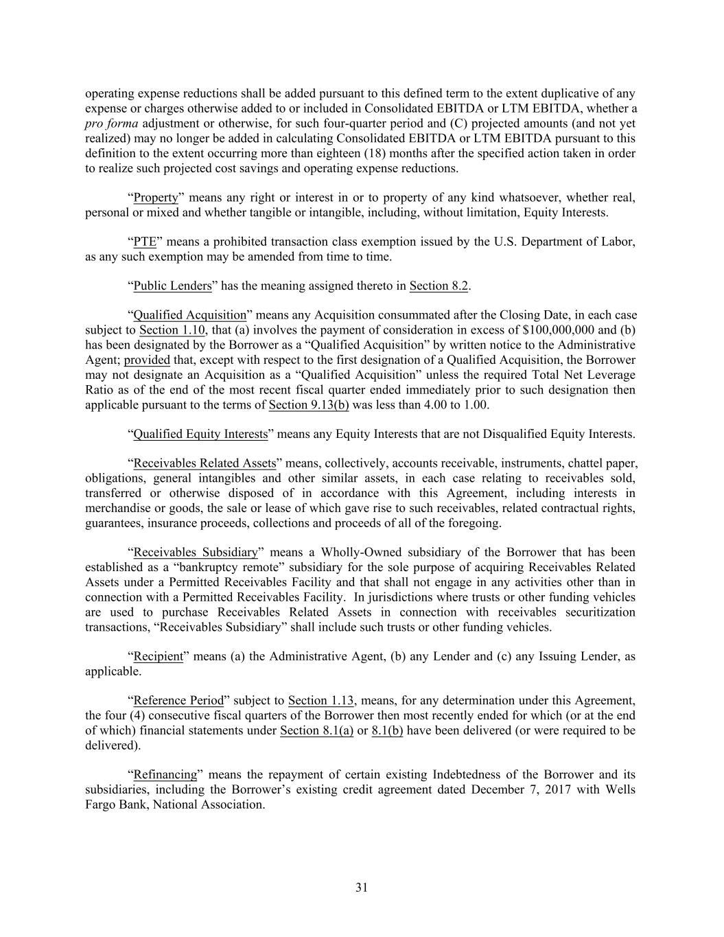 operating expense reductions shall be added pursuant to this defined term to the extent duplicative of anyexpense or charges otherwise added to or included in Consolidated EBITDA or LTM EBITDA, whether apro forma adjustment or otherwise, for such four-quarter period and (C) projected amounts (and not yetrealized) may no longer be added in calculating Consolidated EBITDA or LTM EBITDA pursuant to thisdefinition to the extent occurring more than eighteen (18) months after the specified action taken in orderto realize such projected cost savings and operating expense reductions.“Property” means any right or interest in or to property of any kind whatsoever, whether real,personal or mixed and whether tangible or intangible, including, without limitation, Equity Interests.“PTE” means a prohibited transaction class exemption issued by the U.S. Department of Labor,as any such exemption may be amended from time to time.“Public Lenders” has the meaning assigned thereto in Section 8.2.“Qualified Acquisition” means any Acquisition consummated after the Closing Date, in each casesubject to Section 1.10, that (a) involves the payment of consideration in excess of $100,000,000 and (b)has been designated by the Borrower as a “Qualified Acquisition” by written notice to the AdministrativeAgent; provided that, except with respect to the first designation of a Qualified Acquisition, the Borrowermay not designate an Acquisition as a “Qualified Acquisition” unless the required Total Net LeverageRatio as of the end of the most recent fiscal quarter ended immediately prior to such designation thenapplicable pursuant to the terms of Section 9.13(b) was less than 4.00 to 1.00.“Qualified Equity Interests” means any Equity Interests that are not Disqualified Equity Interests.“Receivables Related Assets” means, collectively, accounts receivable, instruments, chattel paper,obligations, general intangibles and other similar assets, in each case relating to receivables sold,transferred or otherwise disposed of in accordance with this Agreement, including interests inmerchandise or goods, the sale or lease of which gave rise to such receivables, related contractual rights,guarantees, insurance proceeds, collections and proceeds of all of the foregoing.“Receivables Subsidiary” means a Wholly-Owned subsidiary of the Borrower that has beenestablished as a “bankruptcy remote” subsidiary for the sole purpose of acquiring Receivables RelatedAssets under a Permitted Receivables Facility and that shall not engage in any activities other than inconnection with a Permitted Receivables Facility. In jurisdictions where trusts or other funding vehiclesare used to purchase Receivables Related Assets in connection with receivables securitizationtransactions, “Receivables Subsidiary” shall include such trusts or other funding vehicles.“Recipient” means (a) the Administrative Agent, (b) any Lender and (c) any Issuing Lender, asapplicable.“Reference Period” subject to Section 1.13, means, for any determination under this Agreement,the four (4) consecutive fiscal quarters of the Borrower then most recently ended for which (or at the endof which) financial statements under Section 8.1(a) or 8.1(b) have been delivered (or were required to bedelivered).“Refinancing” means the repayment of certain existing Indebtedness of the Borrower and itssubsidiaries, including the Borrower’s existing credit agreement dated December 7, 2017 with WellsFargo Bank, National Association. 31