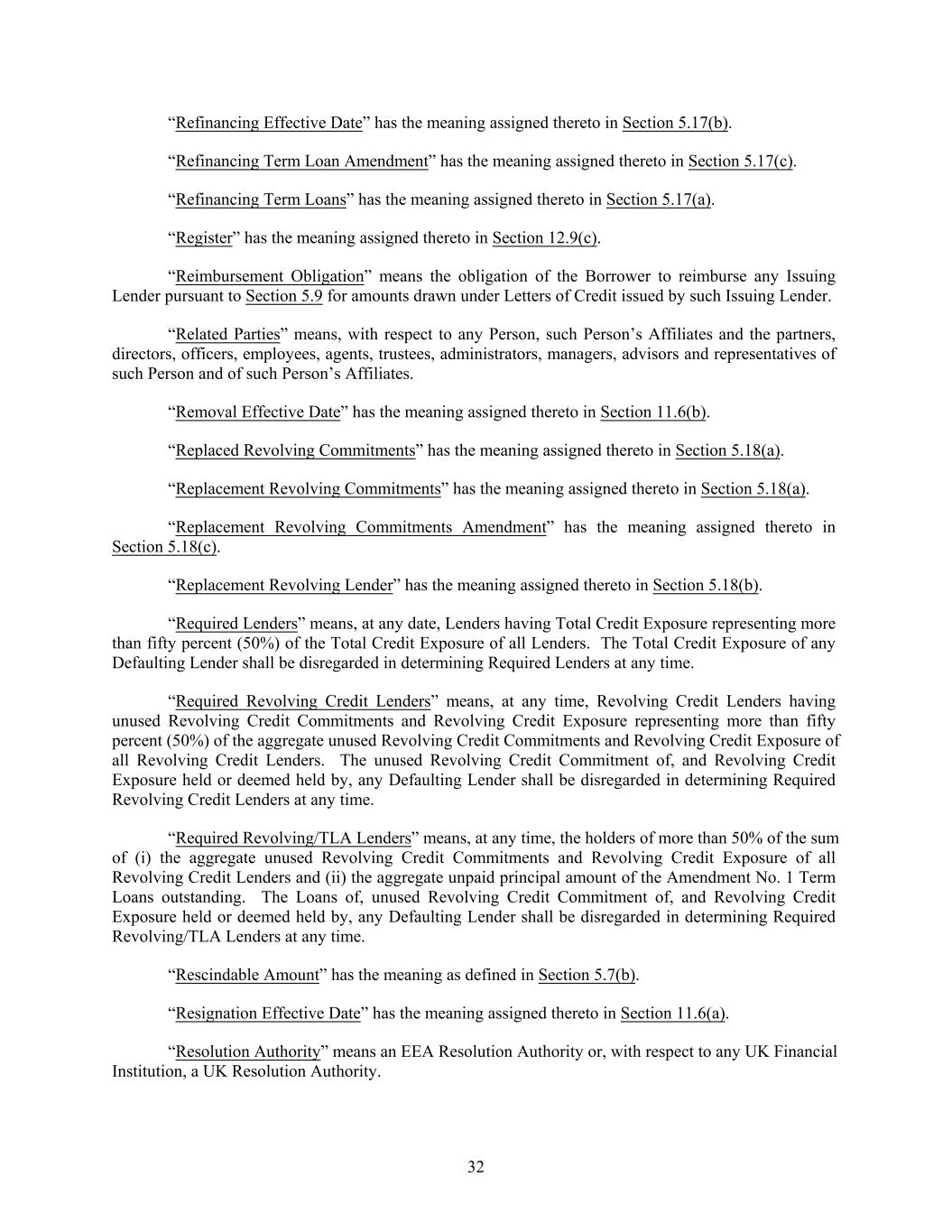 “Refinancing Effective Date” has the meaning assigned thereto in Section 5.17(b).“Refinancing Term Loan Amendment” has the meaning assigned thereto in Section 5.17(c).“Refinancing Term Loans” has the meaning assigned thereto in Section 5.17(a).“Register” has the meaning assigned thereto in Section 12.9(c).“Reimbursement Obligation” means the obligation of the Borrower to reimburse any IssuingLender pursuant to Section 5.9 for amounts drawn under Letters of Credit issued by such Issuing Lender.“Related Parties” means, with respect to any Person, such Person’s Affiliates and the partners,directors, officers, employees, agents, trustees, administrators, managers, advisors and representatives ofsuch Person and of such Person’s Affiliates.“Removal Effective Date” has the meaning assigned thereto in Section 11.6(b).“Replaced Revolving Commitments” has the meaning assigned thereto in Section 5.18(a).“Replacement Revolving Commitments” has the meaning assigned thereto in Section 5.18(a).“Replacement Revolving Commitments Amendment” has the meaning assigned thereto inSection 5.18(c).“Replacement Revolving Lender” has the meaning assigned thereto in Section 5.18(b).“Required Lenders” means, at any date, Lenders having Total Credit Exposure representing morethan fifty percent (50%) of the Total Credit Exposure of all Lenders. The Total Credit Exposure of anyDefaulting Lender shall be disregarded in determining Required Lenders at any time.“Required Revolving Credit Lenders” means, at any time, Revolving Credit Lenders havingunused Revolving Credit Commitments and Revolving Credit Exposure representing more than fiftypercent (50%) of the aggregate unused Revolving Credit Commitments and Revolving Credit Exposure ofall Revolving Credit Lenders. The unused Revolving Credit Commitment of, and Revolving CreditExposure held or deemed held by, any Defaulting Lender shall be disregarded in determining RequiredRevolving Credit Lenders at any time.“Required Revolving/TLA Lenders” means, at any time, the holders of more than 50% of the sumof (i) the aggregate unused Revolving Credit Commitments and Revolving Credit Exposure of allRevolving Credit Lenders and (ii) the aggregate unpaid principal amount of the Amendment No. 1 TermLoans outstanding. The Loans of, unused Revolving Credit Commitment of, and Revolving CreditExposure held or deemed held by, any Defaulting Lender shall be disregarded in determining RequiredRevolving/TLA Lenders at any time.“Rescindable Amount” has the meaning as defined in Section 5.7(b).“Resignation Effective Date” has the meaning assigned thereto in Section 11.6(a).“Resolution Authority” means an EEA Resolution Authority or, with respect to any UK FinancialInstitution, a UK Resolution Authority. 32