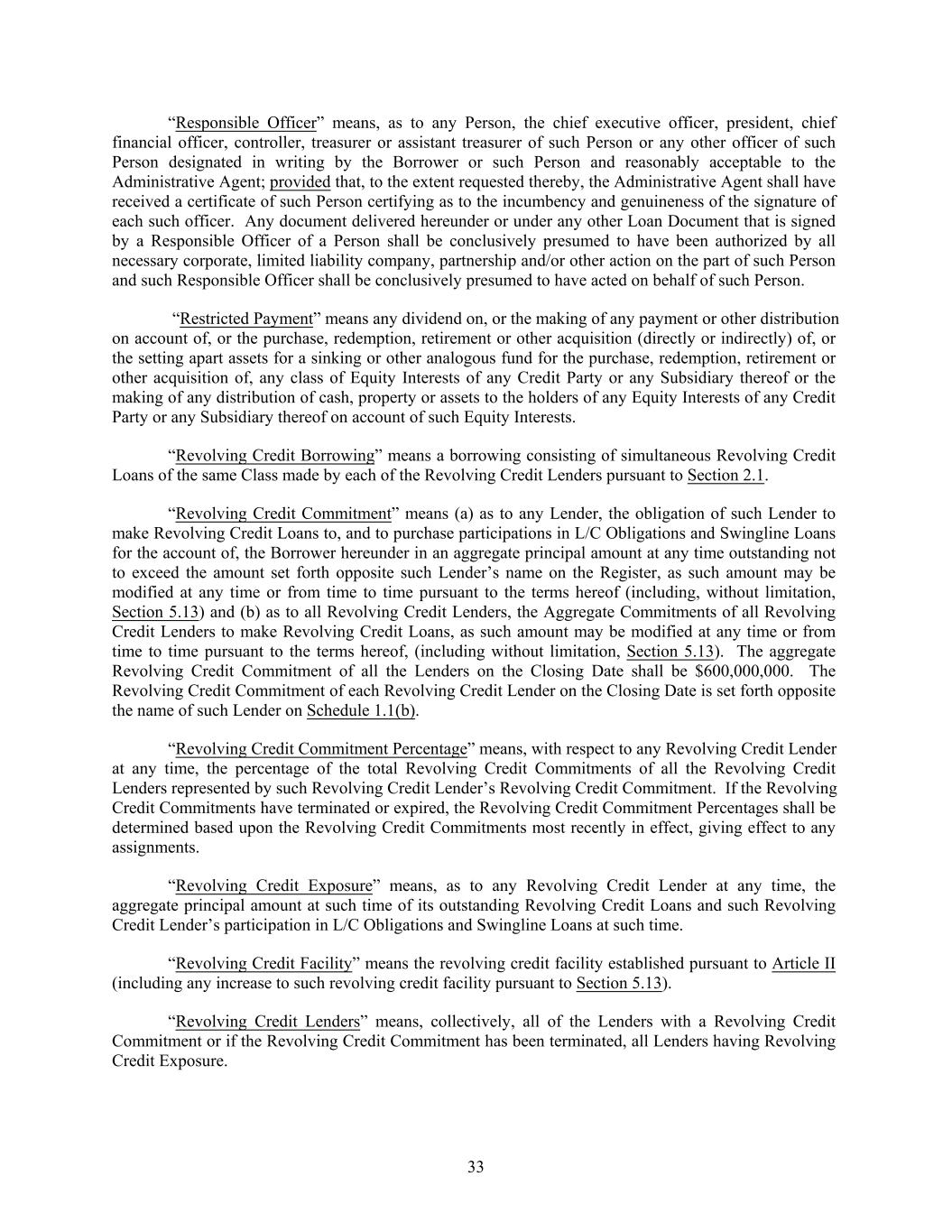“Responsible Officer” means, as to any Person, the chief executive officer, president, chieffinancial officer, controller, treasurer or assistant treasurer of such Person or any other officer of suchPerson designated in writing by the Borrower or such Person and reasonably acceptable to theAdministrative Agent; provided that, to the extent requested thereby, the Administrative Agent shall havereceived a certificate of such Person certifying as to the incumbency and genuineness of the signature ofeach such officer. Any document delivered hereunder or under any other Loan Document that is signedby a Responsible Officer of a Person shall be conclusively presumed to have been authorized by allnecessary corporate, limited liability company, partnership and/or other action on the part of such Personand such Responsible Officer shall be conclusively presumed to have acted on behalf of such Person. “Restricted Payment” means any dividend on, or the making of any payment or other distributionon account of, or the purchase, redemption, retirement or other acquisition (directly or indirectly) of, orthe setting apart assets for a sinking or other analogous fund for the purchase, redemption, retirement orother acquisition of, any class of Equity Interests of any Credit Party or any Subsidiary thereof or themaking of any distribution of cash, property or assets to the holders of any Equity Interests of any CreditParty or any Subsidiary thereof on account of such Equity Interests.“Revolving Credit Borrowing” means a borrowing consisting of simultaneous Revolving CreditLoans of the same Class made by each of the Revolving Credit Lenders pursuant to Section 2.1.“Revolving Credit Commitment” means (a) as to any Lender, the obligation of such Lender tomake Revolving Credit Loans to, and to purchase participations in L/C Obligations and Swingline Loansfor the account of, the Borrower hereunder in an aggregate principal amount at any time outstanding notto exceed the amount set forth opposite such Lender’s name on the Register, as such amount may bemodified at any time or from time to time pursuant to the terms hereof (including, without limitation,Section 5.13) and (b) as to all Revolving Credit Lenders, the Aggregate Commitments of all RevolvingCredit Lenders to make Revolving Credit Loans, as such amount may be modified at any time or fromtime to time pursuant to the terms hereof, (including without limitation, Section 5.13). The aggregateRevolving Credit Commitment of all the Lenders on the Closing Date shall be $600,000,000. TheRevolving Credit Commitment of each Revolving Credit Lender on the Closing Date is set forth oppositethe name of such Lender on Schedule 1.1(b).“Revolving Credit Commitment Percentage” means, with respect to any Revolving Credit Lenderat any time, the percentage of the total Revolving Credit Commitments of all the Revolving CreditLenders represented by such Revolving Credit Lender’s Revolving Credit Commitment. If the RevolvingCredit Commitments have terminated or expired, the Revolving Credit Commitment Percentages shall bedetermined based upon the Revolving Credit Commitments most recently in effect, giving effect to anyassignments.“Revolving Credit Exposure” means, as to any Revolving Credit Lender at any time, theaggregate principal amount at such time of its outstanding Revolving Credit Loans and such RevolvingCredit Lender’s participation in L/C Obligations and Swingline Loans at such time.“Revolving Credit Facility” means the revolving credit facility established pursuant to Article II(including any increase to such revolving credit facility pursuant to Section 5.13).“Revolving Credit Lenders” means, collectively, all of the Lenders with a Revolving CreditCommitment or if the Revolving Credit Commitment has been terminated, all Lenders having RevolvingCredit Exposure. 33