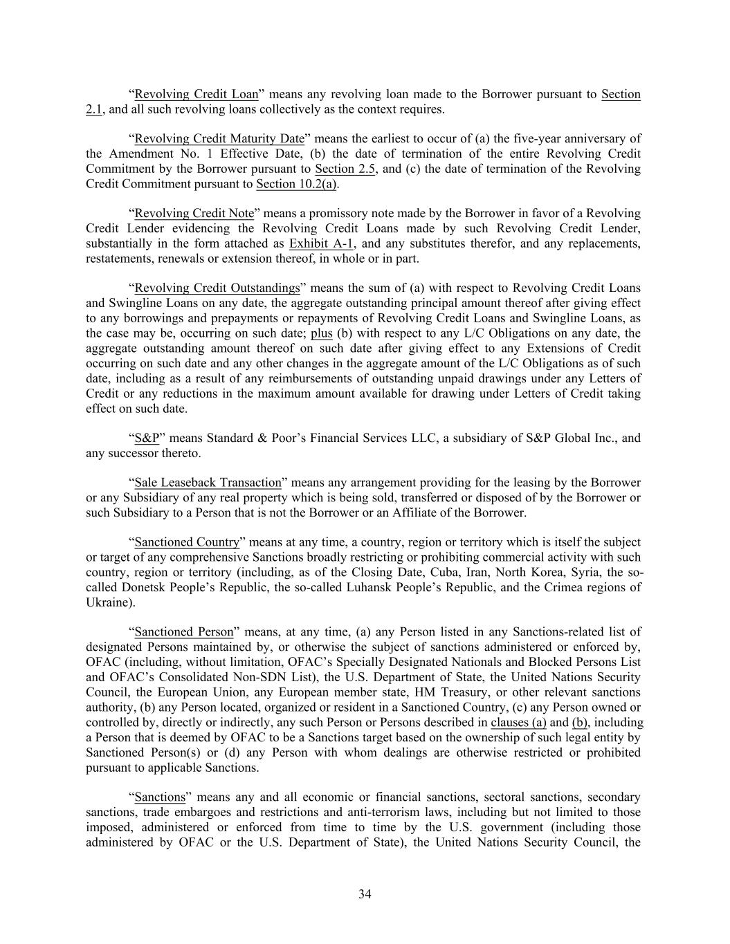 “Revolving Credit Loan” means any revolving loan made to the Borrower pursuant to Section2.1, and all such revolving loans collectively as the context requires.“Revolving Credit Maturity Date” means the earliest to occur of (a) the five-year anniversary ofthe Amendment No. 1 Effective Date, (b) the date of termination of the entire Revolving CreditCommitment by the Borrower pursuant to Section 2.5, and (c) the date of termination of the RevolvingCredit Commitment pursuant to Section 10.2(a).“Revolving Credit Note” means a promissory note made by the Borrower in favor of a RevolvingCredit Lender evidencing the Revolving Credit Loans made by such Revolving Credit Lender,substantially in the form attached as Exhibit A-1, and any substitutes therefor, and any replacements,restatements, renewals or extension thereof, in whole or in part.“Revolving Credit Outstandings” means the sum of (a) with respect to Revolving Credit Loansand Swingline Loans on any date, the aggregate outstanding principal amount thereof after giving effectto any borrowings and prepayments or repayments of Revolving Credit Loans and Swingline Loans, asthe case may be, occurring on such date; plus (b) with respect to any L/C Obligations on any date, theaggregate outstanding amount thereof on such date after giving effect to any Extensions of Creditoccurring on such date and any other changes in the aggregate amount of the L/C Obligations as of suchdate, including as a result of any reimbursements of outstanding unpaid drawings under any Letters ofCredit or any reductions in the maximum amount available for drawing under Letters of Credit takingeffect on such date.“S&P” means Standard & Poor’s Financial Services LLC, a subsidiary of S&P Global Inc., andany successor thereto.“Sale Leaseback Transaction” means any arrangement providing for the leasing by the Borroweror any Subsidiary of any real property which is being sold, transferred or disposed of by the Borrower orsuch Subsidiary to a Person that is not the Borrower or an Affiliate of the Borrower.“Sanctioned Country” means at any time, a country, region or territory which is itself the subjector target of any comprehensive Sanctions broadly restricting or prohibiting commercial activity with suchcountry, region or territory (including, as of the Closing Date, Cuba, Iran, North Korea, Syria, the so-called Donetsk People’s Republic, the so-called Luhansk People’s Republic, and the Crimea regions ofUkraine).“Sanctioned Person” means, at any time, (a) any Person listed in any Sanctions-related list ofdesignated Persons maintained by, or otherwise the subject of sanctions administered or enforced by,OFAC (including, without limitation, OFAC’s Specially Designated Nationals and Blocked Persons Listand OFAC’s Consolidated Non-SDN List), the U.S. Department of State, the United Nations SecurityCouncil, the European Union, any European member state, HM Treasury, or other relevant sanctionsauthority, (b) any Person located, organized or resident in a Sanctioned Country, (c) any Person owned orcontrolled by, directly or indirectly, any such Person or Persons described in clauses (a) and (b), includinga Person that is deemed by OFAC to be a Sanctions target based on the ownership of such legal entity bySanctioned Person(s) or (d) any Person with whom dealings are otherwise restricted or prohibitedpursuant to applicable Sanctions.“Sanctions” means any and all economic or financial sanctions, sectoral sanctions, secondarysanctions, trade embargoes and restrictions and anti-terrorism laws, including but not limited to thoseimposed, administered or enforced from time to time by the U.S. government (including thoseadministered by OFAC or the U.S. Department of State), the United Nations Security Council, the34