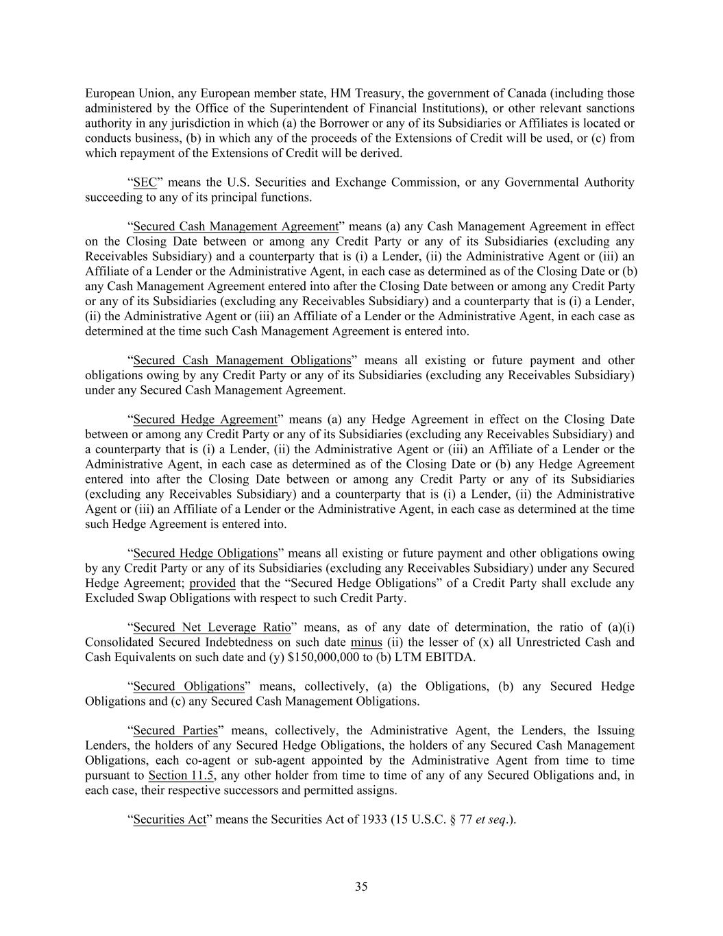 European Union, any European member state, HM Treasury, the government of Canada (including thoseadministered by the Office of the Superintendent of Financial Institutions), or other relevant sanctionsauthority in any jurisdiction in which (a) the Borrower or any of its Subsidiaries or Affiliates is located orconducts business, (b) in which any of the proceeds of the Extensions of Credit will be used, or (c) fromwhich repayment of the Extensions of Credit will be derived.“SEC” means the U.S. Securities and Exchange Commission, or any Governmental Authoritysucceeding to any of its principal functions.“Secured Cash Management Agreement” means (a) any Cash Management Agreement in effecton the Closing Date between or among any Credit Party or any of its Subsidiaries (excluding anyReceivables Subsidiary) and a counterparty that is (i) a Lender, (ii) the Administrative Agent or (iii) anAffiliate of a Lender or the Administrative Agent, in each case as determined as of the Closing Date or (b)any Cash Management Agreement entered into after the Closing Date between or among any Credit Partyor any of its Subsidiaries (excluding any Receivables Subsidiary) and a counterparty that is (i) a Lender,(ii) the Administrative Agent or (iii) an Affiliate of a Lender or the Administrative Agent, in each case asdetermined at the time such Cash Management Agreement is entered into.“Secured Cash Management Obligations” means all existing or future payment and otherobligations owing by any Credit Party or any of its Subsidiaries (excluding any Receivables Subsidiary)under any Secured Cash Management Agreement.“Secured Hedge Agreement” means (a) any Hedge Agreement in effect on the Closing Datebetween or among any Credit Party or any of its Subsidiaries (excluding any Receivables Subsidiary) anda counterparty that is (i) a Lender, (ii) the Administrative Agent or (iii) an Affiliate of a Lender or theAdministrative Agent, in each case as determined as of the Closing Date or (b) any Hedge Agreemententered into after the Closing Date between or among any Credit Party or any of its Subsidiaries(excluding any Receivables Subsidiary) and a counterparty that is (i) a Lender, (ii) the AdministrativeAgent or (iii) an Affiliate of a Lender or the Administrative Agent, in each case as determined at the timesuch Hedge Agreement is entered into.“Secured Hedge Obligations” means all existing or future payment and other obligations owingby any Credit Party or any of its Subsidiaries (excluding any Receivables Subsidiary) under any SecuredHedge Agreement; provided that the “Secured Hedge Obligations” of a Credit Party shall exclude anyExcluded Swap Obligations with respect to such Credit Party.“Secured Net Leverage Ratio” means, as of any date of determination, the ratio of (a)(i)Consolidated Secured Indebtedness on such date minus (ii) the lesser of (x) all Unrestricted Cash andCash Equivalents on such date and (y) $150,000,000 to (b) LTM EBITDA.“Secured Obligations” means, collectively, (a) the Obligations, (b) any Secured HedgeObligations and (c) any Secured Cash Management Obligations.“Secured Parties” means, collectively, the Administrative Agent, the Lenders, the IssuingLenders, the holders of any Secured Hedge Obligations, the holders of any Secured Cash ManagementObligations, each co-agent or sub-agent appointed by the Administrative Agent from time to timepursuant to Section 11.5, any other holder from time to time of any of any Secured Obligations and, ineach case, their respective successors and permitted assigns.“Securities Act” means the Securities Act of 1933 (15 U.S.C. § 77 et seq.).35
