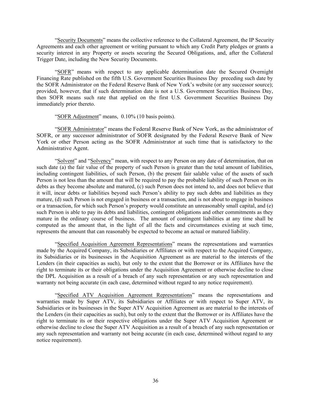 “Security Documents” means the collective reference to the Collateral Agreement, the IP SecurityAgreements and each other agreement or writing pursuant to which any Credit Party pledges or grants asecurity interest in any Property or assets securing the Secured Obligations, and, after the CollateralTrigger Date, including the New Security Documents.“SOFR” means with respect to any applicable determination date the Secured OvernightFinancing Rate published on the fifth U.S. Government Securities Business Day preceding such date bythe SOFR Administrator on the Federal Reserve Bank of New York’s website (or any successor source);provided, however, that if such determination date is not a U.S. Government Securities Business Day,then SOFR means such rate that applied on the first U.S. Government Securities Business Dayimmediately prior thereto.“SOFR Adjustment” means, 0.10% (10 basis points).“SOFR Administrator” means the Federal Reserve Bank of New York, as the administrator ofSOFR, or any successor administrator of SOFR designated by the Federal Reserve Bank of NewYork or other Person acting as the SOFR Administrator at such time that is satisfactory to theAdministrative Agent.“Solvent” and “Solvency” mean, with respect to any Person on any date of determination, that onsuch date (a) the fair value of the property of such Person is greater than the total amount of liabilities,including contingent liabilities, of such Person, (b) the present fair salable value of the assets of suchPerson is not less than the amount that will be required to pay the probable liability of such Person on itsdebts as they become absolute and matured, (c) such Person does not intend to, and does not believe thatit will, incur debts or liabilities beyond such Person’s ability to pay such debts and liabilities as theymature, (d) such Person is not engaged in business or a transaction, and is not about to engage in businessor a transaction, for which such Person’s property would constitute an unreasonably small capital, and (e)such Person is able to pay its debts and liabilities, contingent obligations and other commitments as theymature in the ordinary course of business. The amount of contingent liabilities at any time shall becomputed as the amount that, in the light of all the facts and circumstances existing at such time,represents the amount that can reasonably be expected to become an actual or matured liability.“Specified Acquisition Agreement Representations” means the representations and warrantiesmade by the Acquired Company, its Subsidiaries or Affiliates or with respect to the Acquired Company,its Subsidiaries or its businesses in the Acquisition Agreement as are material to the interests of theLenders (in their capacities as such), but only to the extent that the Borrower or its Affiliates have theright to terminate its or their obligations under the Acquisition Agreement or otherwise decline to closethe DPL Acquisition as a result of a breach of any such representation or any such representation andwarranty not being accurate (in each case, determined without regard to any notice requirement).“Specified ATV Acquisition Agreement Representations” means the representations andwarranties made by Super ATV, its Subsidiaries or Affiliates or with respect to Super ATV, itsSubsidiaries or its businesses in the Super ATV Acquisition Agreement as are material to the interests ofthe Lenders (in their capacities as such), but only to the extent that the Borrower or its Affiliates have theright to terminate its or their respective obligations under the Super ATV Acquisition Agreement orotherwise decline to close the Super ATV Acquisition as a result of a breach of any such representation orany such representation and warranty not being accurate (in each case, determined without regard to anynotice requirement). 36