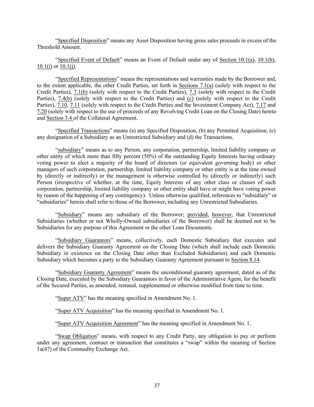 “Specified Disposition” means any Asset Disposition having gross sales proceeds in excess of theThreshold Amount.“Specified Event of Default” means an Event of Default under any of Section 10.1(a), 10.1(b),10.1(i) or 10.1(j).“Specified Representations” means the representations and warranties made by the Borrower and,to the extent applicable, the other Credit Parties, set forth in Sections 7.1(a) (solely with respect to theCredit Parties), 7.1(b) (solely with respect to the Credit Parties), 7.3 (solely with respect to the CreditParties), 7.4(b) (solely with respect to the Credit Parties) and (c) (solely with respect to the CreditParties), 7.10, 7.11 (solely with respect to the Credit Parties and the Investment Company Act), 7.17 and7.20 (solely with respect to the use of proceeds of any Revolving Credit Loan on the Closing Date) heretoand Section 3.4 of the Collateral Agreement.“Specified Transactions” means (a) any Specified Disposition, (b) any Permitted Acquisition, (c)any designation of a Subsidiary as an Unrestricted Subsidiary and (d) the Transactions.“subsidiary” means as to any Person, any corporation, partnership, limited liability company orother entity of which more than fifty percent (50%) of the outstanding Equity Interests having ordinaryvoting power to elect a majority of the board of directors (or equivalent governing body) or othermanagers of such corporation, partnership, limited liability company or other entity is at the time ownedby (directly or indirectly) or the management is otherwise controlled by (directly or indirectly) suchPerson (irrespective of whether, at the time, Equity Interests of any other class or classes of suchcorporation, partnership, limited liability company or other entity shall have or might have voting powerby reason of the happening of any contingency). Unless otherwise qualified, references to “subsidiary” or“subsidiaries” herein shall refer to those of the Borrower, including any Unrestricted Subsidiaries.“Subsidiary” means any subsidiary of the Borrower; provided, however, that UnrestrictedSubsidiaries (whether or not Wholly-Owned subsidiaries of the Borrower) shall be deemed not to beSubsidiaries for any purpose of this Agreement or the other Loan Documents.“Subsidiary Guarantors” means, collectively, each Domestic Subsidiary that executes anddelivers the Subsidiary Guaranty Agreement on the Closing Date (which shall include each DomesticSubsidiary in existence on the Closing Date other than Excluded Subsidiaries) and each DomesticSubsidiary which becomes a party to the Subsidiary Guaranty Agreement pursuant to Section 8.14.“Subsidiary Guaranty Agreement” means the unconditional guaranty agreement, dated as of theClosing Date, executed by the Subsidiary Guarantors in favor of the Administrative Agent, for the benefitof the Secured Parties, as amended, restated, supplemented or otherwise modified from time to time.“Super ATV” has the meaning specified in Amendment No. 1.“Super ATV Acquisition” has the meaning specified in Amendment No. 1.“Super ATV Acquisition Agreement” has the meaning specified in Amendment No. 1.“Swap Obligation” means, with respect to any Credit Party, any obligation to pay or performunder any agreement, contract or transaction that constitutes a “swap” within the meaning of Section1a(47) of the Commodity Exchange Act. 37