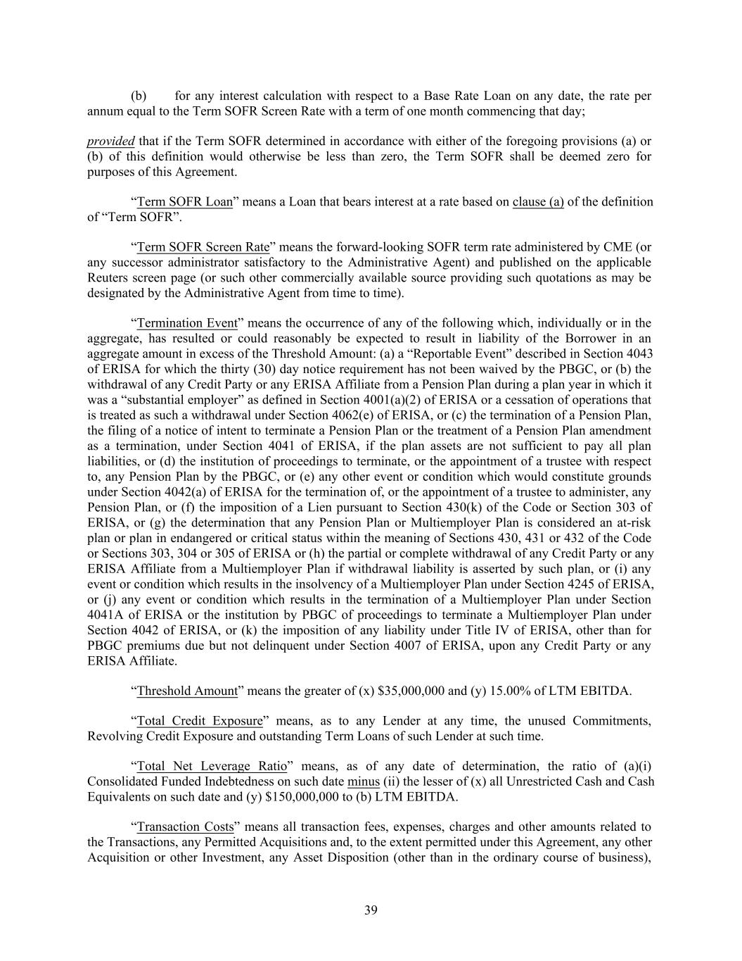 (b) for any interest calculation with respect to a Base Rate Loan on any date, the rate perannum equal to the Term SOFR Screen Rate with a term of one month commencing that day;provided that if the Term SOFR determined in accordance with either of the foregoing provisions (a) or(b) of this definition would otherwise be less than zero, the Term SOFR shall be deemed zero forpurposes of this Agreement.“Term SOFR Loan” means a Loan that bears interest at a rate based on clause (a) of the definitionof “Term SOFR”.“Term SOFR Screen Rate” means the forward-looking SOFR term rate administered by CME (orany successor administrator satisfactory to the Administrative Agent) and published on the applicableReuters screen page (or such other commercially available source providing such quotations as may bedesignated by the Administrative Agent from time to time).“Termination Event” means the occurrence of any of the following which, individually or in theaggregate, has resulted or could reasonably be expected to result in liability of the Borrower in anaggregate amount in excess of the Threshold Amount: (a) a “Reportable Event” described in Section 4043of ERISA for which the thirty (30) day notice requirement has not been waived by the PBGC, or (b) thewithdrawal of any Credit Party or any ERISA Affiliate from a Pension Plan during a plan year in which itwas a “substantial employer” as defined in Section 4001(a)(2) of ERISA or a cessation of operations thatis treated as such a withdrawal under Section 4062(e) of ERISA, or (c) the termination of a Pension Plan,the filing of a notice of intent to terminate a Pension Plan or the treatment of a Pension Plan amendmentas a termination, under Section 4041 of ERISA, if the plan assets are not sufficient to pay all planliabilities, or (d) the institution of proceedings to terminate, or the appointment of a trustee with respectto, any Pension Plan by the PBGC, or (e) any other event or condition which would constitute groundsunder Section 4042(a) of ERISA for the termination of, or the appointment of a trustee to administer, anyPension Plan, or (f) the imposition of a Lien pursuant to Section 430(k) of the Code or Section 303 ofERISA, or (g) the determination that any Pension Plan or Multiemployer Plan is considered an at-riskplan or plan in endangered or critical status within the meaning of Sections 430, 431 or 432 of the Codeor Sections 303, 304 or 305 of ERISA or (h) the partial or complete withdrawal of any Credit Party or anyERISA Affiliate from a Multiemployer Plan if withdrawal liability is asserted by such plan, or (i) anyevent or condition which results in the insolvency of a Multiemployer Plan under Section 4245 of ERISA,or (j) any event or condition which results in the termination of a Multiemployer Plan under Section4041A of ERISA or the institution by PBGC of proceedings to terminate a Multiemployer Plan underSection 4042 of ERISA, or (k) the imposition of any liability under Title IV of ERISA, other than forPBGC premiums due but not delinquent under Section 4007 of ERISA, upon any Credit Party or anyERISA Affiliate.“Threshold Amount” means the greater of (x) $35,000,000 and (y) 15.00% of LTM EBITDA.“Total Credit Exposure” means, as to any Lender at any time, the unused Commitments,Revolving Credit Exposure and outstanding Term Loans of such Lender at such time.“Total Net Leverage Ratio” means, as of any date of determination, the ratio of (a)(i)Consolidated Funded Indebtedness on such date minus (ii) the lesser of (x) all Unrestricted Cash and CashEquivalents on such date and (y) $150,000,000 to (b) LTM EBITDA.“Transaction Costs” means all transaction fees, expenses, charges and other amounts related tothe Transactions, any Permitted Acquisitions and, to the extent permitted under this Agreement, any otherAcquisition or other Investment, any Asset Disposition (other than in the ordinary course of business),39
