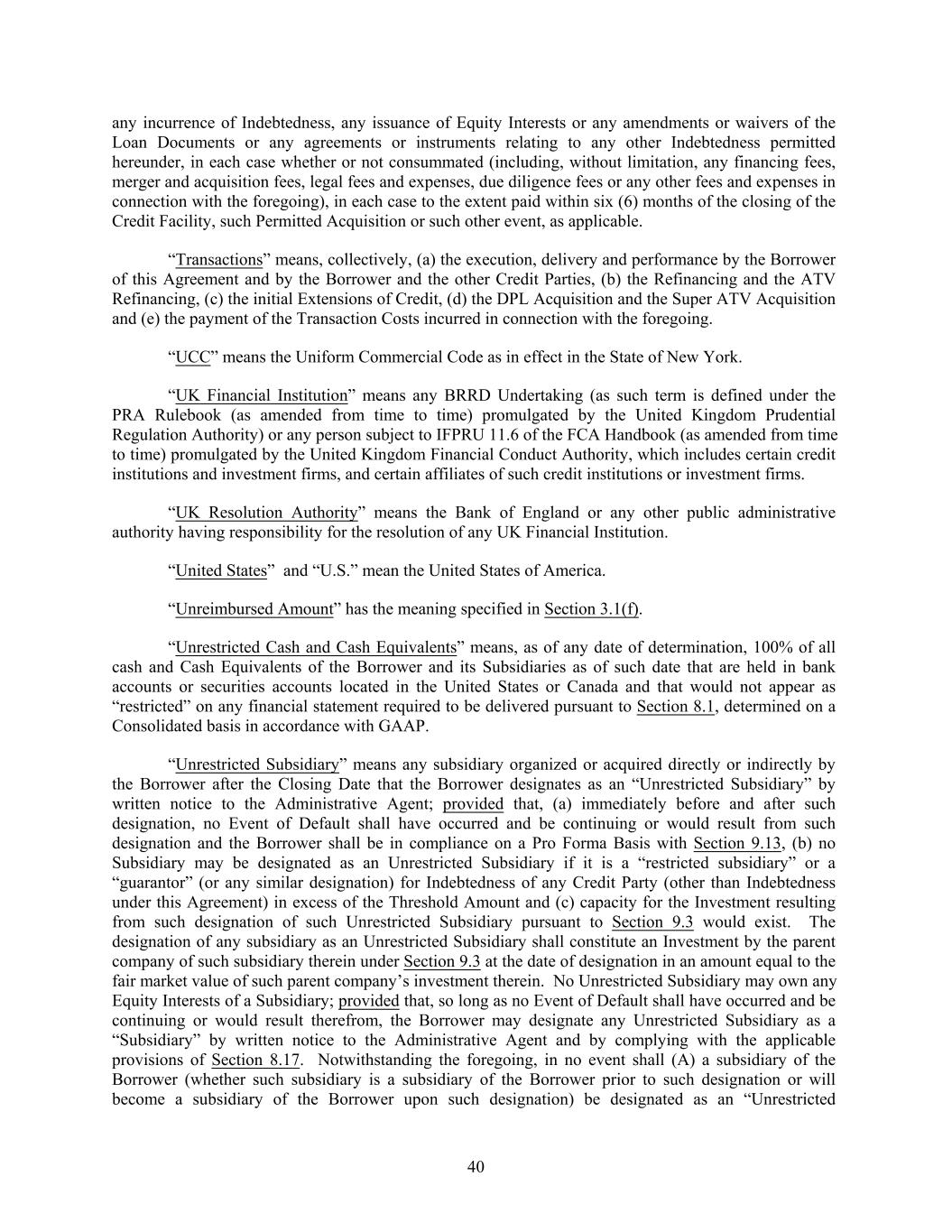 any incurrence of Indebtedness, any issuance of Equity Interests or any amendments or waivers of theLoan Documents or any agreements or instruments relating to any other Indebtedness permittedhereunder, in each case whether or not consummated (including, without limitation, any financing fees,merger and acquisition fees, legal fees and expenses, due diligence fees or any other fees and expenses inconnection with the foregoing), in each case to the extent paid within six (6) months of the closing of theCredit Facility, such Permitted Acquisition or such other event, as applicable.“Transactions” means, collectively, (a) the execution, delivery and performance by the Borrowerof this Agreement and by the Borrower and the other Credit Parties, (b) the Refinancing and the ATVRefinancing, (c) the initial Extensions of Credit, (d) the DPL Acquisition and the Super ATV Acquisitionand (e) the payment of the Transaction Costs incurred in connection with the foregoing.“UCC” means the Uniform Commercial Code as in effect in the State of New York.“UK Financial Institution” means any BRRD Undertaking (as such term is defined under thePRA Rulebook (as amended from time to time) promulgated by the United Kingdom PrudentialRegulation Authority) or any person subject to IFPRU 11.6 of the FCA Handbook (as amended from timeto time) promulgated by the United Kingdom Financial Conduct Authority, which includes certain creditinstitutions and investment firms, and certain affiliates of such credit institutions or investment firms.“UK Resolution Authority” means the Bank of England or any other public administrativeauthority having responsibility for the resolution of any UK Financial Institution.“United States” and “U.S.” mean the United States of America.“Unreimbursed Amount” has the meaning specified in Section 3.1(f).“Unrestricted Cash and Cash Equivalents” means, as of any date of determination, 100% of allcash and Cash Equivalents of the Borrower and its Subsidiaries as of such date that are held in bankaccounts or securities accounts located in the United States or Canada and that would not appear as“restricted” on any financial statement required to be delivered pursuant to Section 8.1, determined on aConsolidated basis in accordance with GAAP.“Unrestricted Subsidiary” means any subsidiary organized or acquired directly or indirectly bythe Borrower after the Closing Date that the Borrower designates as an “Unrestricted Subsidiary” bywritten notice to the Administrative Agent; provided that, (a) immediately before and after suchdesignation, no Event of Default shall have occurred and be continuing or would result from suchdesignation and the Borrower shall be in compliance on a Pro Forma Basis with Section 9.13, (b) noSubsidiary may be designated as an Unrestricted Subsidiary if it is a “restricted subsidiary” or a“guarantor” (or any similar designation) for Indebtedness of any Credit Party (other than Indebtednessunder this Agreement) in excess of the Threshold Amount and (c) capacity for the Investment resultingfrom such designation of such Unrestricted Subsidiary pursuant to Section 9.3 would exist. Thedesignation of any subsidiary as an Unrestricted Subsidiary shall constitute an Investment by the parentcompany of such subsidiary therein under Section 9.3 at the date of designation in an amount equal to thefair market value of such parent company’s investment therein. No Unrestricted Subsidiary may own anyEquity Interests of a Subsidiary; provided that, so long as no Event of Default shall have occurred and becontinuing or would result therefrom, the Borrower may designate any Unrestricted Subsidiary as a“Subsidiary” by written notice to the Administrative Agent and by complying with the applicableprovisions of Section 8.17. Notwithstanding the foregoing, in no event shall (A) a subsidiary of theBorrower (whether such subsidiary is a subsidiary of the Borrower prior to such designation or willbecome a subsidiary of the Borrower upon such designation) be designated as an “Unrestricted40