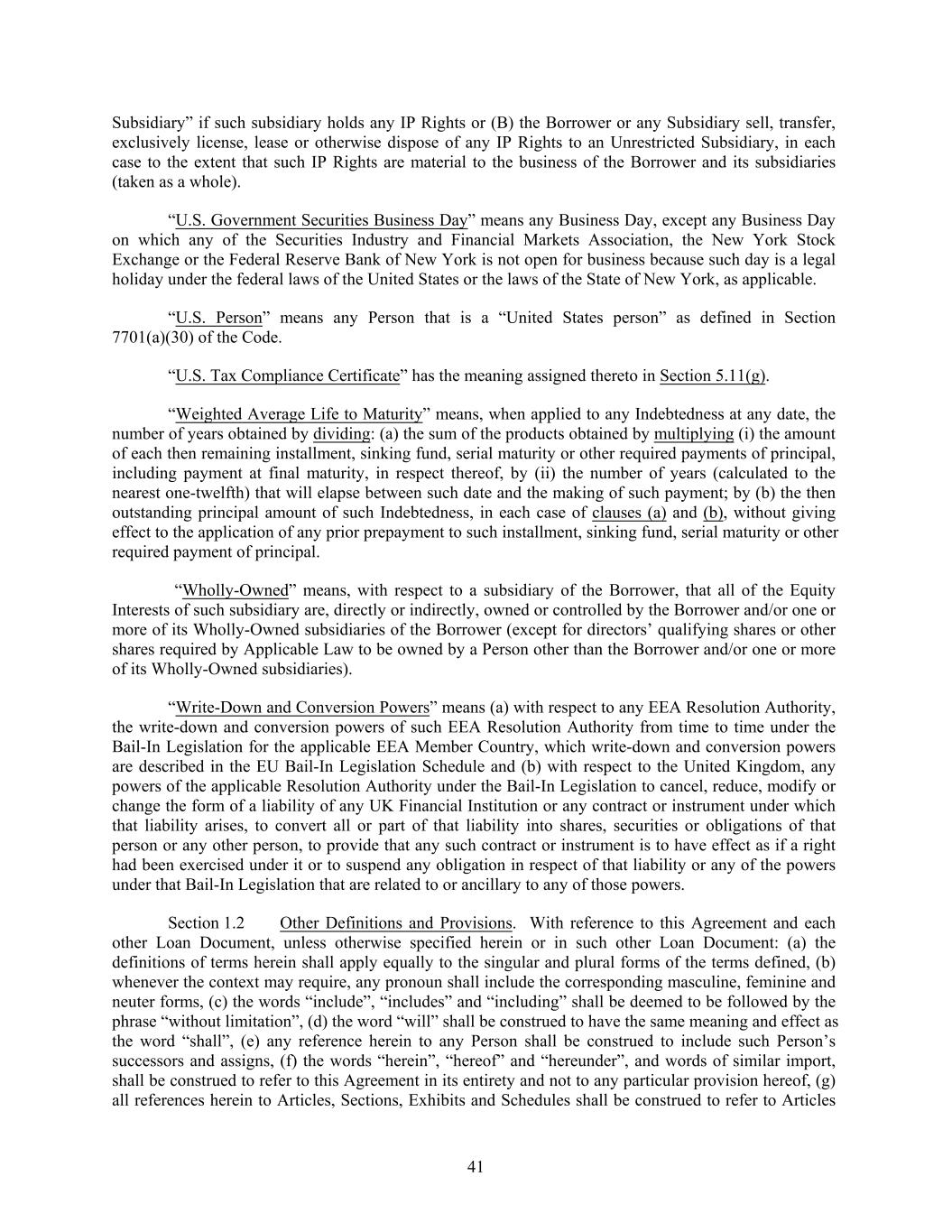 Subsidiary” if such subsidiary holds any IP Rights or (B) the Borrower or any Subsidiary sell, transfer,exclusively license, lease or otherwise dispose of any IP Rights to an Unrestricted Subsidiary, in eachcase to the extent that such IP Rights are material to the business of the Borrower and its subsidiaries(taken as a whole).“U.S. Government Securities Business Day” means any Business Day, except any Business Dayon which any of the Securities Industry and Financial Markets Association, the New York StockExchange or the Federal Reserve Bank of New York is not open for business because such day is a legalholiday under the federal laws of the United States or the laws of the State of New York, as applicable.“U.S. Person” means any Person that is a “United States person” as defined in Section7701(a)(30) of the Code.“U.S. Tax Compliance Certificate” has the meaning assigned thereto in Section 5.11(g).“Weighted Average Life to Maturity” means, when applied to any Indebtedness at any date, thenumber of years obtained by dividing: (a) the sum of the products obtained by multiplying (i) the amountof each then remaining installment, sinking fund, serial maturity or other required payments of principal,including payment at final maturity, in respect thereof, by (ii) the number of years (calculated to thenearest one-twelfth) that will elapse between such date and the making of such payment; by (b) the thenoutstanding principal amount of such Indebtedness, in each case of clauses (a) and (b), without givingeffect to the application of any prior prepayment to such installment, sinking fund, serial maturity or otherrequired payment of principal. “Wholly-Owned” means, with respect to a subsidiary of the Borrower, that all of the EquityInterests of such subsidiary are, directly or indirectly, owned or controlled by the Borrower and/or one ormore of its Wholly-Owned subsidiaries of the Borrower (except for directors’ qualifying shares or othershares required by Applicable Law to be owned by a Person other than the Borrower and/or one or moreof its Wholly-Owned subsidiaries).“Write-Down and Conversion Powers” means (a) with respect to any EEA Resolution Authority,the write-down and conversion powers of such EEA Resolution Authority from time to time under theBail-In Legislation for the applicable EEA Member Country, which write-down and conversion powersare described in the EU Bail-In Legislation Schedule and (b) with respect to the United Kingdom, anypowers of the applicable Resolution Authority under the Bail-In Legislation to cancel, reduce, modify orchange the form of a liability of any UK Financial Institution or any contract or instrument under whichthat liability arises, to convert all or part of that liability into shares, securities or obligations of thatperson or any other person, to provide that any such contract or instrument is to have effect as if a righthad been exercised under it or to suspend any obligation in respect of that liability or any of the powersunder that Bail-In Legislation that are related to or ancillary to any of those powers.Section 1.2 Other Definitions and Provisions. With reference to this Agreement and eachother Loan Document, unless otherwise specified herein or in such other Loan Document: (a) thedefinitions of terms herein shall apply equally to the singular and plural forms of the terms defined, (b)whenever the context may require, any pronoun shall include the corresponding masculine, feminine andneuter forms, (c) the words “include”, “includes” and “including” shall be deemed to be followed by thephrase “without limitation”, (d) the word “will” shall be construed to have the same meaning and effect asthe word “shall”, (e) any reference herein to any Person shall be construed to include such Person’ssuccessors and assigns, (f) the words “herein”, “hereof” and “hereunder”, and words of similar import,shall be construed to refer to this Agreement in its entirety and not to any particular provision hereof, (g)all references herein to Articles, Sections, Exhibits and Schedules shall be construed to refer to Articles41