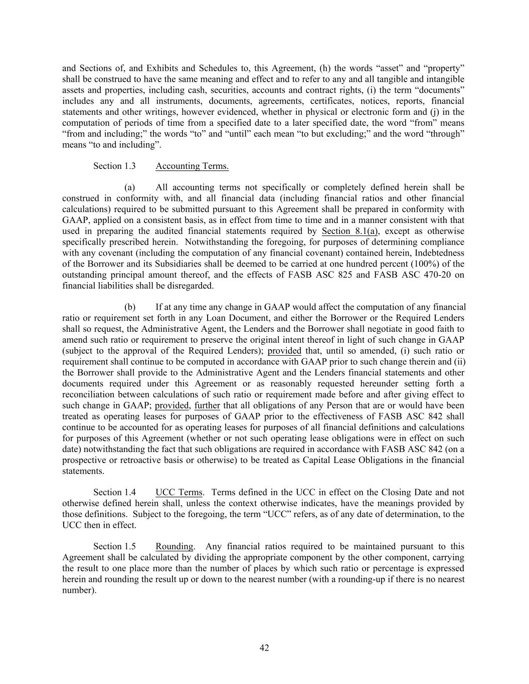 and Sections of, and Exhibits and Schedules to, this Agreement, (h) the words “asset” and “property”shall be construed to have the same meaning and effect and to refer to any and all tangible and intangibleassets and properties, including cash, securities, accounts and contract rights, (i) the term “documents”includes any and all instruments, documents, agreements, certificates, notices, reports, financialstatements and other writings, however evidenced, whether in physical or electronic form and (j) in thecomputation of periods of time from a specified date to a later specified date, the word “from” means“from and including;” the words “to” and “until” each mean “to but excluding;” and the word “through”means “to and including”.Section 1.3 Accounting Terms.(a) All accounting terms not specifically or completely defined herein shall beconstrued in conformity with, and all financial data (including financial ratios and other financialcalculations) required to be submitted pursuant to this Agreement shall be prepared in conformity withGAAP, applied on a consistent basis, as in effect from time to time and in a manner consistent with thatused in preparing the audited financial statements required by Section 8.1(a), except as otherwisespecifically prescribed herein. Notwithstanding the foregoing, for purposes of determining compliancewith any covenant (including the computation of any financial covenant) contained herein, Indebtednessof the Borrower and its Subsidiaries shall be deemed to be carried at one hundred percent (100%) of theoutstanding principal amount thereof, and the effects of FASB ASC 825 and FASB ASC 470-20 onfinancial liabilities shall be disregarded.(b) If at any time any change in GAAP would affect the computation of any financialratio or requirement set forth in any Loan Document, and either the Borrower or the Required Lendersshall so request, the Administrative Agent, the Lenders and the Borrower shall negotiate in good faith toamend such ratio or requirement to preserve the original intent thereof in light of such change in GAAP(subject to the approval of the Required Lenders); provided that, until so amended, (i) such ratio orrequirement shall continue to be computed in accordance with GAAP prior to such change therein and (ii)the Borrower shall provide to the Administrative Agent and the Lenders financial statements and otherdocuments required under this Agreement or as reasonably requested hereunder setting forth areconciliation between calculations of such ratio or requirement made before and after giving effect tosuch change in GAAP; provided, further that all obligations of any Person that are or would have beentreated as operating leases for purposes of GAAP prior to the effectiveness of FASB ASC 842 shallcontinue to be accounted for as operating leases for purposes of all financial definitions and calculationsfor purposes of this Agreement (whether or not such operating lease obligations were in effect on suchdate) notwithstanding the fact that such obligations are required in accordance with FASB ASC 842 (on aprospective or retroactive basis or otherwise) to be treated as Capital Lease Obligations in the financialstatements.Section 1.4 UCC Terms. Terms defined in the UCC in effect on the Closing Date and nototherwise defined herein shall, unless the context otherwise indicates, have the meanings provided bythose definitions. Subject to the foregoing, the term “UCC” refers, as of any date of determination, to theUCC then in effect.Section 1.5 Rounding. Any financial ratios required to be maintained pursuant to thisAgreement shall be calculated by dividing the appropriate component by the other component, carryingthe result to one place more than the number of places by which such ratio or percentage is expressedherein and rounding the result up or down to the nearest number (with a rounding-up if there is no nearestnumber). 42