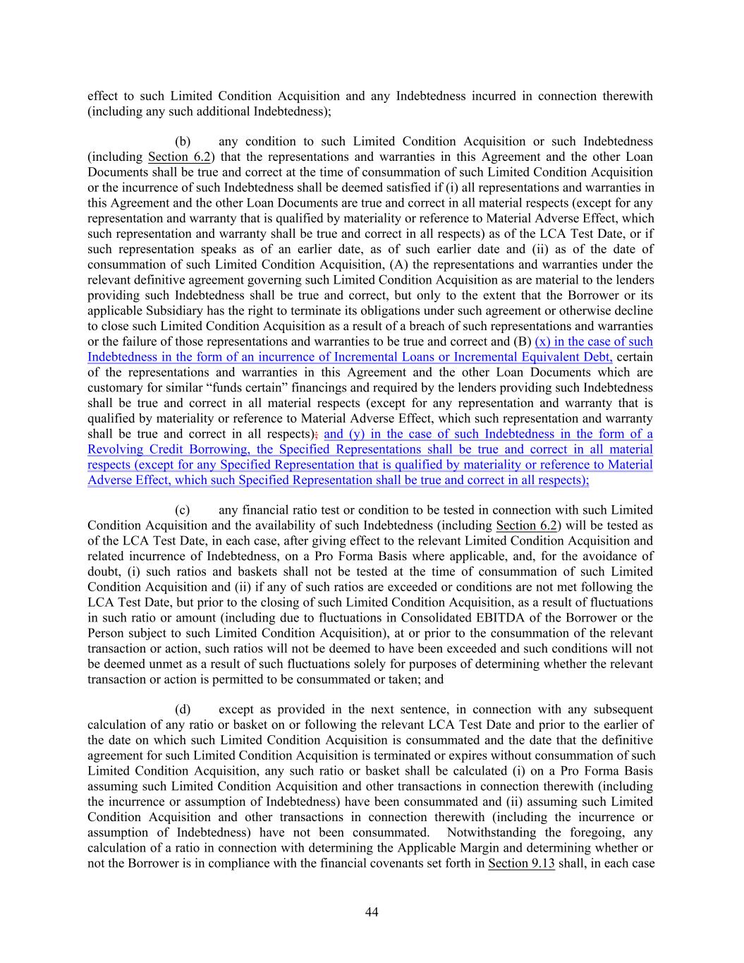 effect to such Limited Condition Acquisition and any Indebtedness incurred in connection therewith(including any such additional Indebtedness);(b) any condition to such Limited Condition Acquisition or such Indebtedness(including Section 6.2) that the representations and warranties in this Agreement and the other LoanDocuments shall be true and correct at the time of consummation of such Limited Condition Acquisitionor the incurrence of such Indebtedness shall be deemed satisfied if (i) all representations and warranties inthis Agreement and the other Loan Documents are true and correct in all material respects (except for anyrepresentation and warranty that is qualified by materiality or reference to Material Adverse Effect, whichsuch representation and warranty shall be true and correct in all respects) as of the LCA Test Date, or ifsuch representation speaks as of an earlier date, as of such earlier date and (ii) as of the date ofconsummation of such Limited Condition Acquisition, (A) the representations and warranties under therelevant definitive agreement governing such Limited Condition Acquisition as are material to the lendersproviding such Indebtedness shall be true and correct, but only to the extent that the Borrower or itsapplicable Subsidiary has the right to terminate its obligations under such agreement or otherwise declineto close such Limited Condition Acquisition as a result of a breach of such representations and warrantiesor the failure of those representations and warranties to be true and correct and (B) (x) in the case of suchIndebtedness in the form of an incurrence of Incremental Loans or Incremental Equivalent Debt, certainof the representations and warranties in this Agreement and the other Loan Documents which arecustomary for similar “funds certain” financings and required by the lenders providing such Indebtednessshall be true and correct in all material respects (except for any representation and warranty that isqualified by materiality or reference to Material Adverse Effect, which such representation and warrantyshall be true and correct in all respects); and (y) in the case of such Indebtedness in the form of aRevolving Credit Borrowing, the Specified Representations shall be true and correct in all materialrespects (except for any Specified Representation that is qualified by materiality or reference to MaterialAdverse Effect, which such Specified Representation shall be true and correct in all respects);(c) any financial ratio test or condition to be tested in connection with such LimitedCondition Acquisition and the availability of such Indebtedness (including Section 6.2) will be tested asof the LCA Test Date, in each case, after giving effect to the relevant Limited Condition Acquisition andrelated incurrence of Indebtedness, on a Pro Forma Basis where applicable, and, for the avoidance ofdoubt, (i) such ratios and baskets shall not be tested at the time of consummation of such LimitedCondition Acquisition and (ii) if any of such ratios are exceeded or conditions are not met following theLCA Test Date, but prior to the closing of such Limited Condition Acquisition, as a result of fluctuationsin such ratio or amount (including due to fluctuations in Consolidated EBITDA of the Borrower or thePerson subject to such Limited Condition Acquisition), at or prior to the consummation of the relevanttransaction or action, such ratios will not be deemed to have been exceeded and such conditions will notbe deemed unmet as a result of such fluctuations solely for purposes of determining whether the relevanttransaction or action is permitted to be consummated or taken; and(d) except as provided in the next sentence, in connection with any subsequentcalculation of any ratio or basket on or following the relevant LCA Test Date and prior to the earlier ofthe date on which such Limited Condition Acquisition is consummated and the date that the definitiveagreement for such Limited Condition Acquisition is terminated or expires without consummation of suchLimited Condition Acquisition, any such ratio or basket shall be calculated (i) on a Pro Forma Basisassuming such Limited Condition Acquisition and other transactions in connection therewith (includingthe incurrence or assumption of Indebtedness) have been consummated and (ii) assuming such LimitedCondition Acquisition and other transactions in connection therewith (including the incurrence orassumption of Indebtedness) have not been consummated. Notwithstanding the foregoing, anycalculation of a ratio in connection with determining the Applicable Margin and determining whether ornot the Borrower is in compliance with the financial covenants set forth in Section 9.13 shall, in each case44