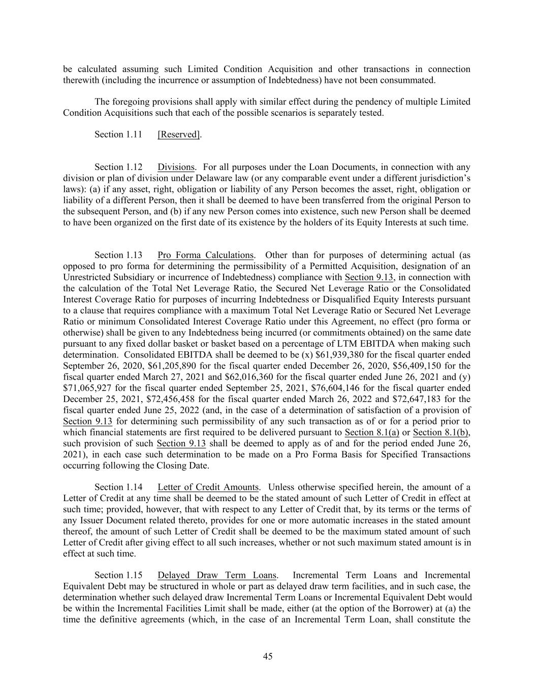 be calculated assuming such Limited Condition Acquisition and other transactions in connectiontherewith (including the incurrence or assumption of Indebtedness) have not been consummated.The foregoing provisions shall apply with similar effect during the pendency of multiple LimitedCondition Acquisitions such that each of the possible scenarios is separately tested.Section 1.11 [Reserved].Section 1.12 Divisions. For all purposes under the Loan Documents, in connection with anydivision or plan of division under Delaware law (or any comparable event under a different jurisdiction’slaws): (a) if any asset, right, obligation or liability of any Person becomes the asset, right, obligation orliability of a different Person, then it shall be deemed to have been transferred from the original Person tothe subsequent Person, and (b) if any new Person comes into existence, such new Person shall be deemedto have been organized on the first date of its existence by the holders of its Equity Interests at such time.Section 1.13 Pro Forma Calculations. Other than for purposes of determining actual (asopposed to pro forma for determining the permissibility of a Permitted Acquisition, designation of anUnrestricted Subsidiary or incurrence of Indebtedness) compliance with Section 9.13, in connection withthe calculation of the Total Net Leverage Ratio, the Secured Net Leverage Ratio or the ConsolidatedInterest Coverage Ratio for purposes of incurring Indebtedness or Disqualified Equity Interests pursuantto a clause that requires compliance with a maximum Total Net Leverage Ratio or Secured Net LeverageRatio or minimum Consolidated Interest Coverage Ratio under this Agreement, no effect (pro forma orotherwise) shall be given to any Indebtedness being incurred (or commitments obtained) on the same datepursuant to any fixed dollar basket or basket based on a percentage of LTM EBITDA when making suchdetermination. Consolidated EBITDA shall be deemed to be (x) $61,939,380 for the fiscal quarter endedSeptember 26, 2020, $61,205,890 for the fiscal quarter ended December 26, 2020, $56,409,150 for thefiscal quarter ended March 27, 2021 and $62,016,360 for the fiscal quarter ended June 26, 2021 and (y)$71,065,927 for the fiscal quarter ended September 25, 2021, $76,604,146 for the fiscal quarter endedDecember 25, 2021, $72,456,458 for the fiscal quarter ended March 26, 2022 and $72,647,183 for thefiscal quarter ended June 25, 2022 (and, in the case of a determination of satisfaction of a provision ofSection 9.13 for determining such permissibility of any such transaction as of or for a period prior towhich financial statements are first required to be delivered pursuant to Section 8.1(a) or Section 8.1(b),such provision of such Section 9.13 shall be deemed to apply as of and for the period ended June 26,2021), in each case such determination to be made on a Pro Forma Basis for Specified Transactionsoccurring following the Closing Date.Section 1.14 Letter of Credit Amounts. Unless otherwise specified herein, the amount of aLetter of Credit at any time shall be deemed to be the stated amount of such Letter of Credit in effect atsuch time; provided, however, that with respect to any Letter of Credit that, by its terms or the terms ofany Issuer Document related thereto, provides for one or more automatic increases in the stated amountthereof, the amount of such Letter of Credit shall be deemed to be the maximum stated amount of suchLetter of Credit after giving effect to all such increases, whether or not such maximum stated amount is ineffect at such time.Section 1.15 Delayed Draw Term Loans. Incremental Term Loans and IncrementalEquivalent Debt may be structured in whole or part as delayed draw term facilities, and in such case, thedetermination whether such delayed draw Incremental Term Loans or Incremental Equivalent Debt wouldbe within the Incremental Facilities Limit shall be made, either (at the option of the Borrower) at (a) thetime the definitive agreements (which, in the case of an Incremental Term Loan, shall constitute the45
