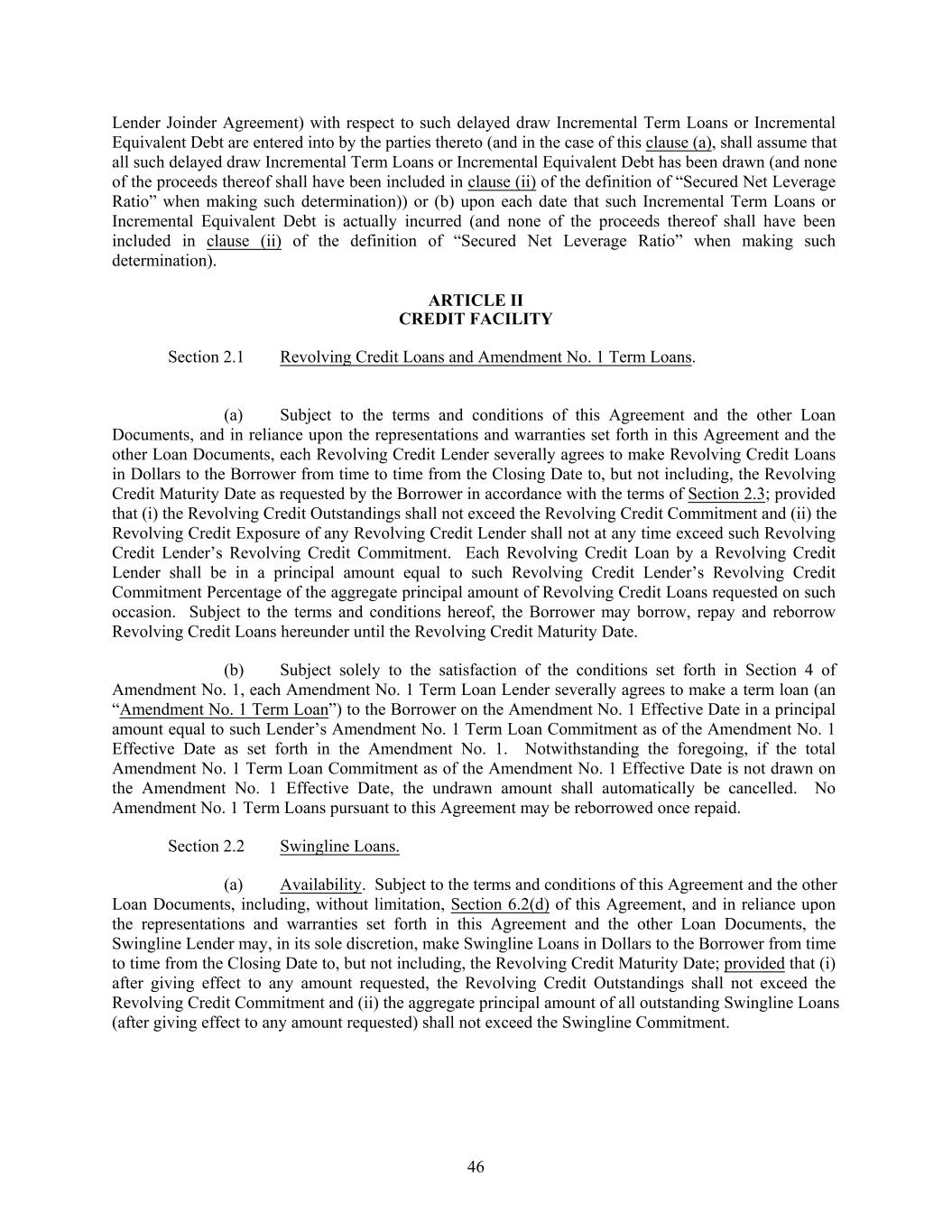 Lender Joinder Agreement) with respect to such delayed draw Incremental Term Loans or IncrementalEquivalent Debt are entered into by the parties thereto (and in the case of this clause (a), shall assume thatall such delayed draw Incremental Term Loans or Incremental Equivalent Debt has been drawn (and noneof the proceeds thereof shall have been included in clause (ii) of the definition of “Secured Net LeverageRatio” when making such determination)) or (b) upon each date that such Incremental Term Loans orIncremental Equivalent Debt is actually incurred (and none of the proceeds thereof shall have beenincluded in clause (ii) of the definition of “Secured Net Leverage Ratio” when making suchdetermination). ARTICLE IICREDIT FACILITYSection 2.1 Revolving Credit Loans and Amendment No. 1 Term Loans.(a) Subject to the terms and conditions of this Agreement and the other LoanDocuments, and in reliance upon the representations and warranties set forth in this Agreement and theother Loan Documents, each Revolving Credit Lender severally agrees to make Revolving Credit Loansin Dollars to the Borrower from time to time from the Closing Date to, but not including, the RevolvingCredit Maturity Date as requested by the Borrower in accordance with the terms of Section 2.3; providedthat (i) the Revolving Credit Outstandings shall not exceed the Revolving Credit Commitment and (ii) theRevolving Credit Exposure of any Revolving Credit Lender shall not at any time exceed such RevolvingCredit Lender’s Revolving Credit Commitment. Each Revolving Credit Loan by a Revolving CreditLender shall be in a principal amount equal to such Revolving Credit Lender’s Revolving CreditCommitment Percentage of the aggregate principal amount of Revolving Credit Loans requested on suchoccasion. Subject to the terms and conditions hereof, the Borrower may borrow, repay and reborrowRevolving Credit Loans hereunder until the Revolving Credit Maturity Date.(b) Subject solely to the satisfaction of the conditions set forth in Section 4 ofAmendment No. 1, each Amendment No. 1 Term Loan Lender severally agrees to make a term loan (an“Amendment No. 1 Term Loan”) to the Borrower on the Amendment No. 1 Effective Date in a principalamount equal to such Lender’s Amendment No. 1 Term Loan Commitment as of the Amendment No. 1Effective Date as set forth in the Amendment No. 1. Notwithstanding the foregoing, if the totalAmendment No. 1 Term Loan Commitment as of the Amendment No. 1 Effective Date is not drawn onthe Amendment No. 1 Effective Date, the undrawn amount shall automatically be cancelled. NoAmendment No. 1 Term Loans pursuant to this Agreement may be reborrowed once repaid.Section 2.2 Swingline Loans.(a) Availability. Subject to the terms and conditions of this Agreement and the otherLoan Documents, including, without limitation, Section 6.2(d) of this Agreement, and in reliance uponthe representations and warranties set forth in this Agreement and the other Loan Documents, theSwingline Lender may, in its sole discretion, make Swingline Loans in Dollars to the Borrower from timeto time from the Closing Date to, but not including, the Revolving Credit Maturity Date; provided that (i)after giving effect to any amount requested, the Revolving Credit Outstandings shall not exceed theRevolving Credit Commitment and (ii) the aggregate principal amount of all outstanding Swingline Loans(after giving effect to any amount requested) shall not exceed the Swingline Commitment.46