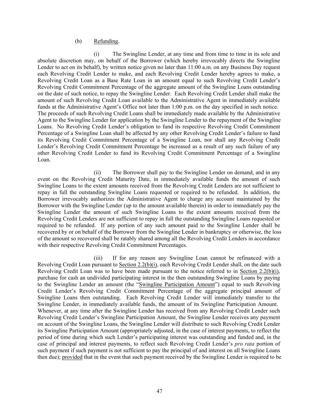 (b) Refunding.(i) The Swingline Lender, at any time and from time to time in its sole andabsolute discretion may, on behalf of the Borrower (which hereby irrevocably directs the SwinglineLender to act on its behalf), by written notice given no later than 11:00 a.m. on any Business Day requesteach Revolving Credit Lender to make, and each Revolving Credit Lender hereby agrees to make, aRevolving Credit Loan as a Base Rate Loan in an amount equal to such Revolving Credit Lender’sRevolving Credit Commitment Percentage of the aggregate amount of the Swingline Loans outstandingon the date of such notice, to repay the Swingline Lender. Each Revolving Credit Lender shall make theamount of such Revolving Credit Loan available to the Administrative Agent in immediately availablefunds at the Administrative Agent’s Office not later than 1:00 p.m. on the day specified in such notice.The proceeds of such Revolving Credit Loans shall be immediately made available by the AdministrativeAgent to the Swingline Lender for application by the Swingline Lender to the repayment of the SwinglineLoans. No Revolving Credit Lender’s obligation to fund its respective Revolving Credit CommitmentPercentage of a Swingline Loan shall be affected by any other Revolving Credit Lender’s failure to fundits Revolving Credit Commitment Percentage of a Swingline Loan, nor shall any Revolving CreditLender’s Revolving Credit Commitment Percentage be increased as a result of any such failure of anyother Revolving Credit Lender to fund its Revolving Credit Commitment Percentage of a SwinglineLoan. (ii) The Borrower shall pay to the Swingline Lender on demand, and in anyevent on the Revolving Credit Maturity Date, in immediately available funds the amount of suchSwingline Loans to the extent amounts received from the Revolving Credit Lenders are not sufficient torepay in full the outstanding Swingline Loans requested or required to be refunded. In addition, theBorrower irrevocably authorizes the Administrative Agent to charge any account maintained by theBorrower with the Swingline Lender (up to the amount available therein) in order to immediately pay theSwingline Lender the amount of such Swingline Loans to the extent amounts received from theRevolving Credit Lenders are not sufficient to repay in full the outstanding Swingline Loans requested orrequired to be refunded. If any portion of any such amount paid to the Swingline Lender shall berecovered by or on behalf of the Borrower from the Swingline Lender in bankruptcy or otherwise, the lossof the amount so recovered shall be ratably shared among all the Revolving Credit Lenders in accordancewith their respective Revolving Credit Commitment Percentages.(iii) If for any reason any Swingline Loan cannot be refinanced with aRevolving Credit Loan pursuant to Section 2.2(b)(i), each Revolving Credit Lender shall, on the date suchRevolving Credit Loan was to have been made pursuant to the notice referred to in Section 2.2(b)(i),purchase for cash an undivided participating interest in the then outstanding Swingline Loans by payingto the Swingline Lender an amount (the “Swingline Participation Amount”) equal to such RevolvingCredit Lender’s Revolving Credit Commitment Percentage of the aggregate principal amount ofSwingline Loans then outstanding. Each Revolving Credit Lender will immediately transfer to theSwingline Lender, in immediately available funds, the amount of its Swingline Participation Amount.Whenever, at any time after the Swingline Lender has received from any Revolving Credit Lender suchRevolving Credit Lender’s Swingline Participation Amount, the Swingline Lender receives any paymenton account of the Swingline Loans, the Swingline Lender will distribute to such Revolving Credit Lenderits Swingline Participation Amount (appropriately adjusted, in the case of interest payments, to reflect theperiod of time during which such Lender’s participating interest was outstanding and funded and, in thecase of principal and interest payments, to reflect such Revolving Credit Lender’s pro rata portion ofsuch payment if such payment is not sufficient to pay the principal of and interest on all Swingline Loansthen due); provided that in the event that such payment received by the Swingline Lender is required to be47