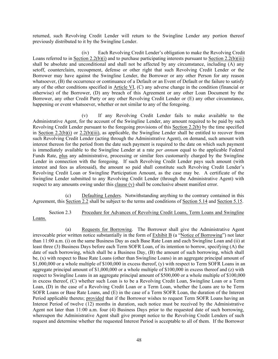 returned, such Revolving Credit Lender will return to the Swingline Lender any portion thereofpreviously distributed to it by the Swingline Lender.(iv) Each Revolving Credit Lender’s obligation to make the Revolving CreditLoans referred to in Section 2.2(b)(i) and to purchase participating interests pursuant to Section 2.2(b)(iii)shall be absolute and unconditional and shall not be affected by any circumstance, including (A) anysetoff, counterclaim, recoupment, defense or other right that such Revolving Credit Lender or theBorrower may have against the Swingline Lender, the Borrower or any other Person for any reasonwhatsoever, (B) the occurrence or continuance of a Default or an Event of Default or the failure to satisfyany of the other conditions specified in Article VI, (C) any adverse change in the condition (financial orotherwise) of the Borrower, (D) any breach of this Agreement or any other Loan Document by theBorrower, any other Credit Party or any other Revolving Credit Lender or (E) any other circumstance,happening or event whatsoever, whether or not similar to any of the foregoing.(v) If any Revolving Credit Lender fails to make available to theAdministrative Agent, for the account of the Swingline Lender, any amount required to be paid by suchRevolving Credit Lender pursuant to the foregoing provisions of this Section 2.2(b) by the time specifiedin Section 2.2(b)(i) or 2.2(b)(iii), as applicable, the Swingline Lender shall be entitled to recover fromsuch Revolving Credit Lender (acting through the Administrative Agent), on demand, such amount withinterest thereon for the period from the date such payment is required to the date on which such paymentis immediately available to the Swingline Lender at a rate per annum equal to the applicable FederalFunds Rate, plus any administrative, processing or similar fees customarily charged by the SwinglineLender in connection with the foregoing. If such Revolving Credit Lender pays such amount (withinterest and fees as aforesaid), the amount so paid shall constitute such Revolving Credit Lender’sRevolving Credit Loan or Swingline Participation Amount, as the case may be. A certificate of theSwingline Lender submitted to any Revolving Credit Lender (through the Administrative Agent) withrespect to any amounts owing under this clause (v) shall be conclusive absent manifest error.(c) Defaulting Lenders. Notwithstanding anything to the contrary contained in thisAgreement, this Section 2.2 shall be subject to the terms and conditions of Section 5.14 and Section 5.15.Section 2.3 Procedure for Advances of Revolving Credit Loans, Term Loans and SwinglineLoans. (a) Requests for Borrowing. The Borrower shall give the Administrative Agentirrevocable prior written notice substantially in the form of Exhibit B (a “Notice of Borrowing”) not laterthan 11:00 a.m. (i) on the same Business Day as each Base Rate Loan and each Swingline Loan and (ii) atleast three (3) Business Days before each Term SOFR Loan, of its intention to borrow, specifying (A) thedate of such borrowing, which shall be a Business Day, (B) the amount of such borrowing, which shallbe, (x) with respect to Base Rate Loans (other than Swingline Loans) in an aggregate principal amount of$1,000,000 or a whole multiple of $100,000 in excess thereof, (y) with respect to Term SOFR Loans in anaggregate principal amount of $1,000,000 or a whole multiple of $100,000 in excess thereof and (z) withrespect to Swingline Loans in an aggregate principal amount of $500,000 or a whole multiple of $100,000in excess thereof, (C) whether such Loan is to be a Revolving Credit Loan, Swingline Loan or a TermLoan, (D) in the case of a Revolving Credit Loan or a Term Loan, whether the Loans are to be TermSOFR Loans or Base Rate Loans, and (E) in the case of a Term SOFR Loan, the duration of the InterestPeriod applicable thereto; provided that if the Borrower wishes to request Term SOFR Loans having anInterest Period of twelve (12) months in duration, such notice must be received by the AdministrativeAgent not later than 11:00 a.m. four (4) Business Days prior to the requested date of such borrowing,whereupon the Administrative Agent shall give prompt notice to the Revolving Credit Lenders of suchrequest and determine whether the requested Interest Period is acceptable to all of them. If the Borrower48